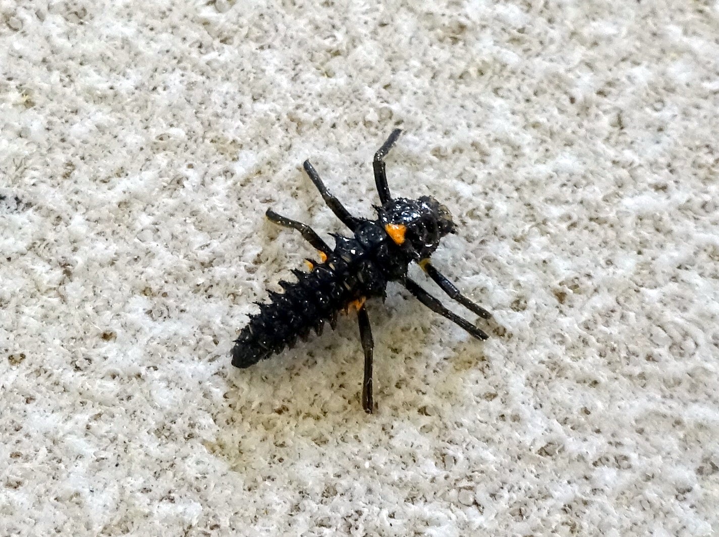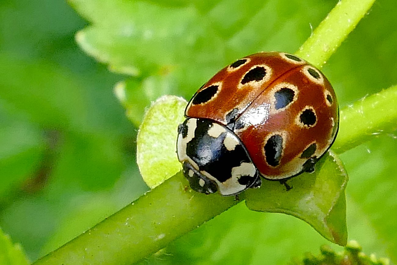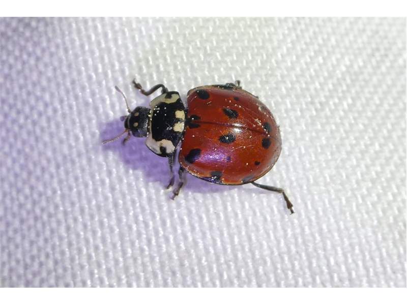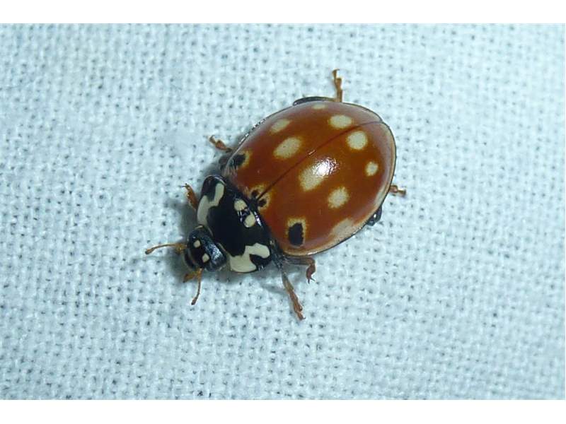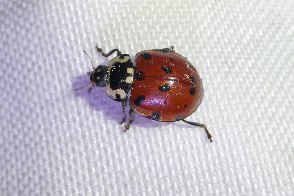 Ähnliche Arten: Individuen mit schwarzen Punkten, die nicht hell umrandet sind, ähneln der Variante 1 des Asiatischen Marienkäfers (Harmonia axyridis), deren Halsschild seitlich jedoch vollständig weiß ist.
