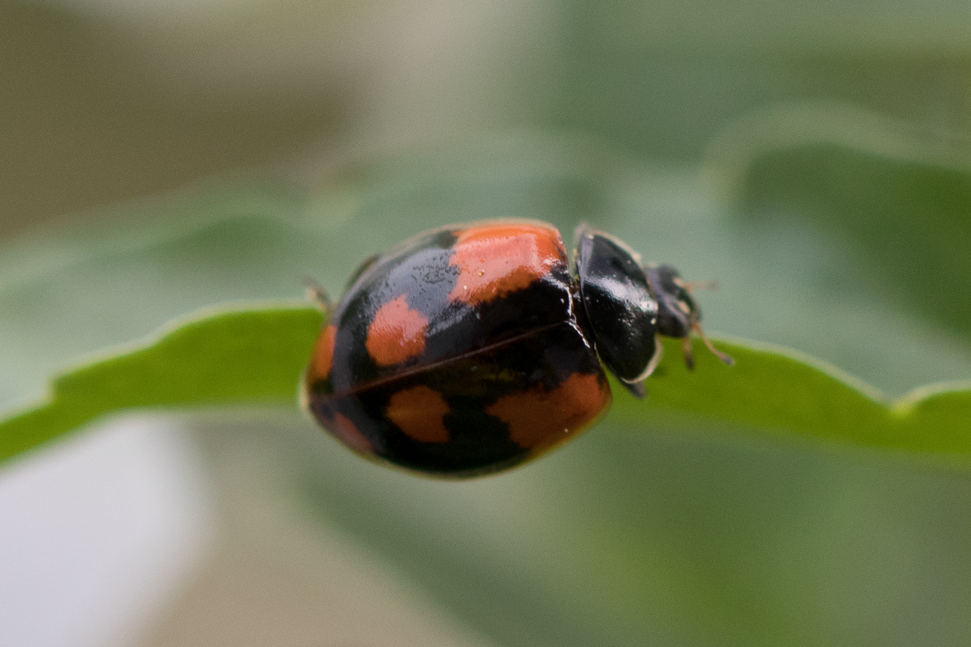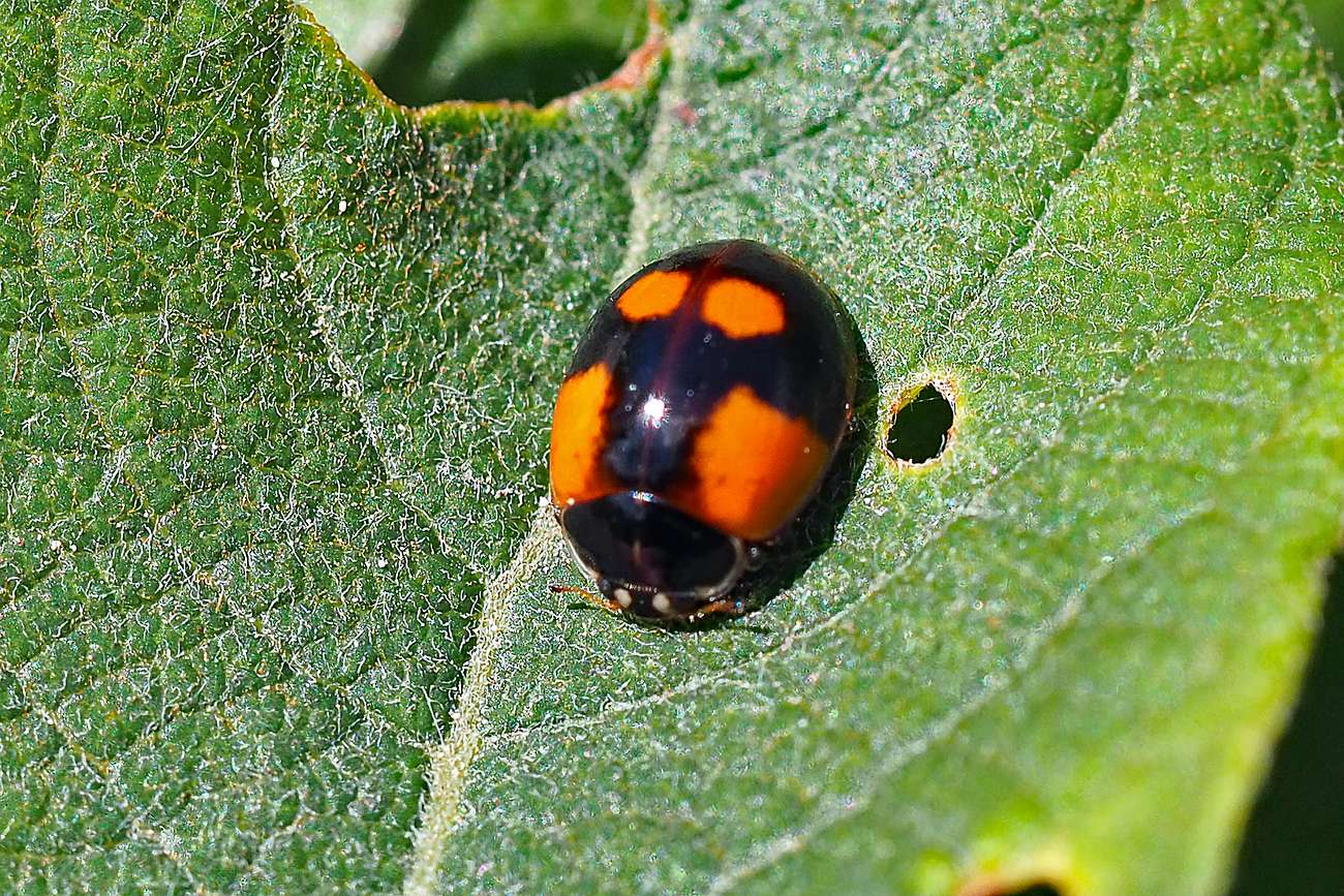 Variante 2 (25%): Kopf und Halsschild vollständig schwarz; Flügeldecken schwarz mit jeweils zwei bis drei orangeroten Flecken.