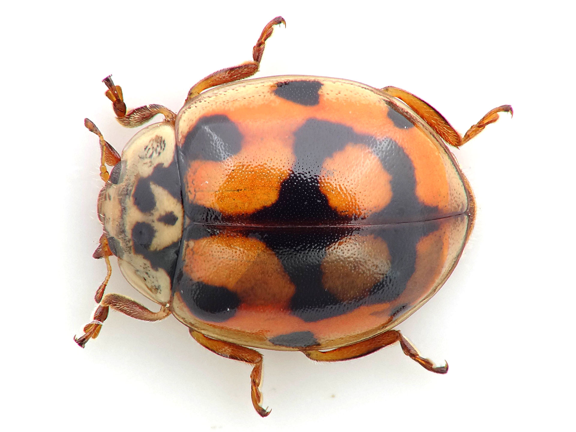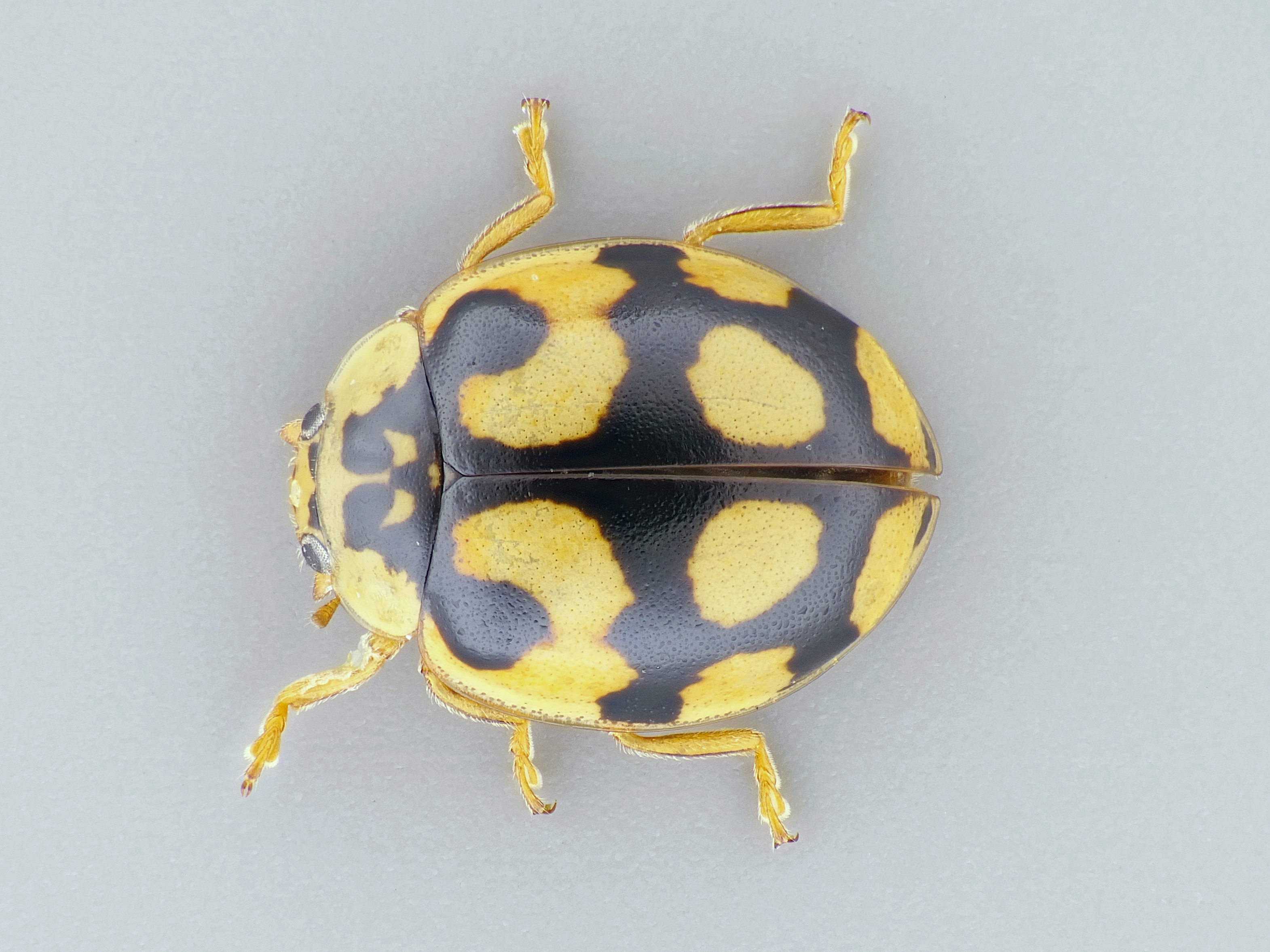 Variante 1: Halsschild weiß, vor dem Hinterrand ein Halbkreis aus 4 schwarzen Punkten, darin oft ein fünfter schwarzer Punkt sowie manchmal seitlich je ein schwarzer Fleck; die weiße Färbung kann mehr oder weniger reduziert sein, so dass die schwarzen Flecken größer sind oder die schwarze Färbung überwiegt. Flügeldecken (Elytren) gelb, orange oder rot mit 0–15 schwarzen Punkten, in der Regel 10 schwarze Punkte, die je Flügeldecke in drei Querreihen mit 1-3-1 Punkten angeordnet sind, manchmal die letzte Reihe mit 2 Punkten.