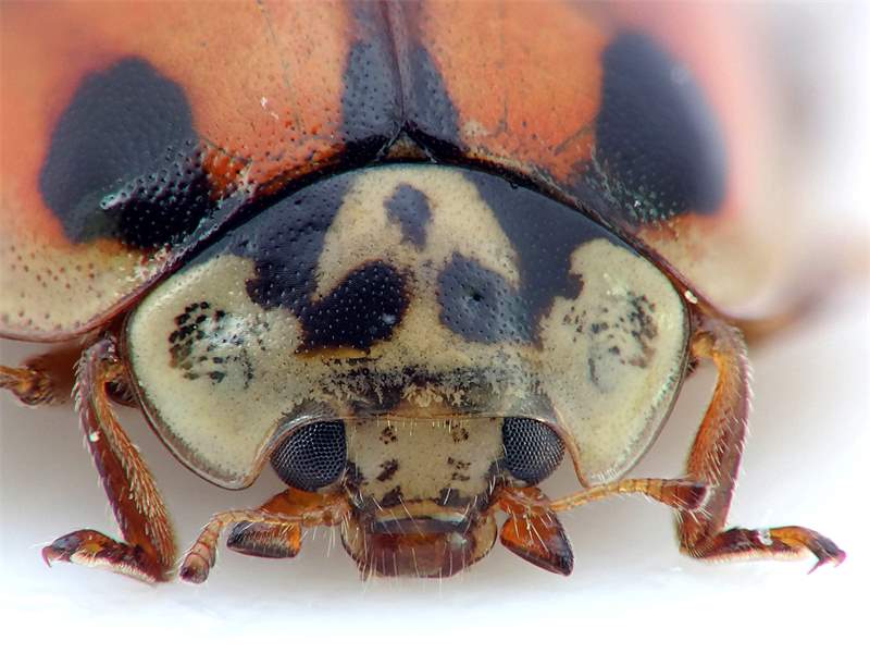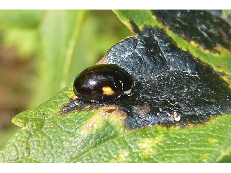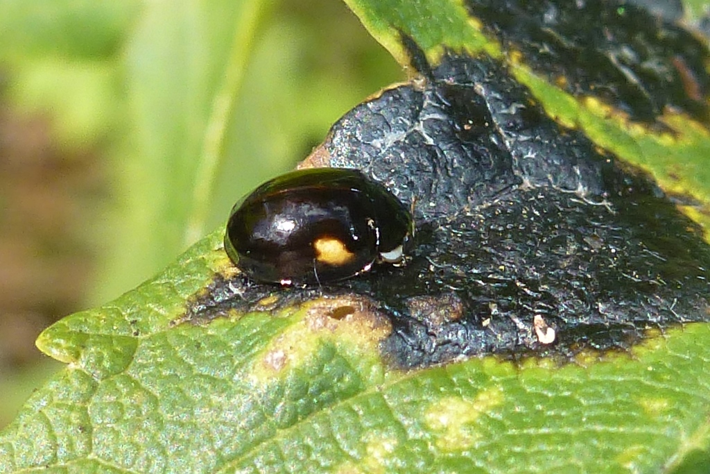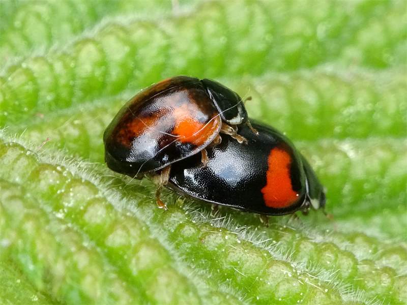 Variante 3: Halsschild schwarz, nur vorn und an den Seiten weiß. Flügeldecken einheitlich schwarz, rot oder braun und vorn ein nierenförmiges, weißes, oranges oder rotes Mal.