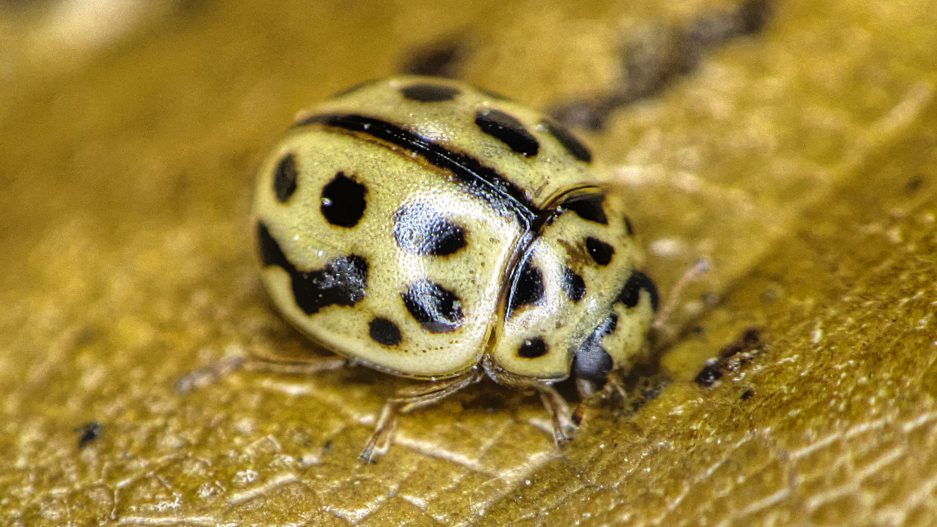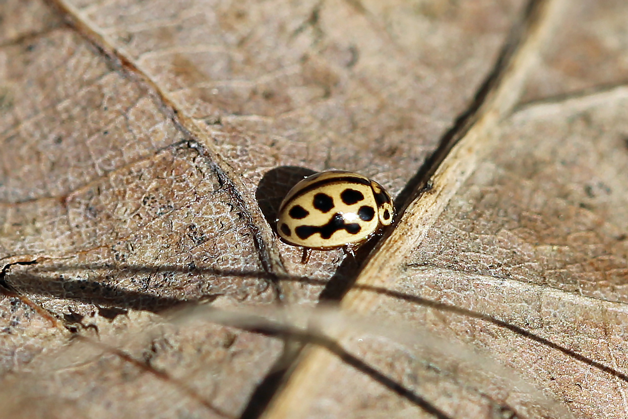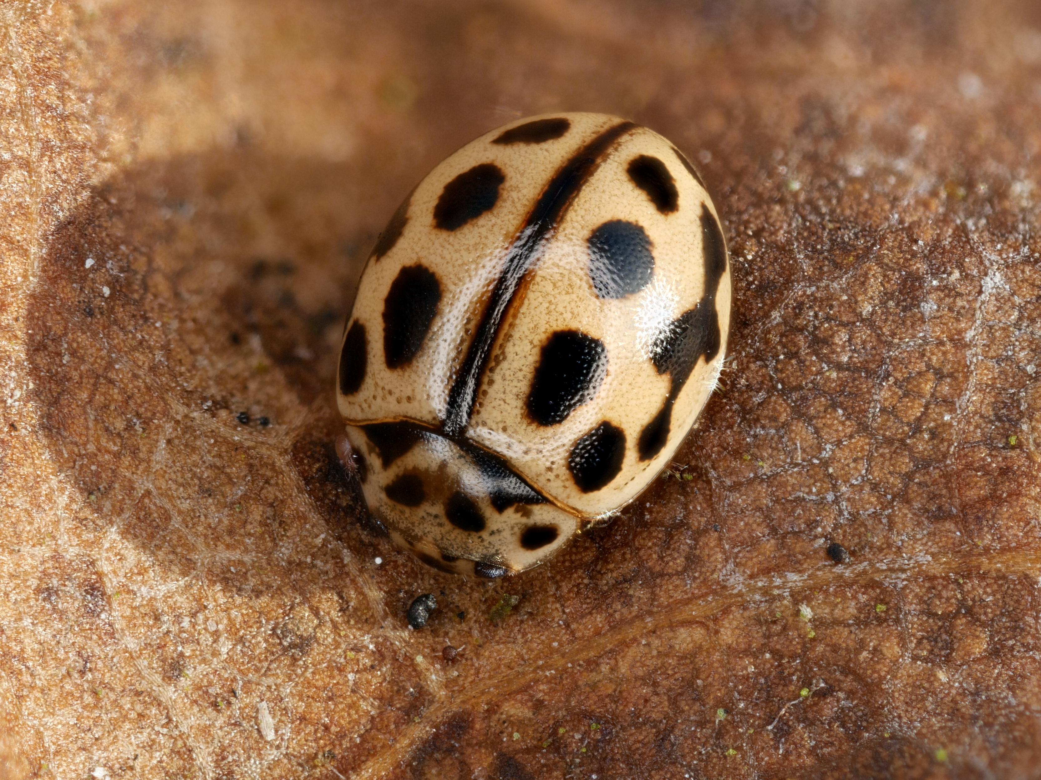 Sechzehnpunkt-Marienkäfer (Tytthaspis sedecimpunctata) auf Ahornblättrige Platane (Platanus × hispanica) im Hahnenholz, Leipzig, November 2013