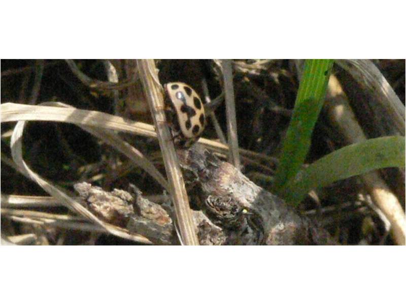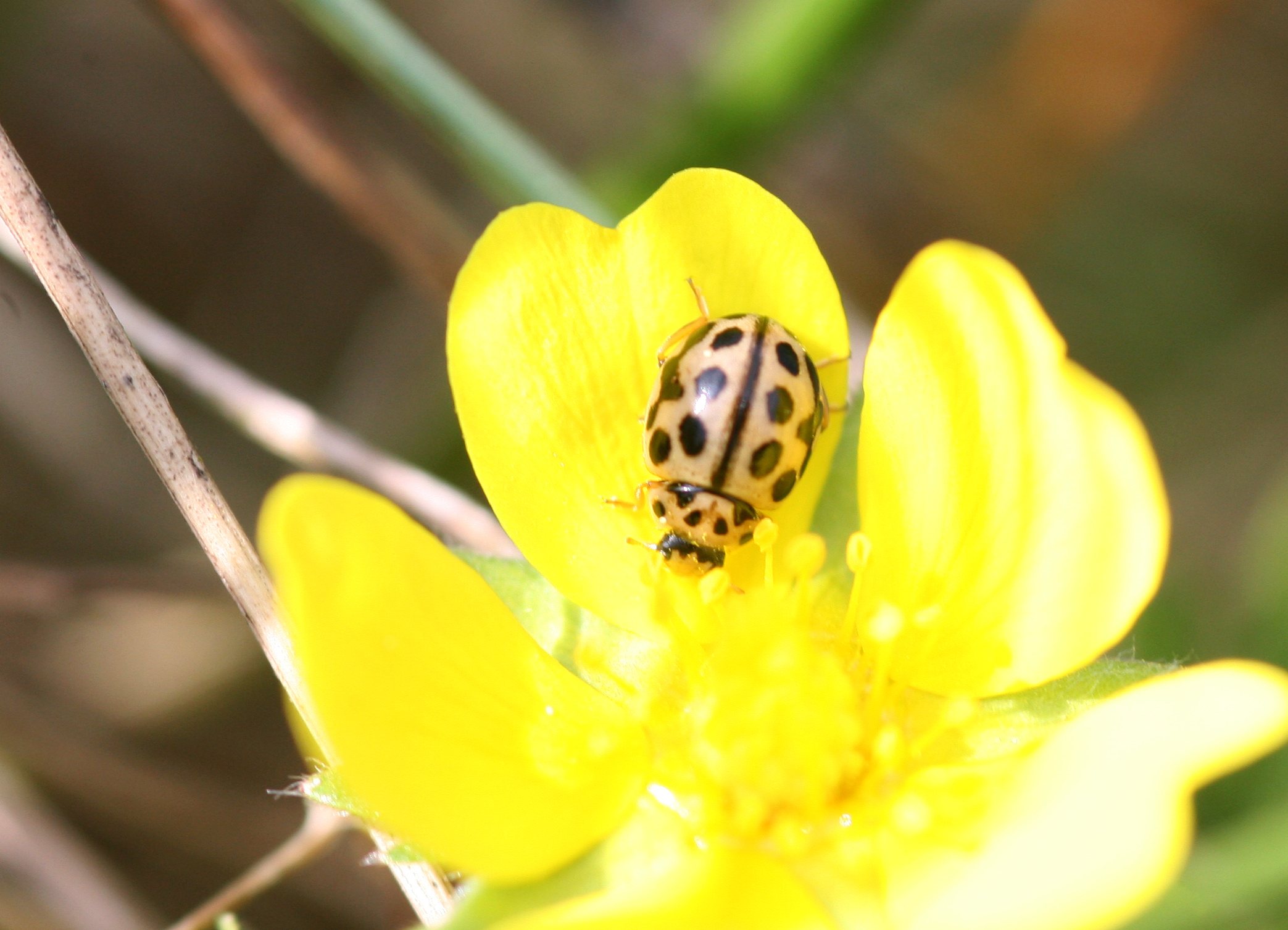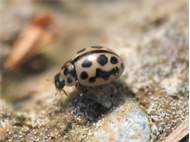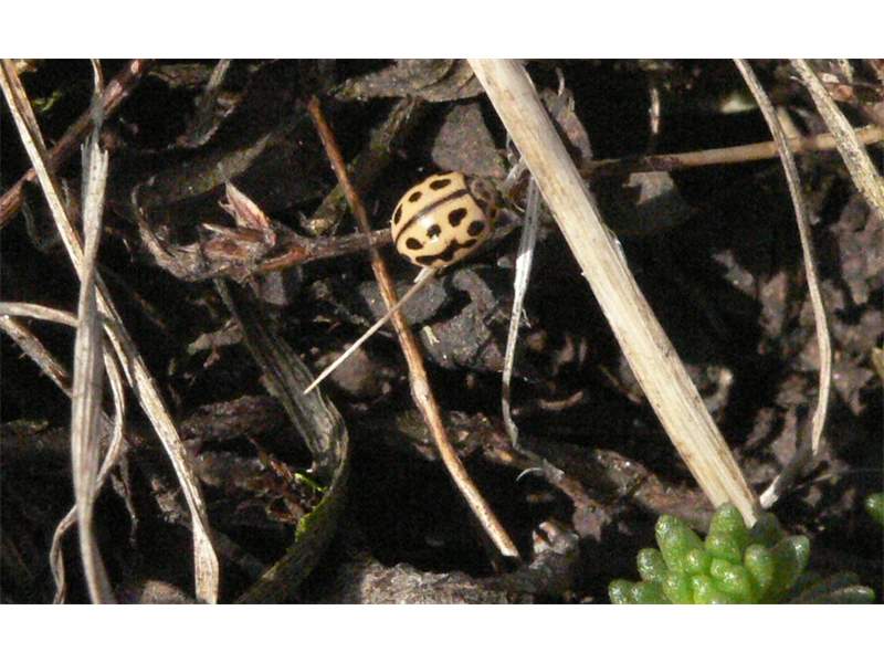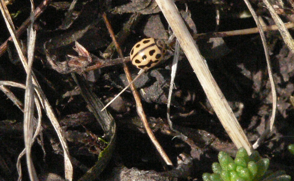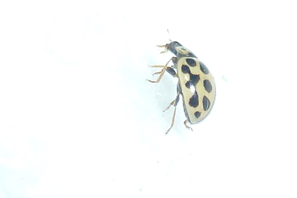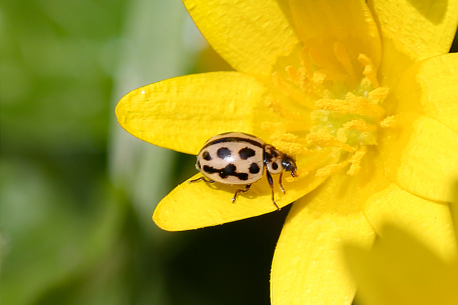 Sechzehnpunkt-Marienkäfer (Tytthaspis sedecimpunctata) in der Gemarkung Hohenprießnitz, Feldrand östlich vom Elsteich, März 2014