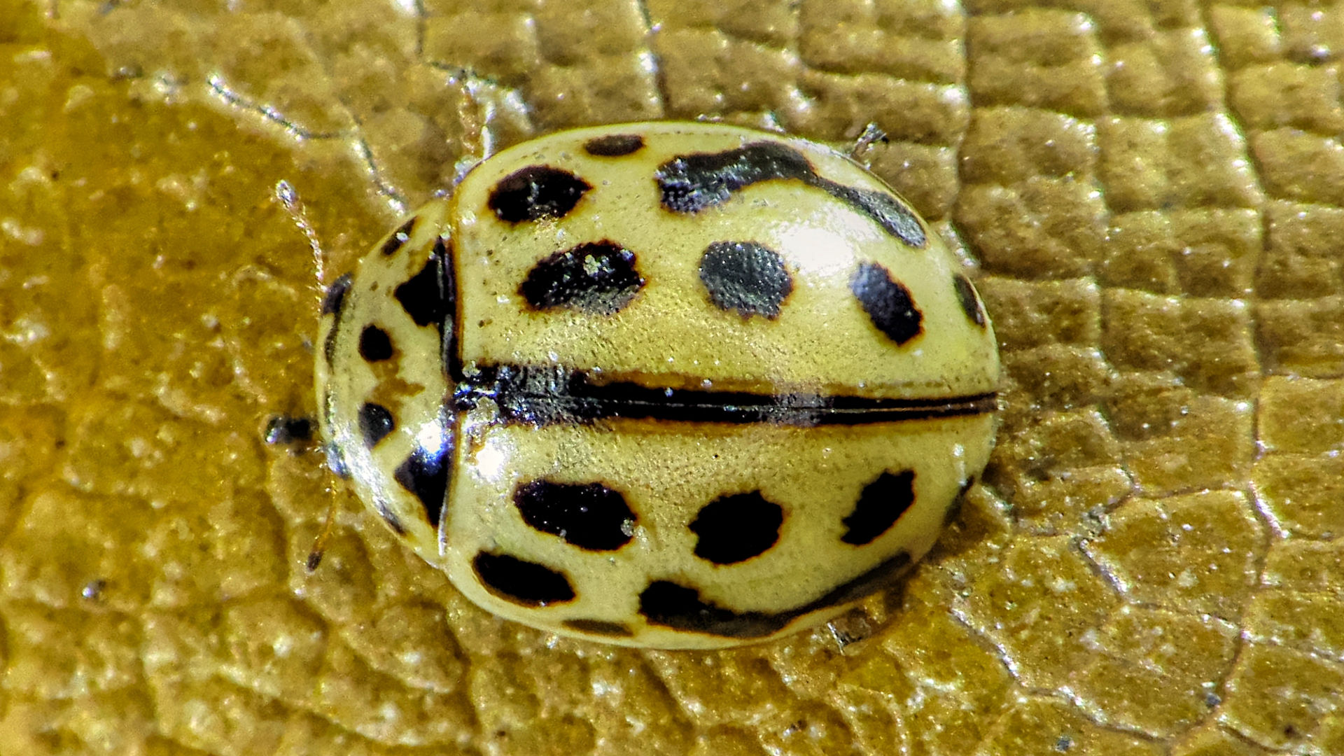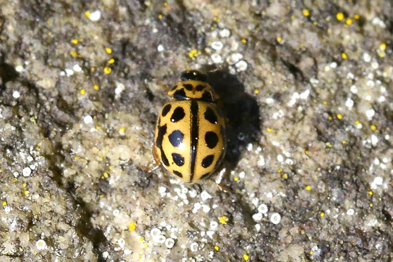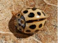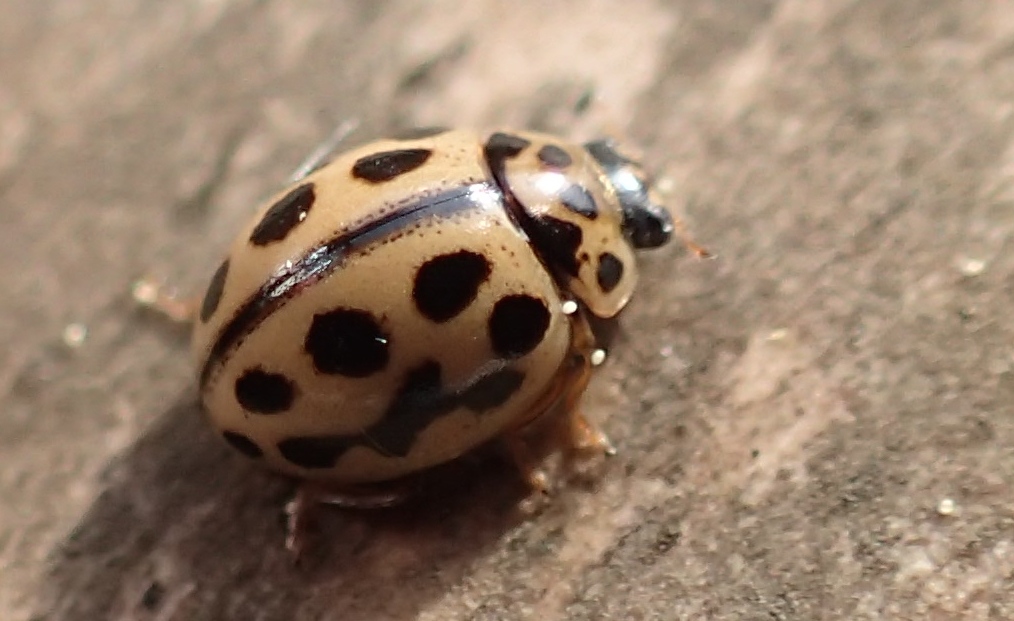 Sechzehnpunkt-Marienkäfer (Tytthaspis sedecimpunctata (Linnaeus, 1758)) im April 2013 bei Großenhain, deutlich ist die schwarze Flügeldeckennaht zu erkennen. Häufig verschmelzen die unteren vier schwarzen Flecke zu einem Band.