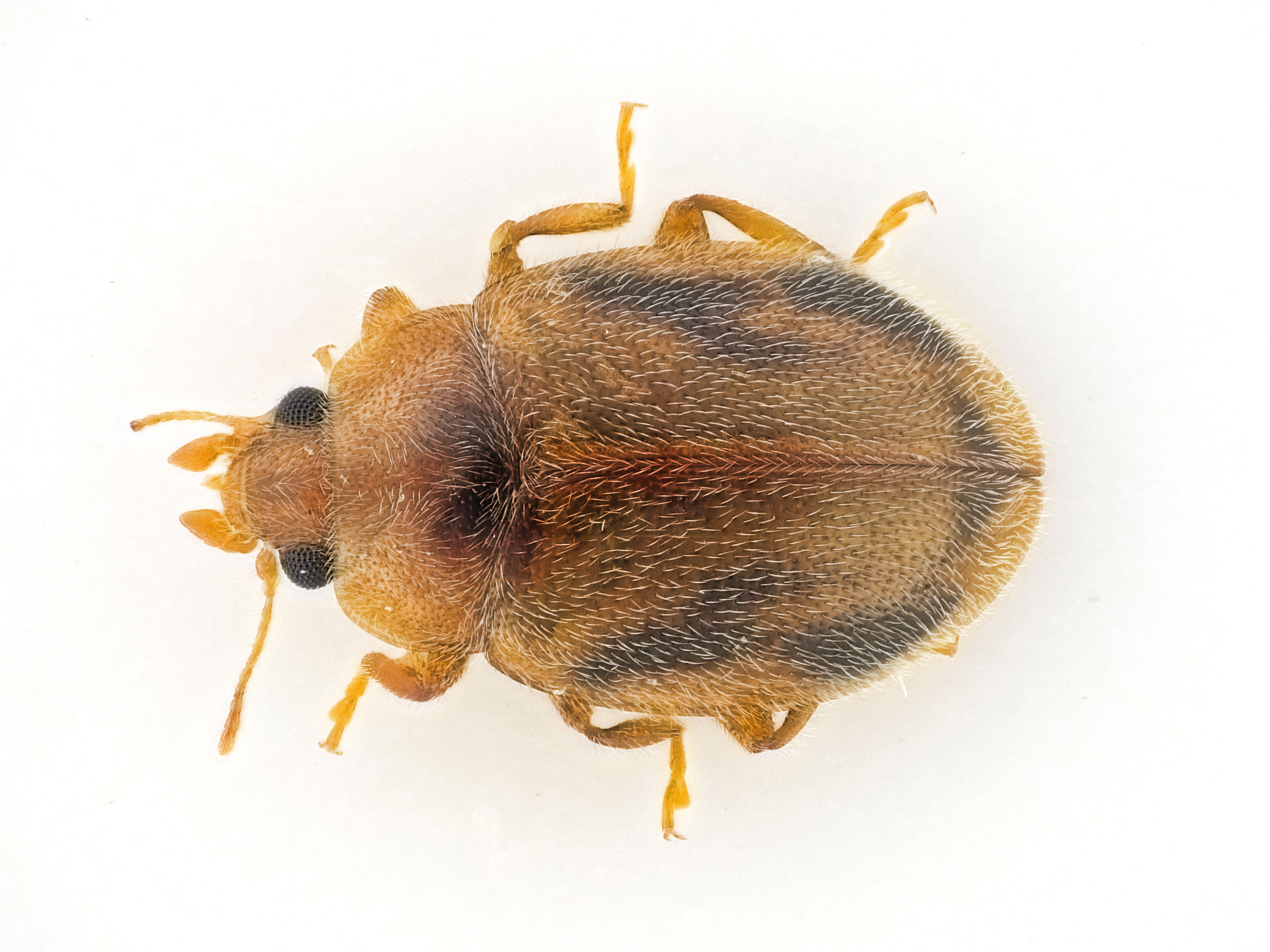 Kopf, Halsschild und Flügeldecken braun, mit kurzen, weißen, haarförmigen Borsten.