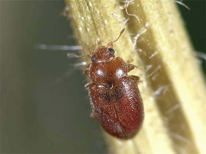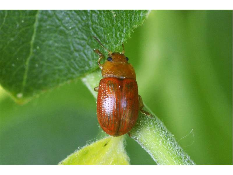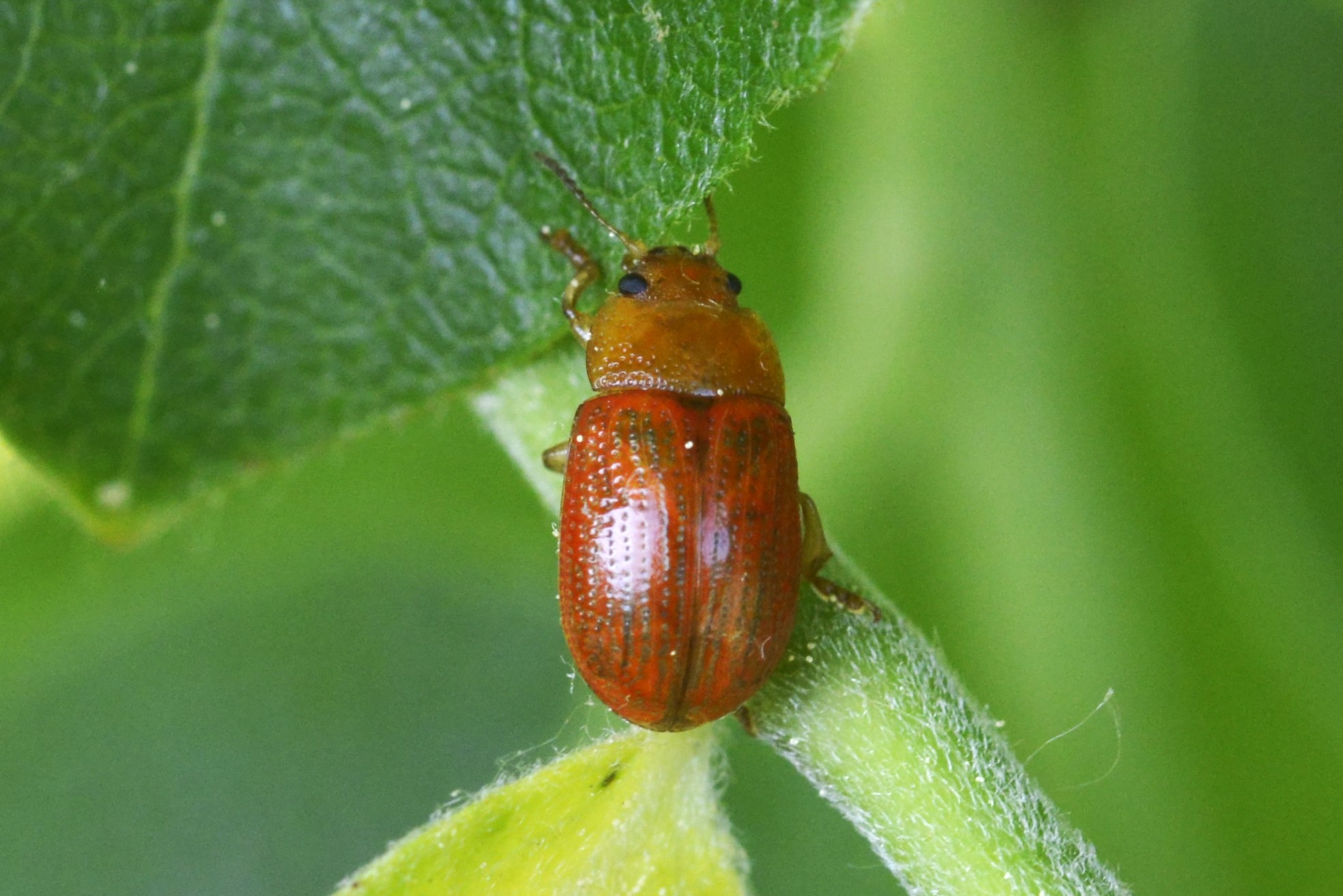 Thorax: Halsschild (Pronotum) rotbraun, punktiert. Flügeldecken (Elytren) rotbraun, punktiert und mit einem schrägen, dunklen Schatten im vorderen Bereich. Beine rotbraun.