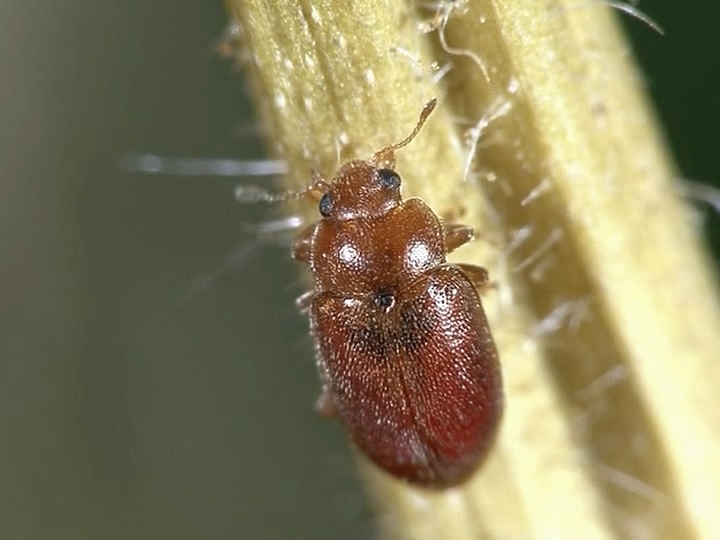 Ähnliche Art: Der Gefleckte Schilf-Marienkäfer (Coccidula scutellata) mit schwarzen Punkten auf den Flügeldecken.
