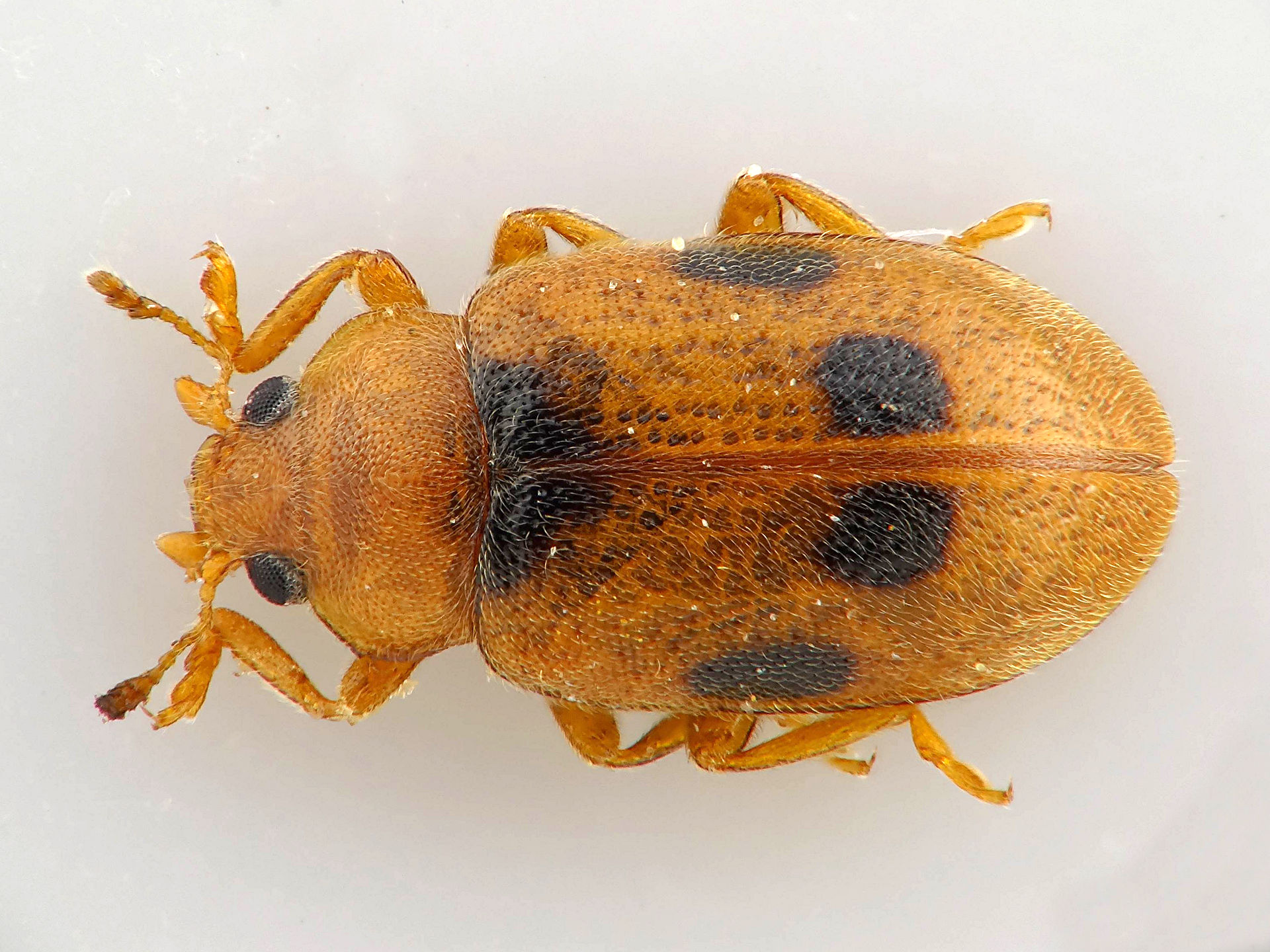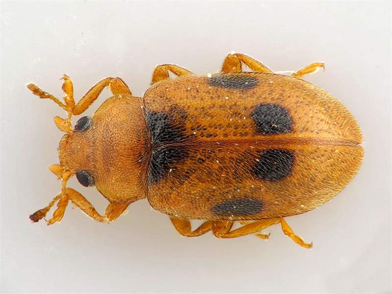 Thorax: Halsschild (Pronotum) rotbraun, punktiert und fein behaart. Flügeldecken (Elytren) rotbraun, punktiert, fein behaart und mit 3 schwarzen Punkten je Flügeldecke. Beine rotbraun.