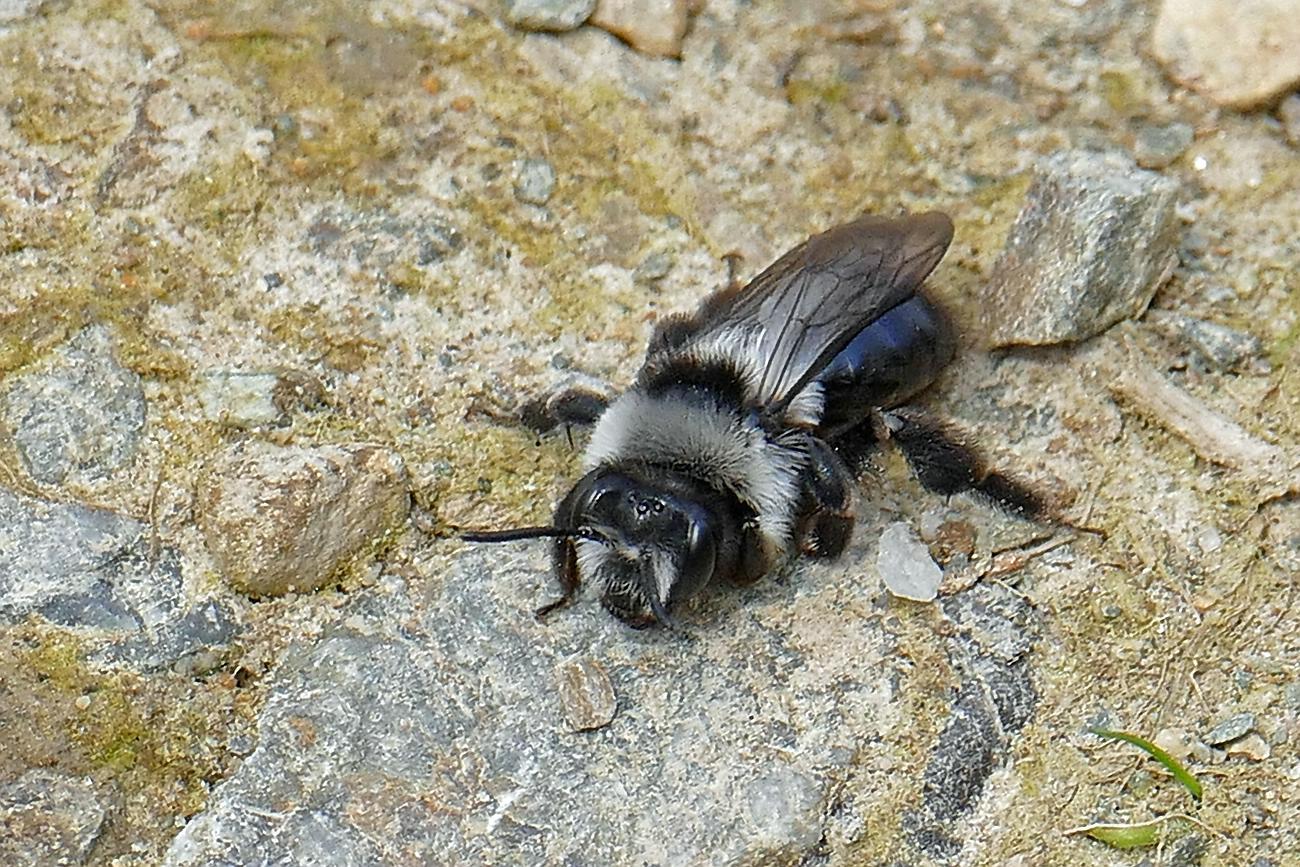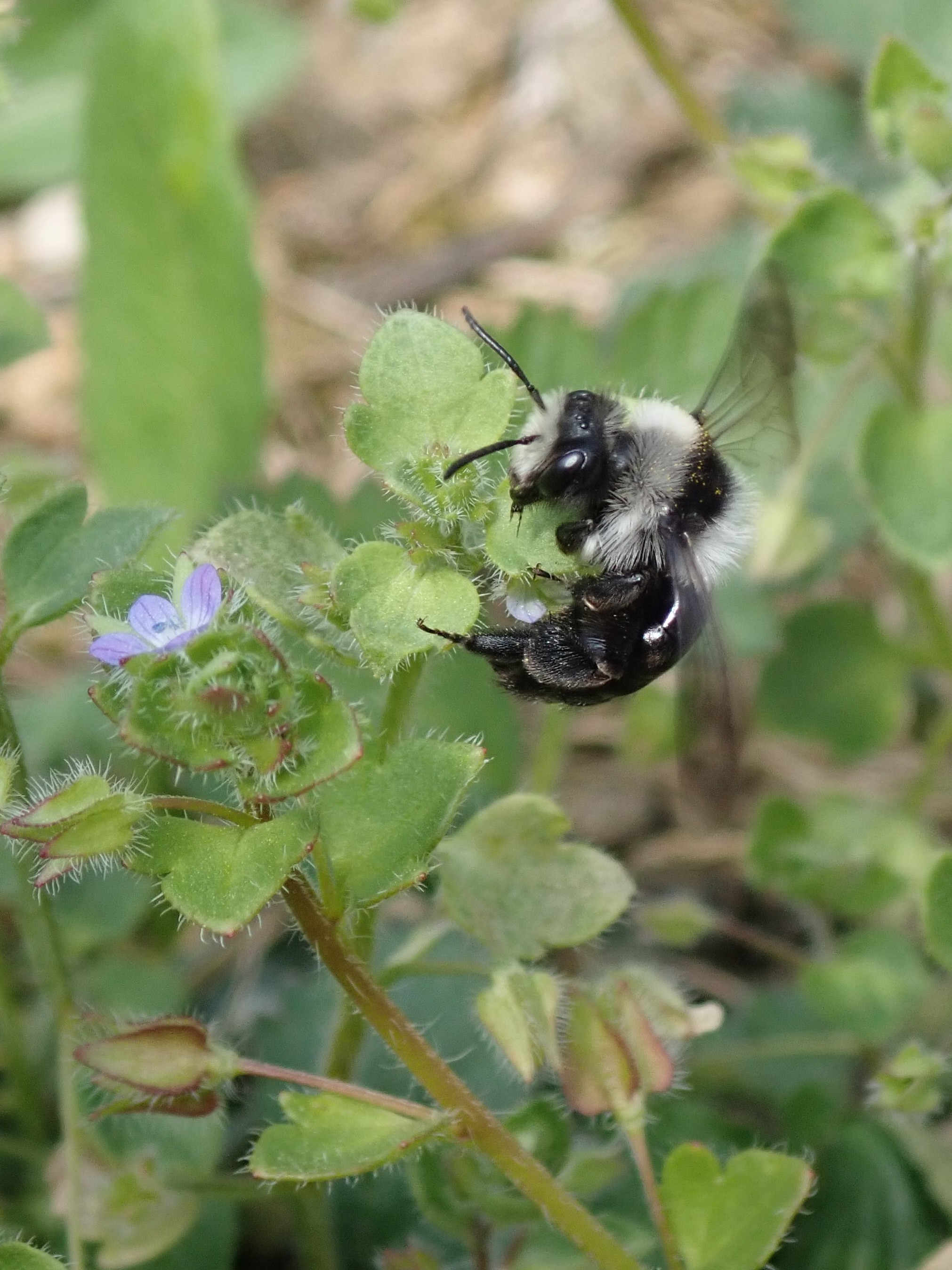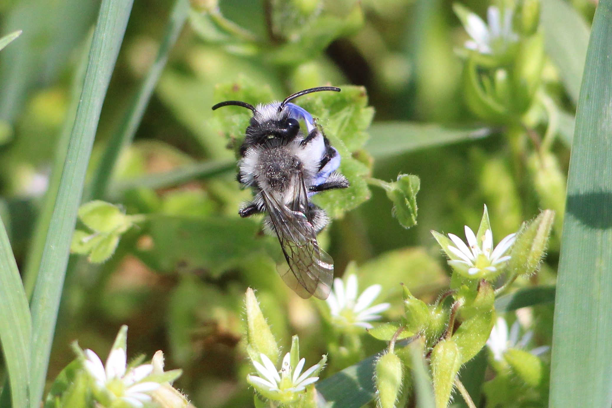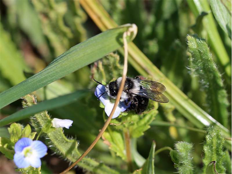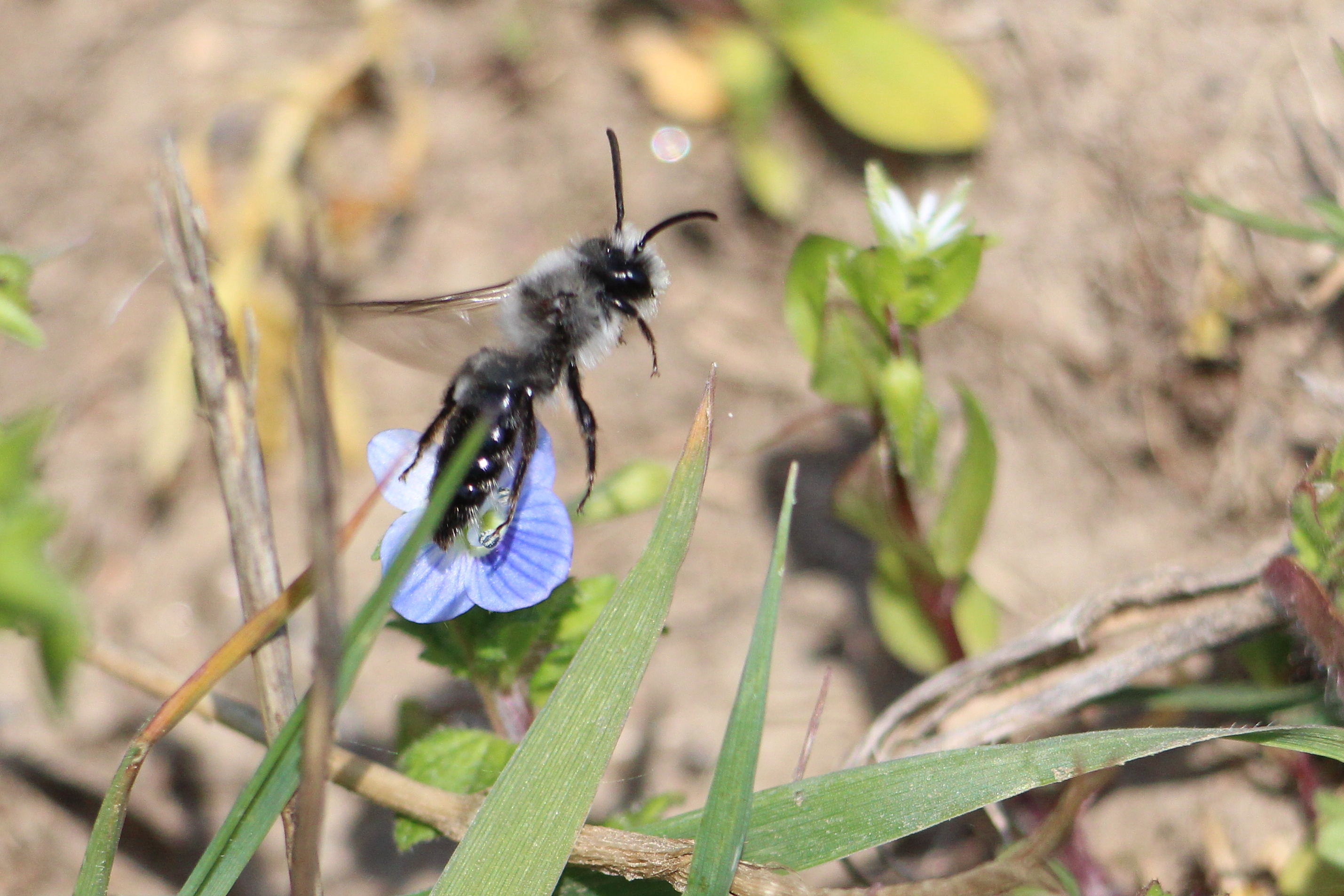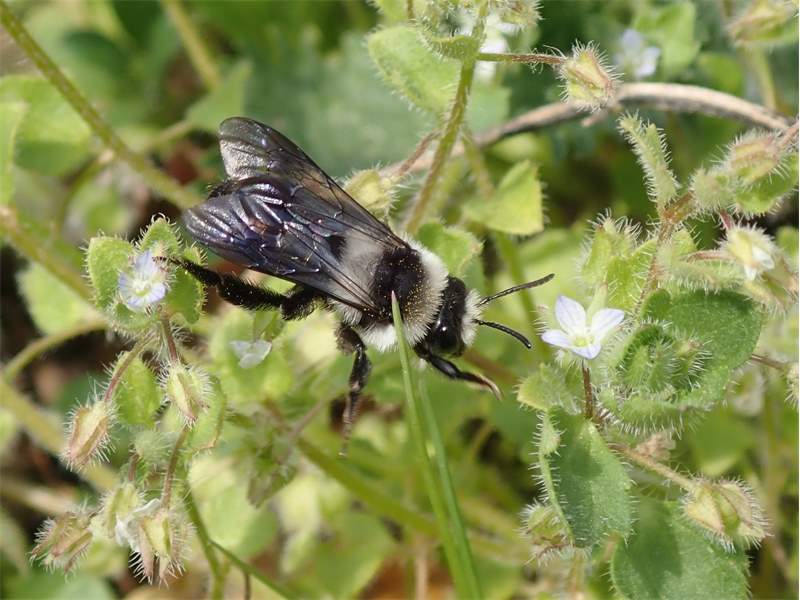 Graue Sandbiene (Andrena cineraria (Linnaeus, 1758)), Weibchen, Blütenbesuch an Efeu-Ehrenpreis (Veronica hederifolia), für die relativ große Biene eine sichtliche Herausforderung, Roßwein OT Gleisberg, April 2020