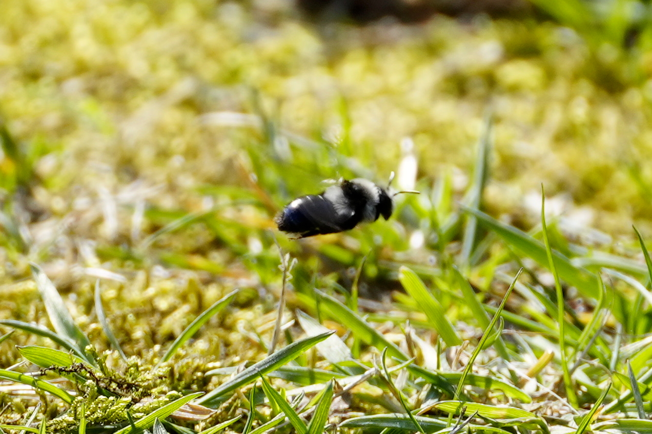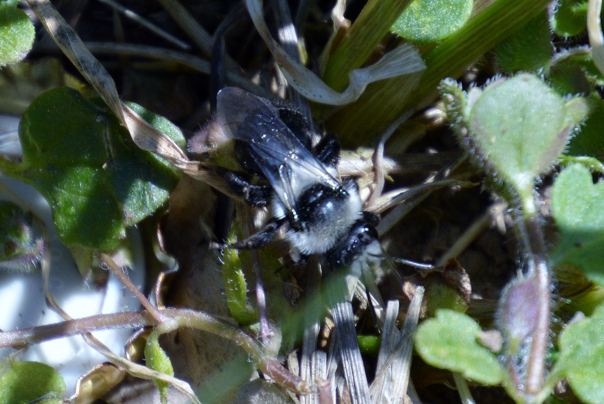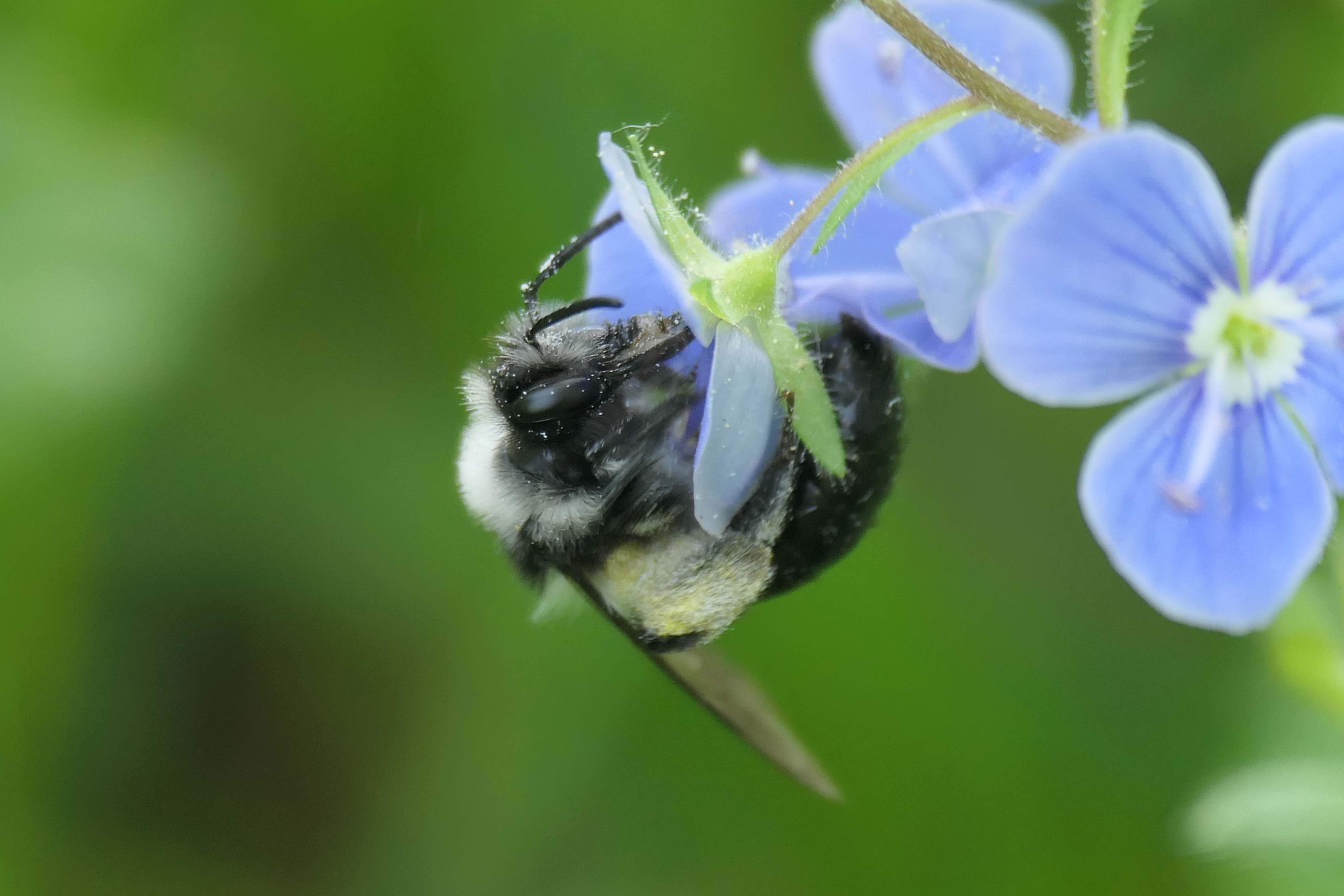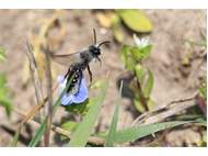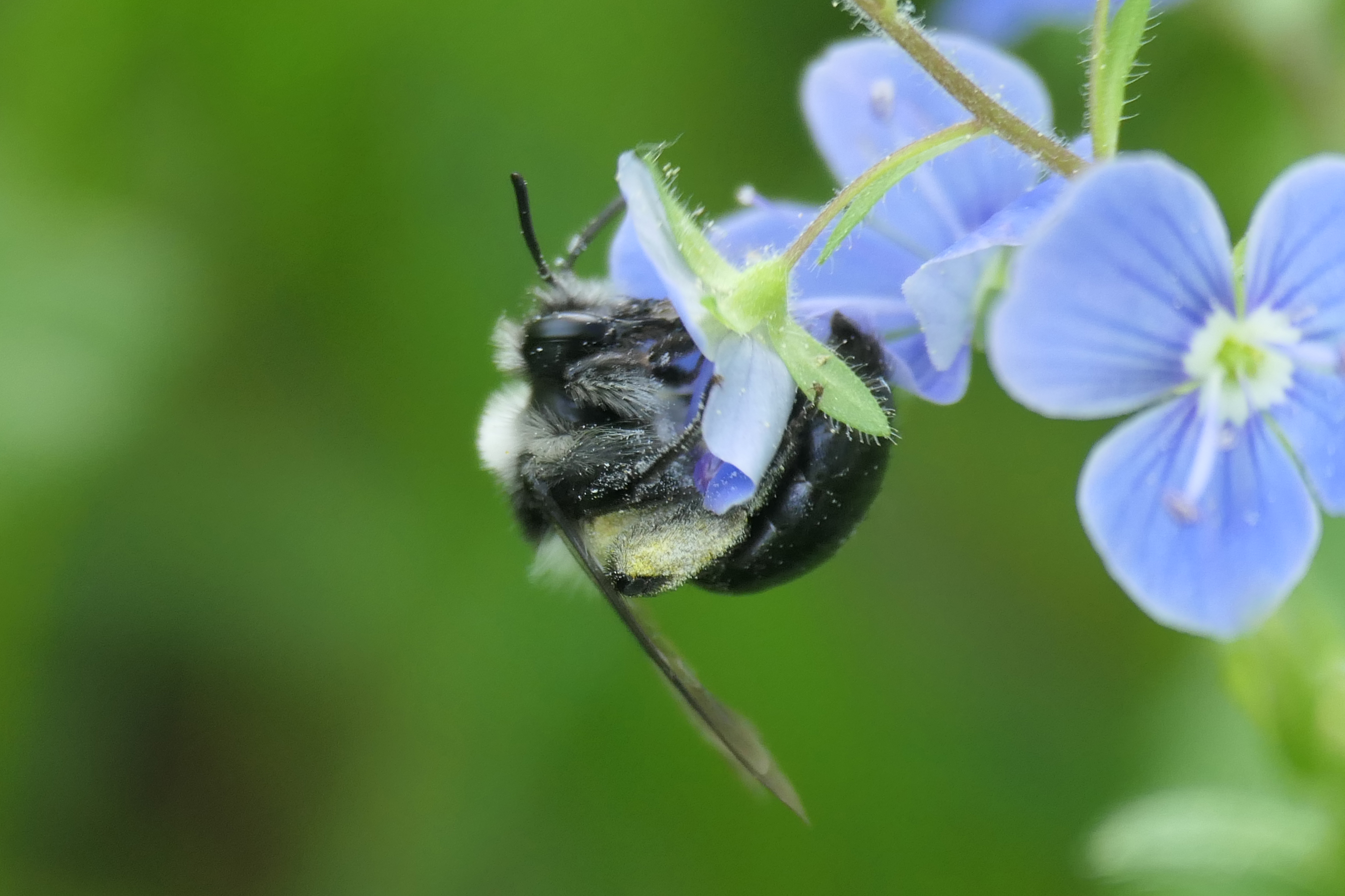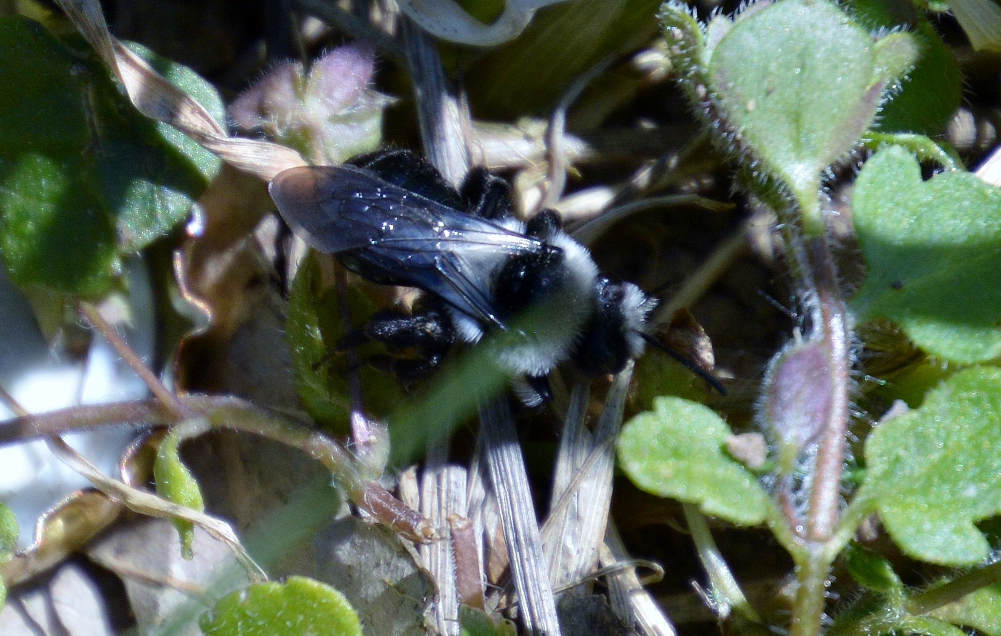 Graue Sandbiene (Andrena cineraria (Linnaeus, 1758)), Weibchen, Blütenbesuch an Efeu-Ehrenpreis (Veronica hederifolia), für die relativ große Biene eine sichtliche Herausforderung, Roßwein OT Gleisberg, April 2020