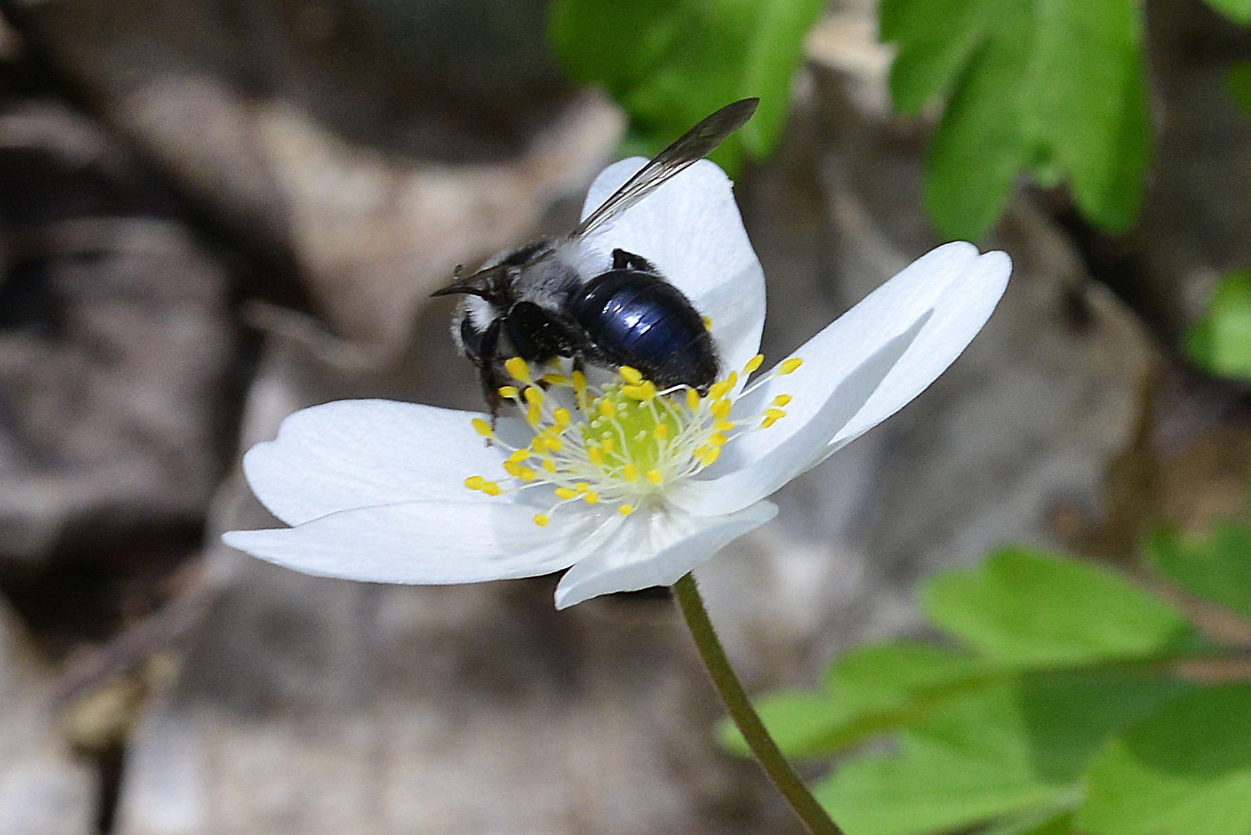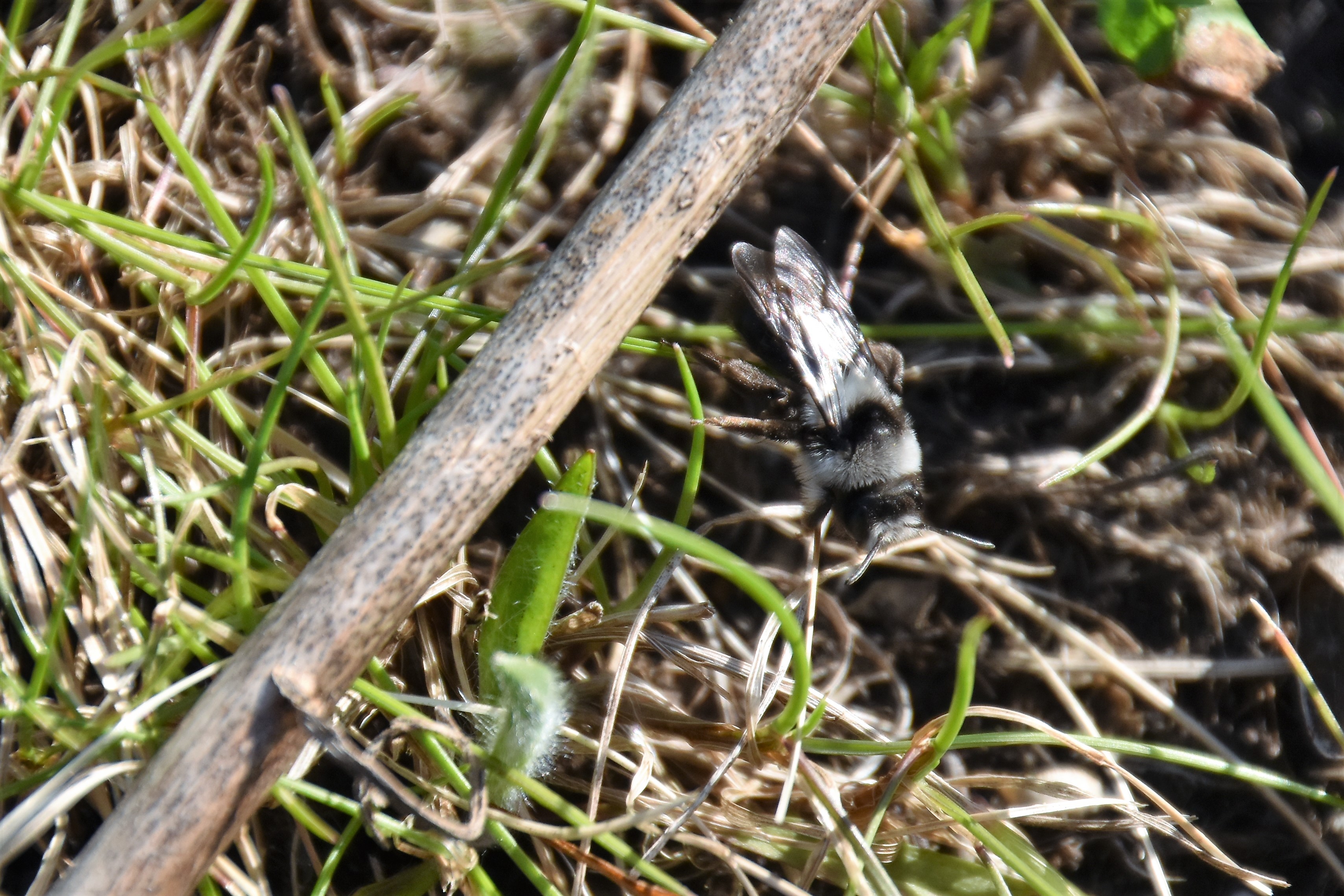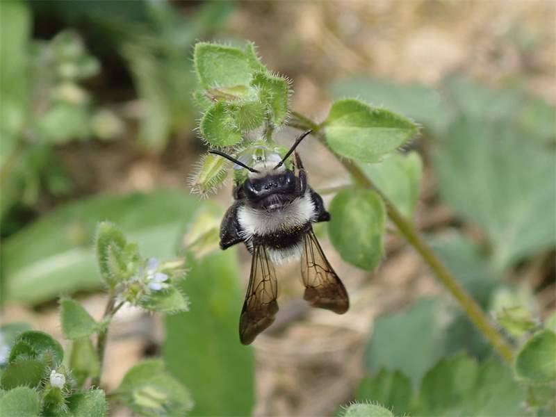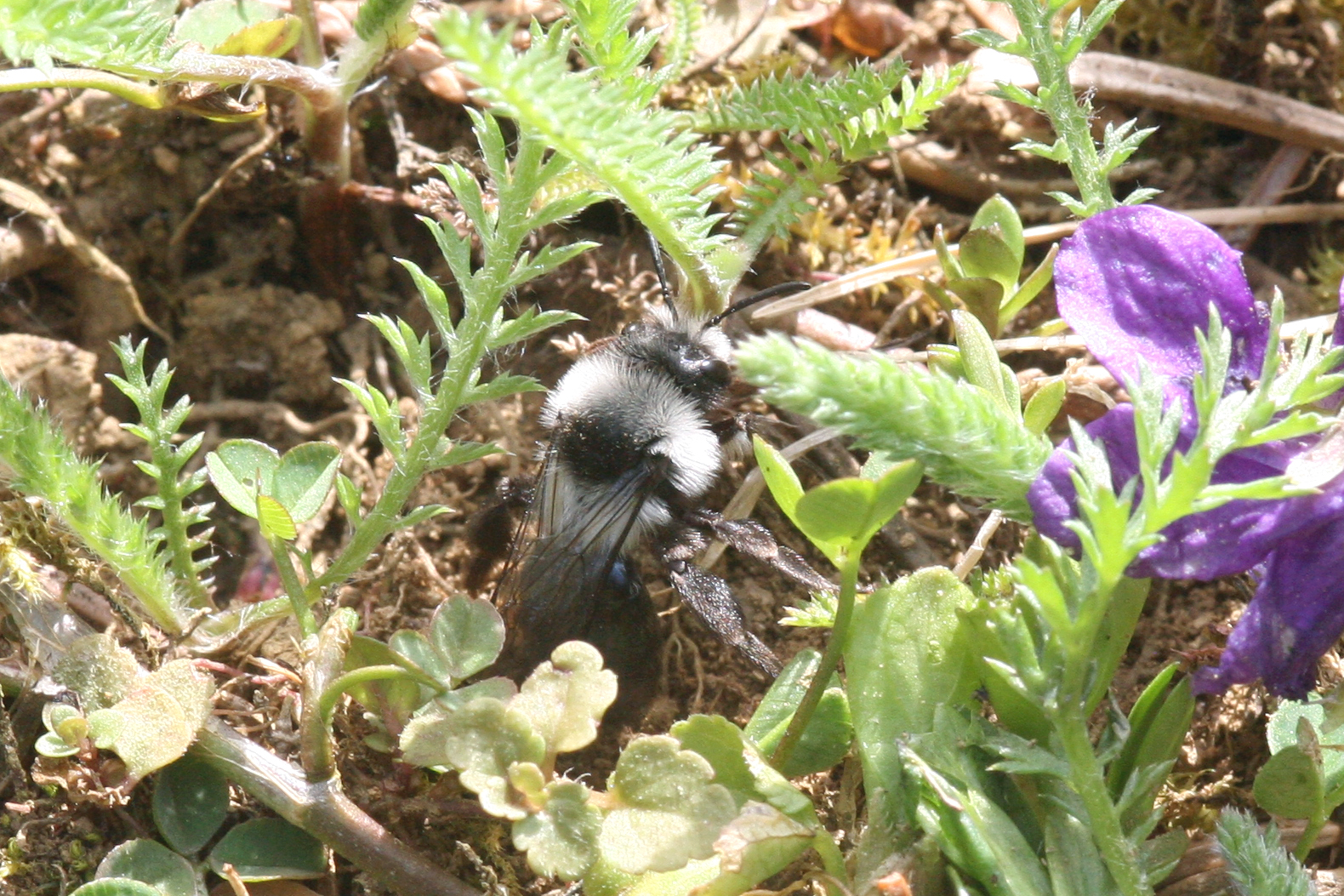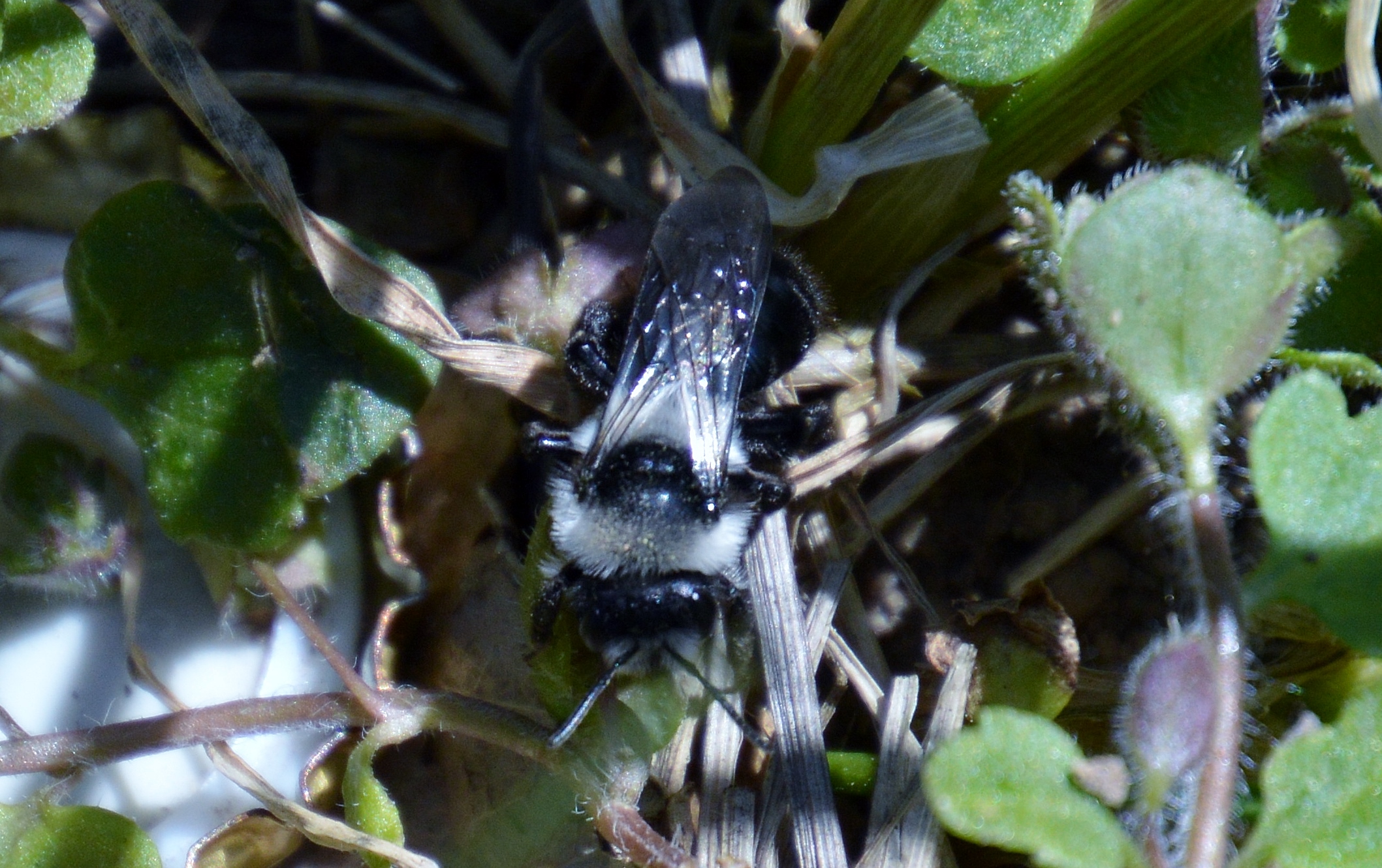 Graue Sandbiene (Andrena cineraria (Linnaeus, 1758)), Weibchen, Blütenbesuch an Efeu-Ehrenpreis (Veronica hederifolia), für die relativ große Biene eine sichtliche Herausforderung, Roßwein OT Gleisberg, April 2020