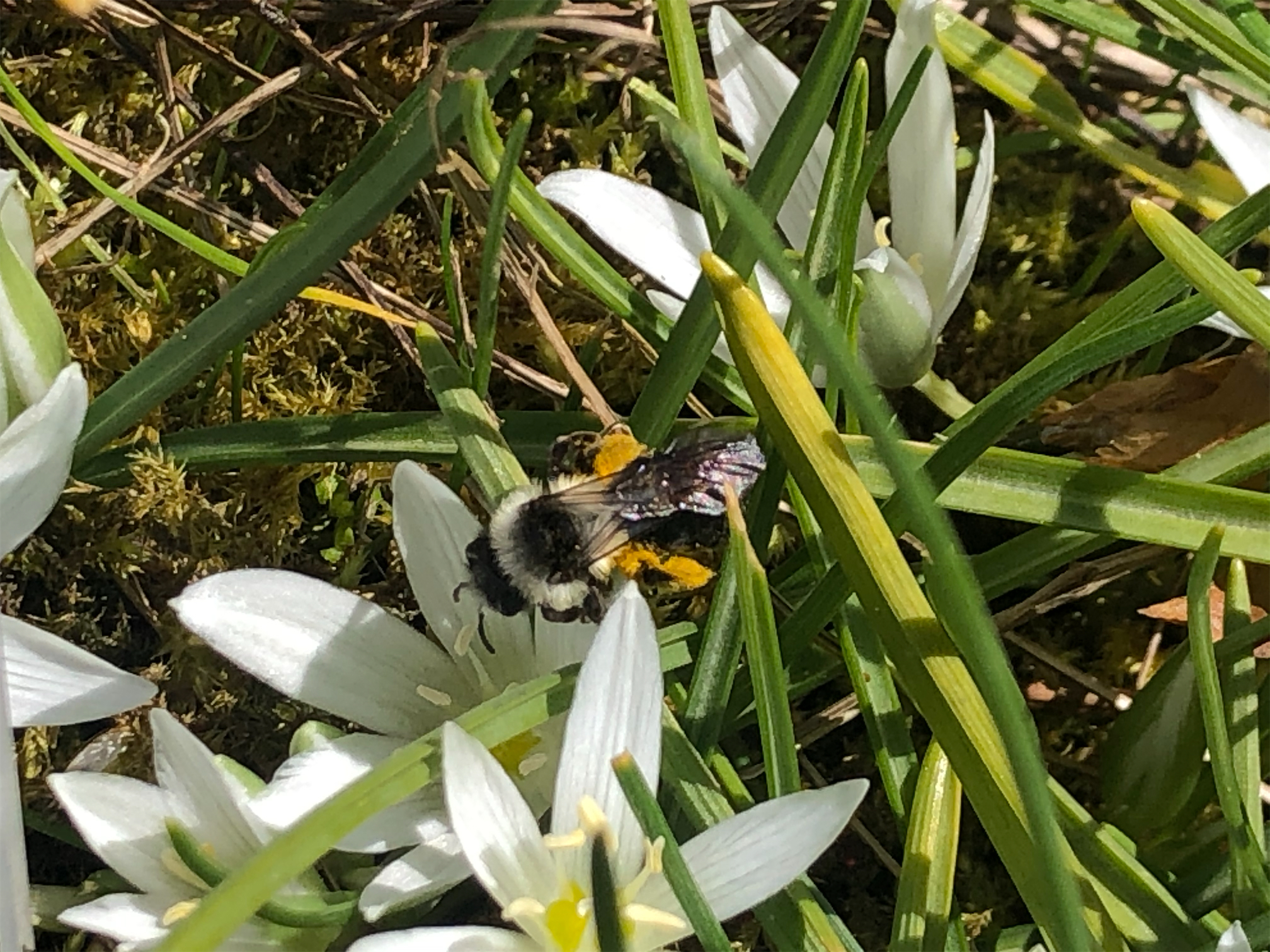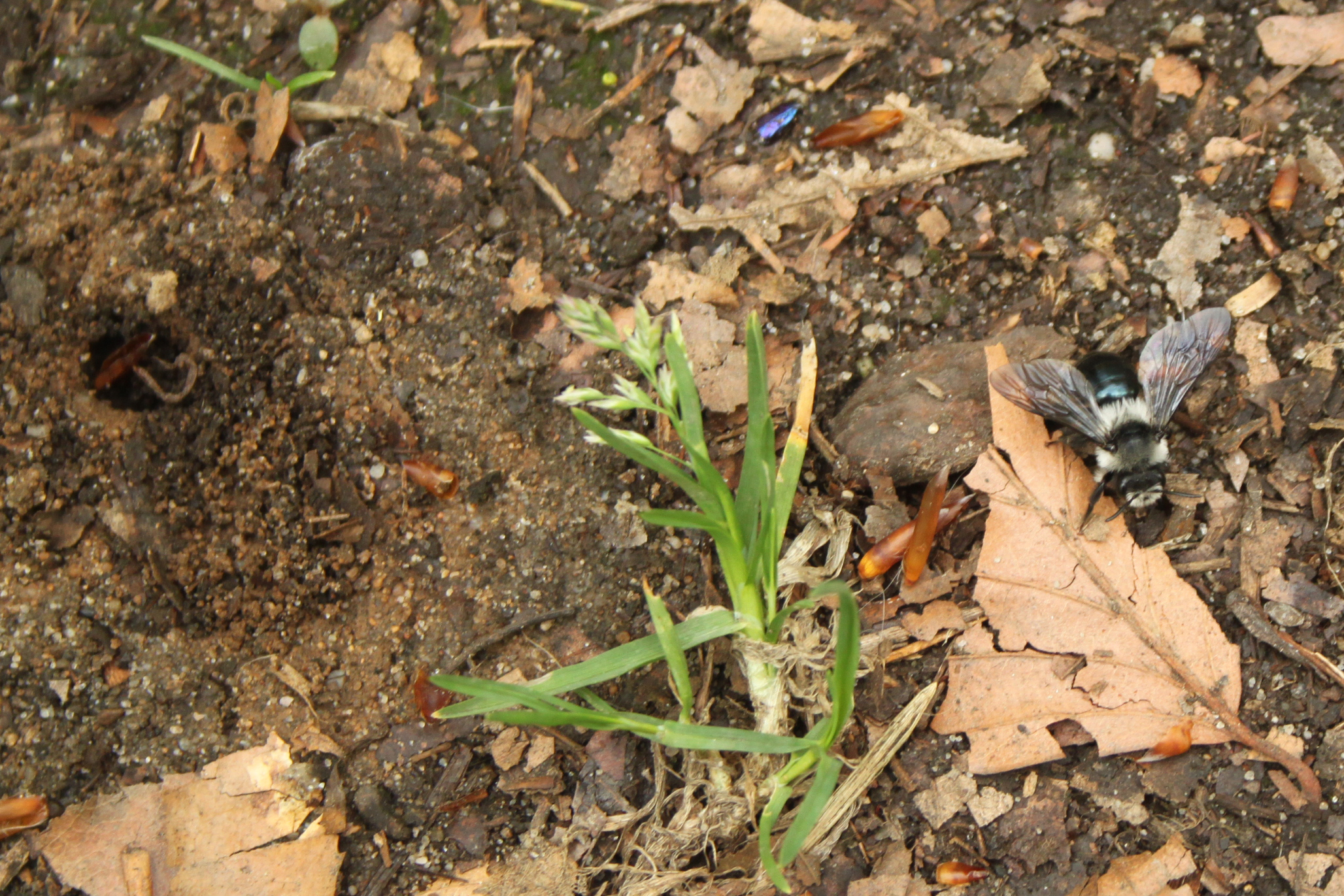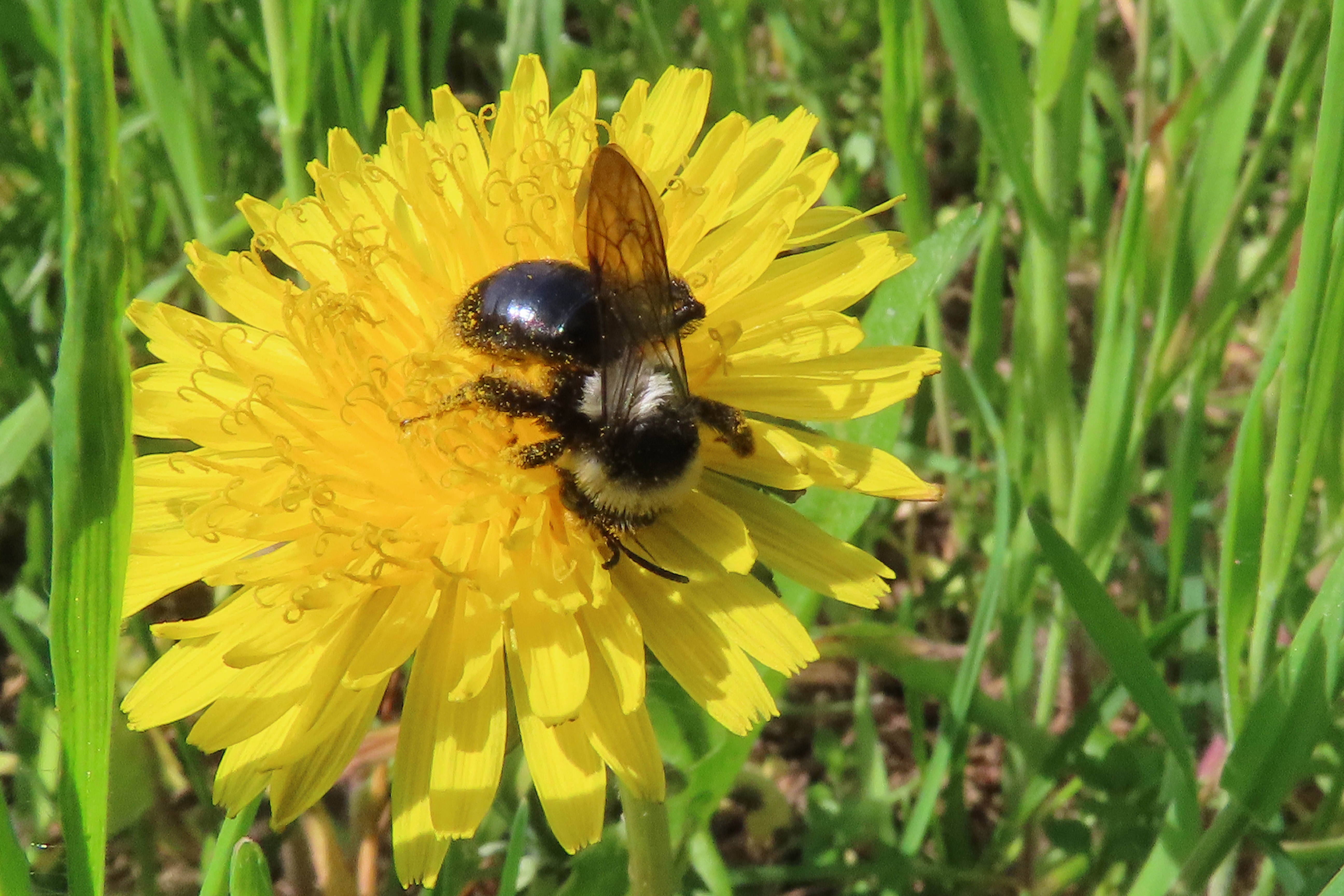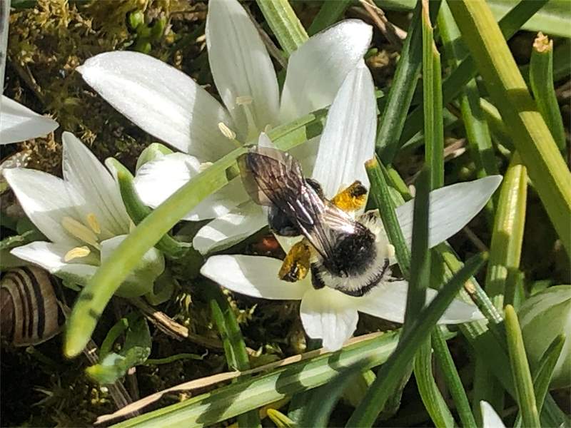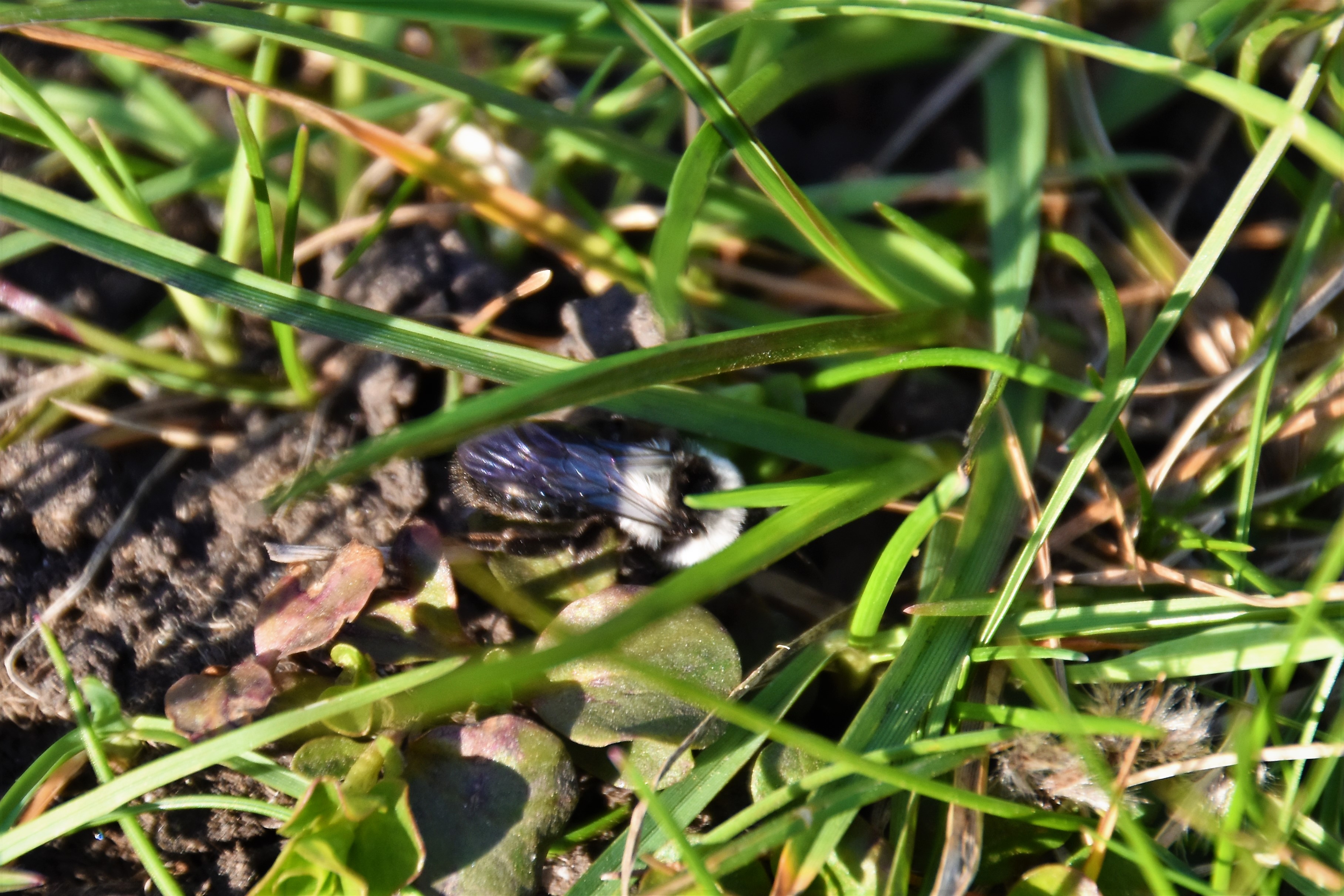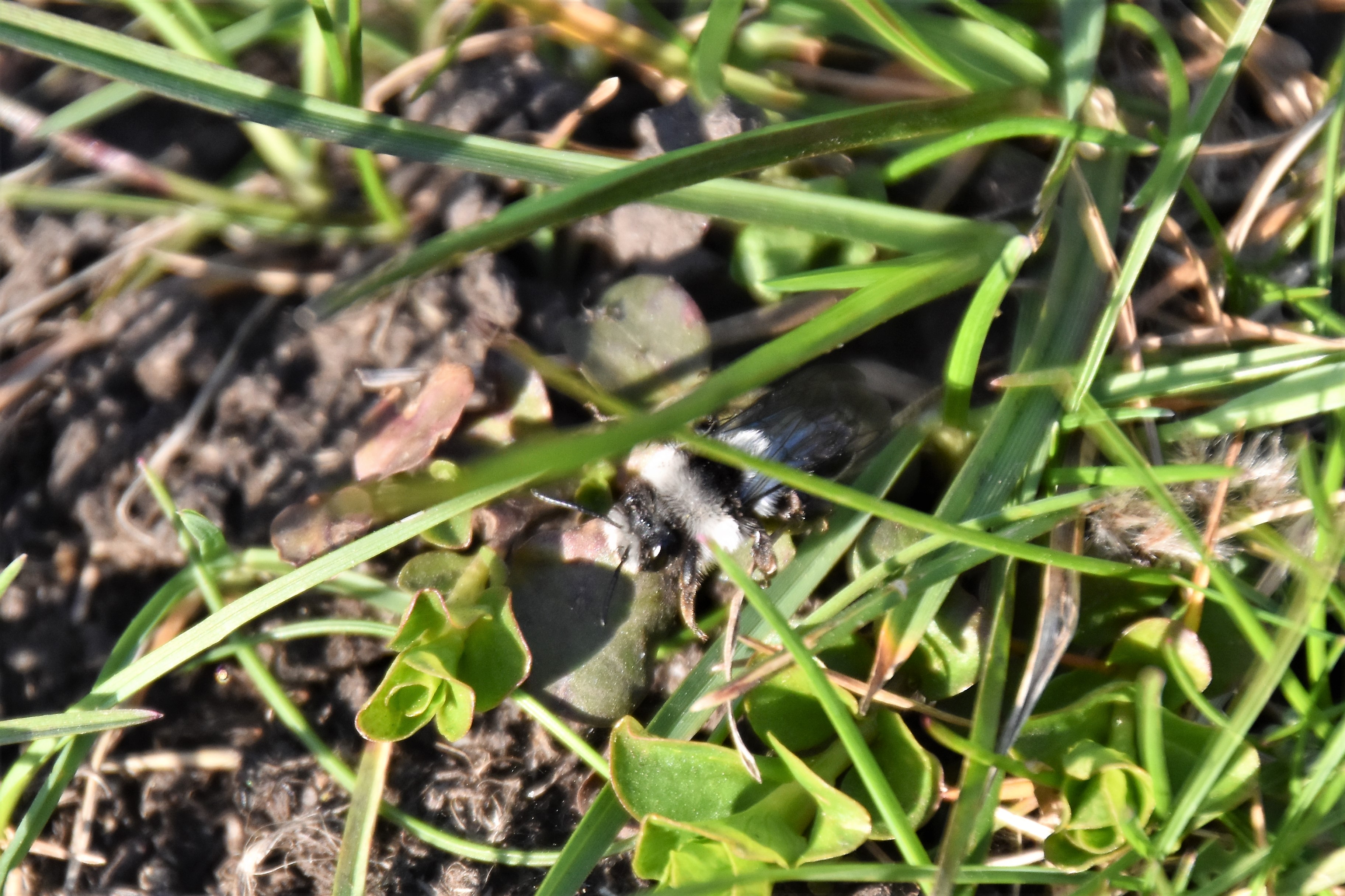 Graue Sandbiene (Andrena cineraria (Linnaeus, 1758)), Weibchen, Blütenbesuch an Efeu-Ehrenpreis (Veronica hederifolia), für die relativ große Biene eine sichtliche Herausforderung, Roßwein OT Gleisberg, April 2020