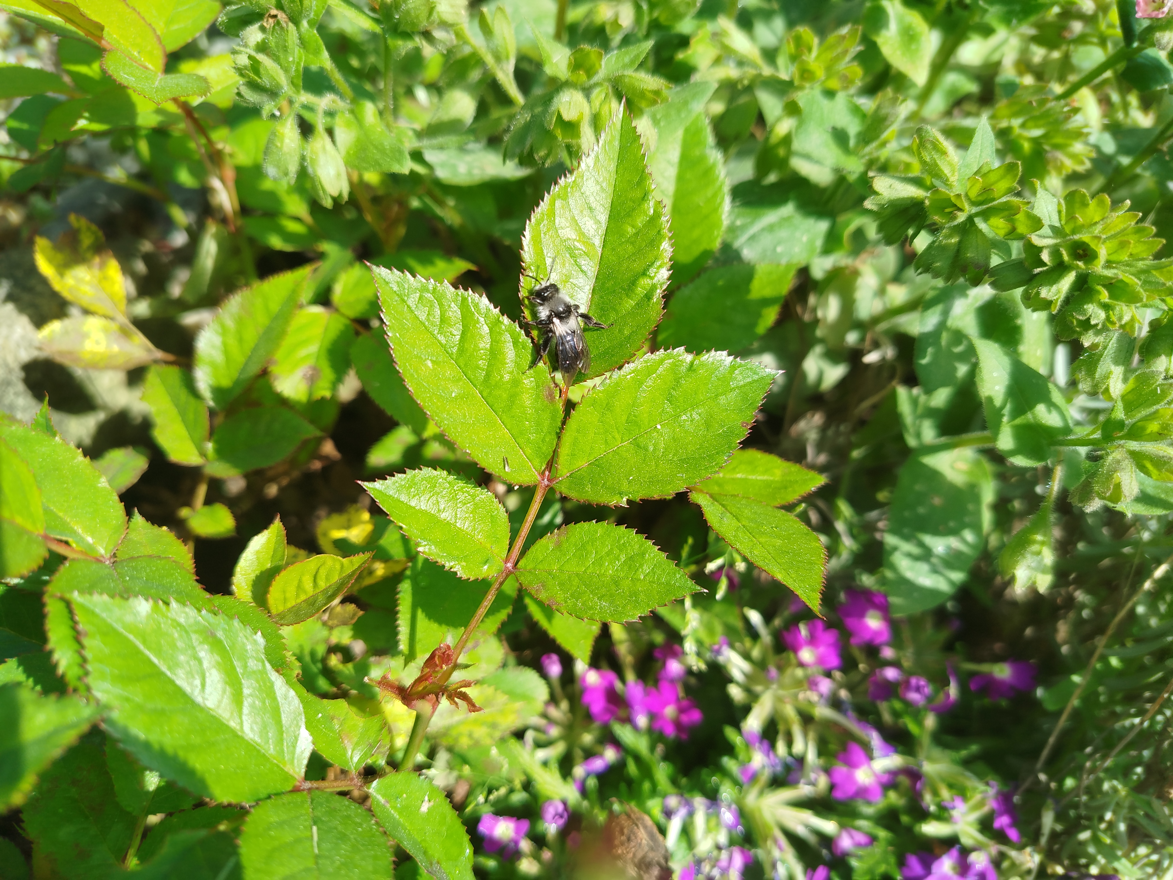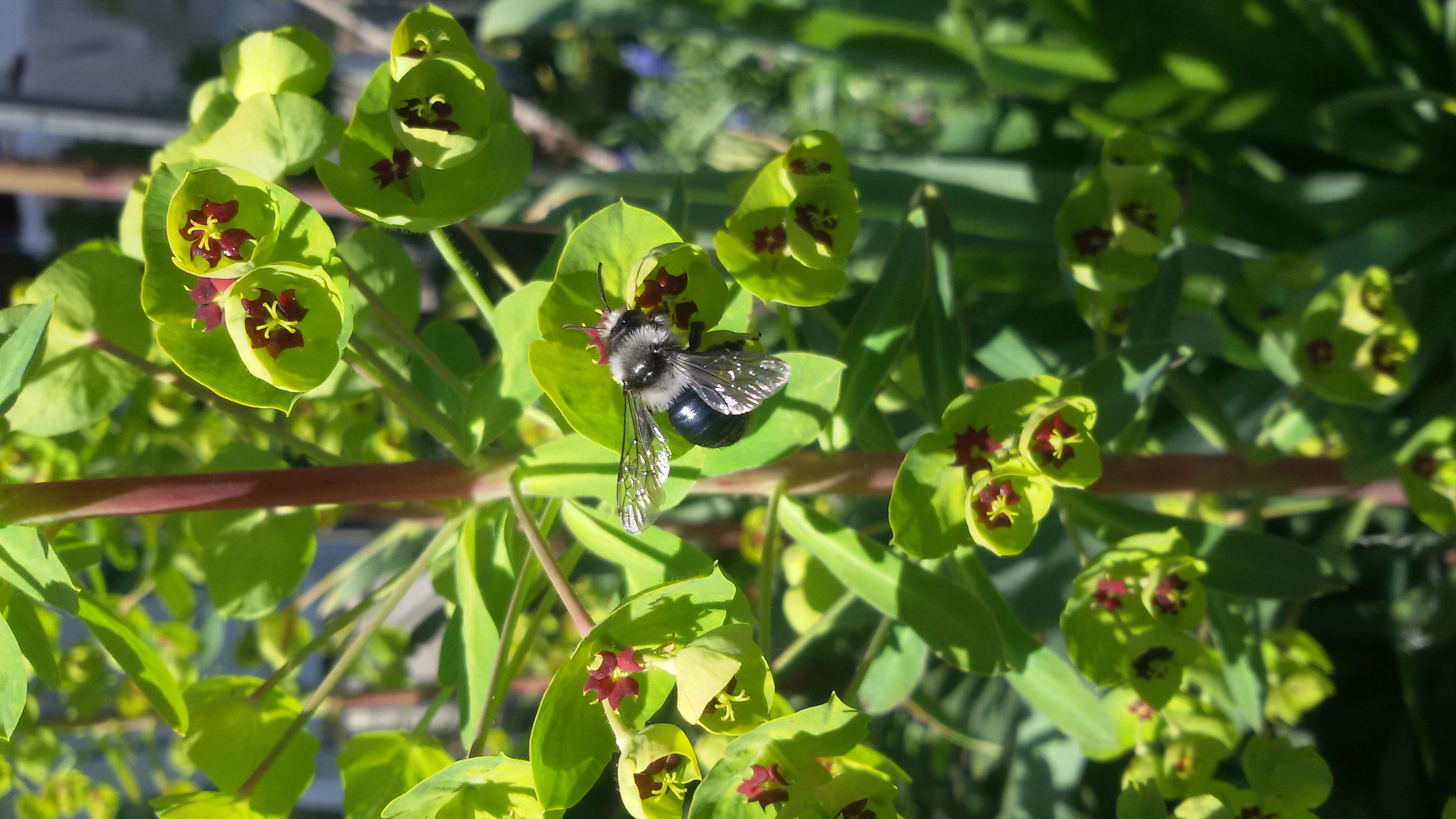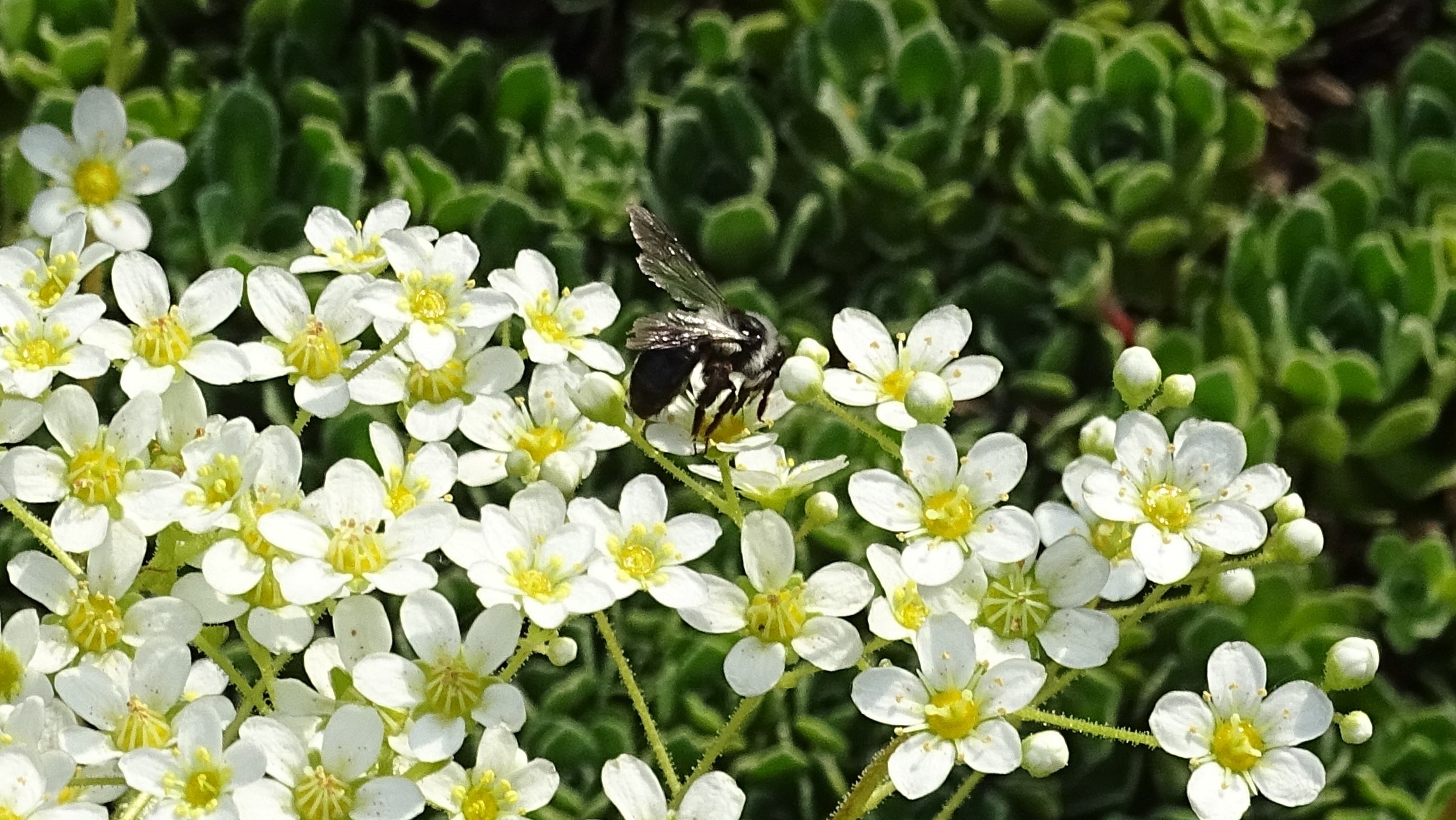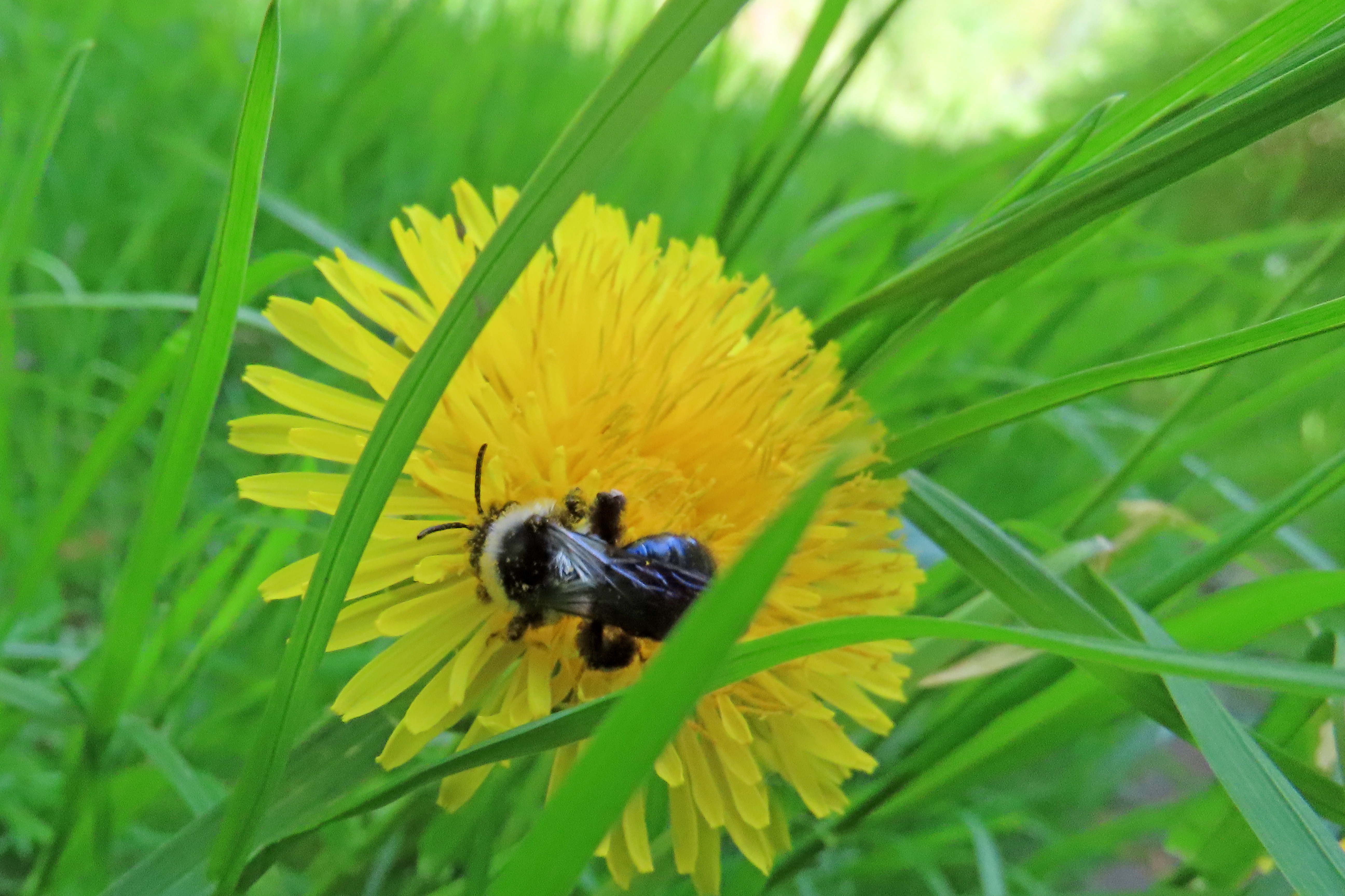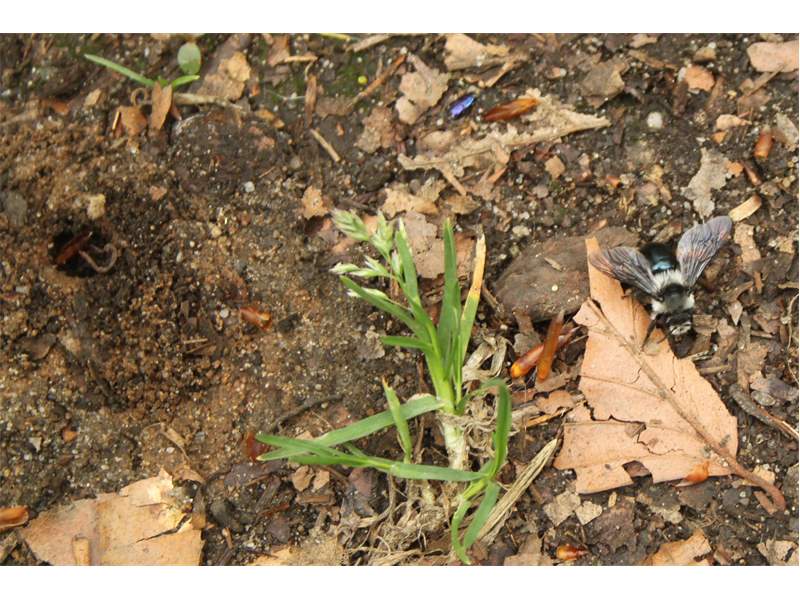 Graue Sandbiene (Andrena cineraria (Linnaeus, 1758)), Weibchen, Blütenbesuch an Efeu-Ehrenpreis (Veronica hederifolia), für die relativ große Biene eine sichtliche Herausforderung, Roßwein OT Gleisberg, April 2020
