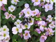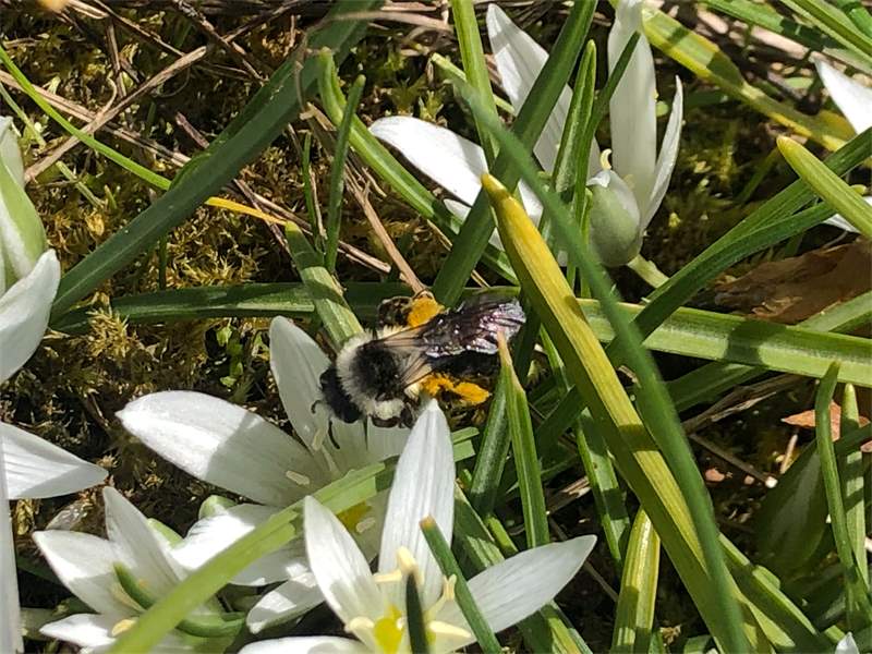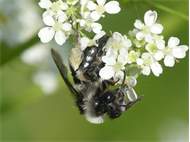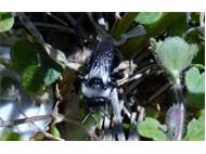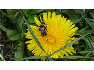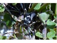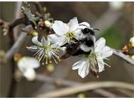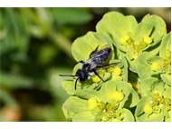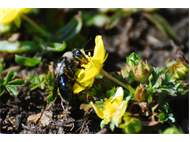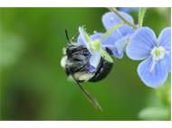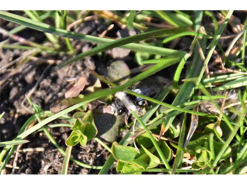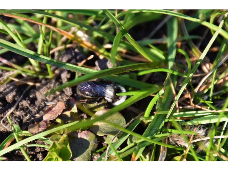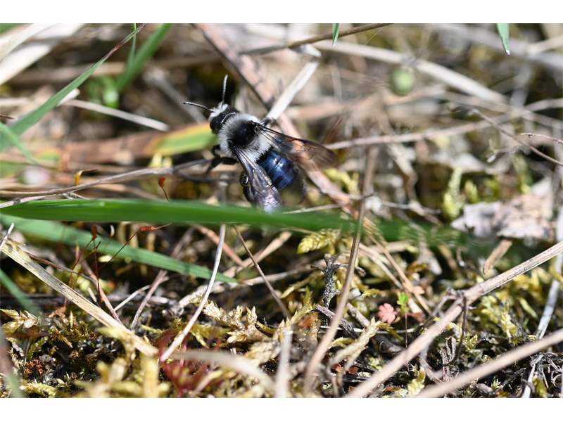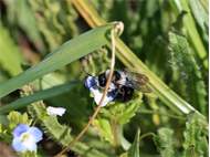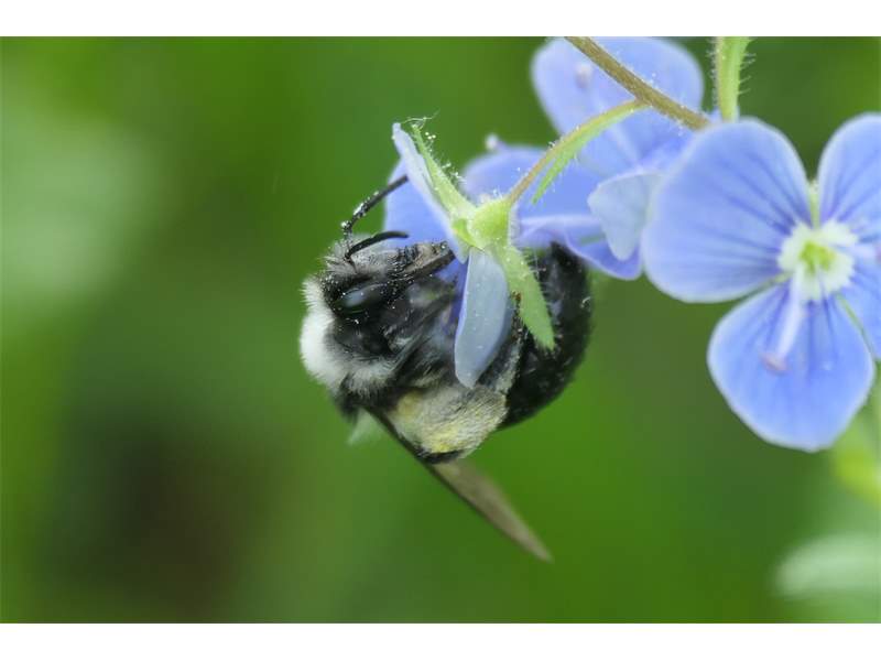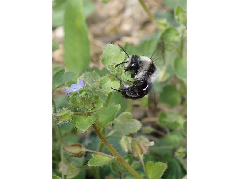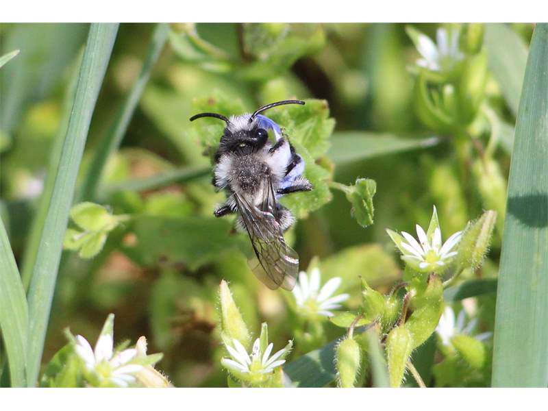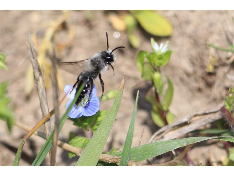 Graue Sandbiene (Andrena cineraria (Linnaeus, 1758)), Weibchen, Blütenbesuch an Efeu-Ehrenpreis (Veronica hederifolia), für die relativ große Biene eine sichtliche Herausforderung, Roßwein OT Gleisberg, April 2020 (© Andreas Hurtig)( Bild vergrößern)