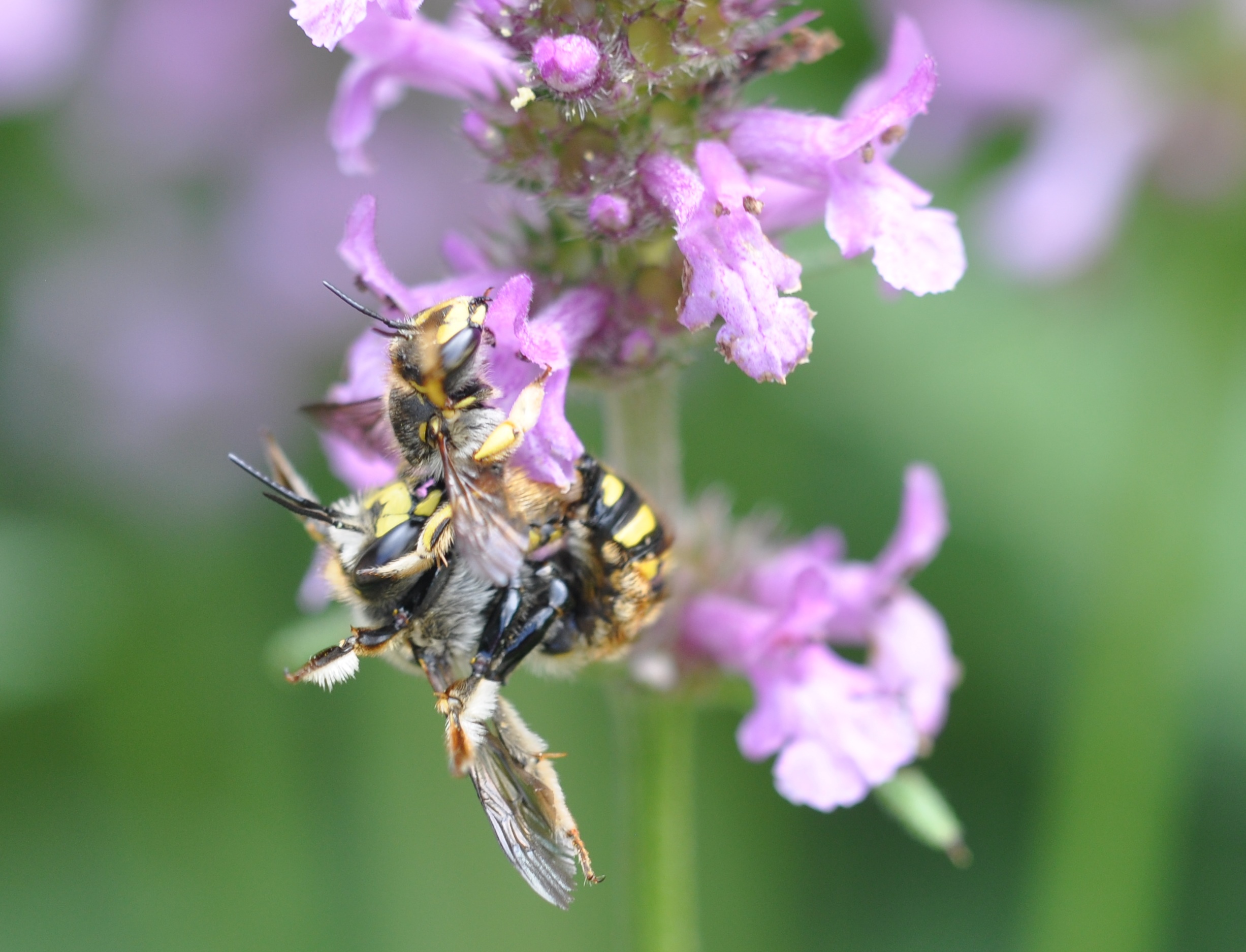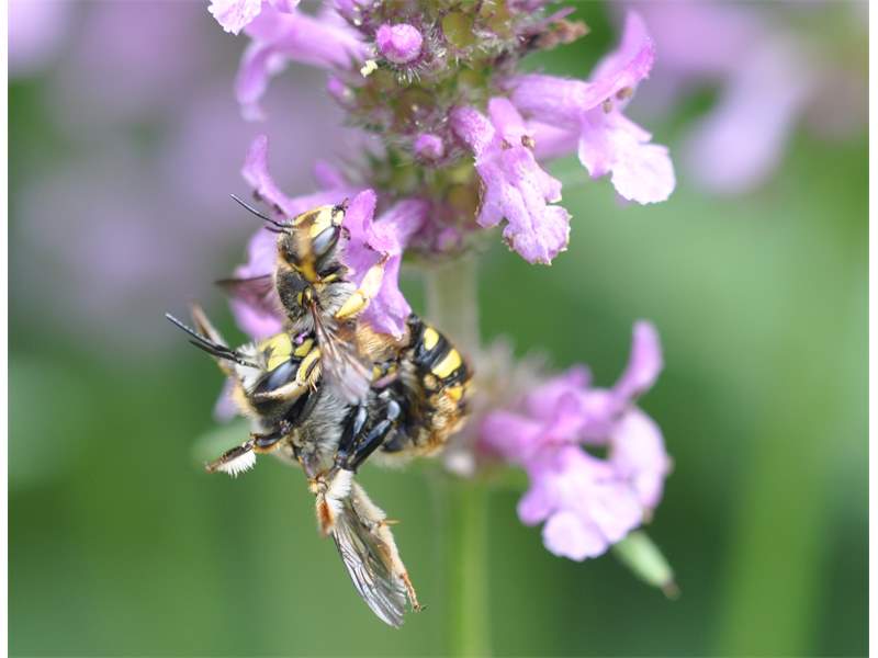 Die Weibchen der Großen Wollbiene, oder auch "Garten-Wollbiene", nisten in den unterschiedlichsten Hohlräumen, wie Fensternuten, Felsspalten aber auch Erdlöchern. Die dicht hinter- oder nebeneinander liegenden Brutzellen bestehen aus Planzenwolle, die mit pflanzlichen Drüsensekreten imprägniert werden. Als Nesterschluß dienen Pflanzenhaare, Steinchen, Erdbröckchen und Holzstückchen.
