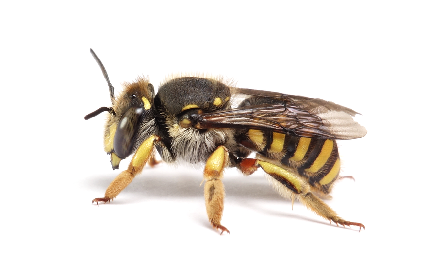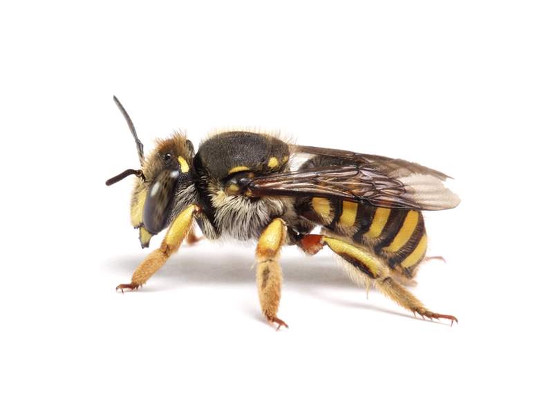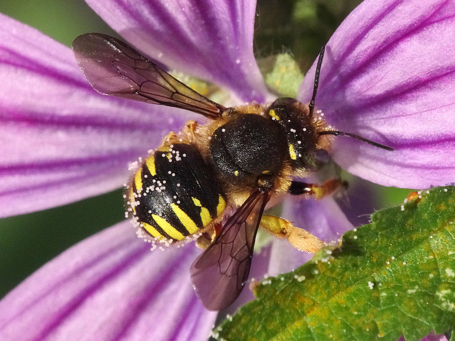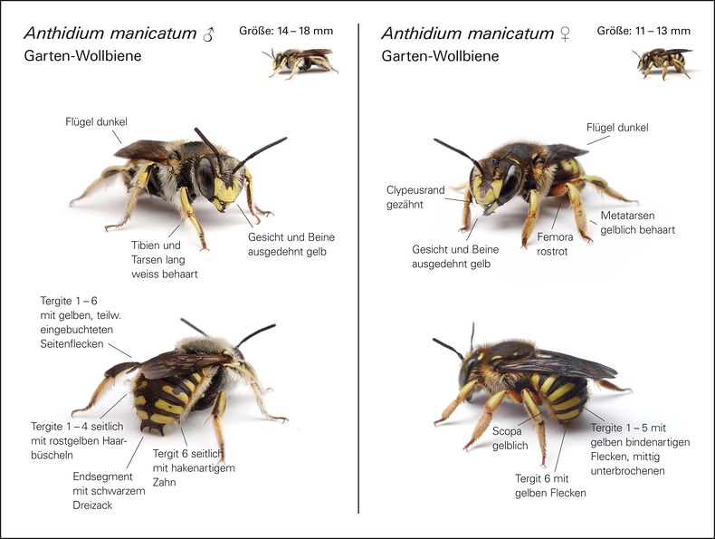Mittelgroße bis große, gedrungene, schwarze Biene mit auffälliger, gelber Zeichnung auf Kopf, Thorax, Abdomen und Beinen. Der Clypeus ist fast so lang wie breit. Die Klauenglieder tragen keinen Pulvillus. Die auffällig gelb-schwarze Zeichnung teilt Anthidium manicatum mit zwei weiteren, ähnlich großen in Deutschland vorkommenden Vertretern der Gattung Anthidium, Anthidium oblongatum und A. septemspinosum, sowie mit der Kleinen Harzbiene Anthidiellum strigatum und derem Brutparasiten, der Düsterbiene Stelis signata. Am ehesten kann Anthidium manicatum mit der selteneren, wärmeliebenden Art Anthidium oblongatum verwechselt werden. Das wichtigste Unterscheidungsmerkmal sind hier die auffallend grünen Augen in beiden Geschlechtern von Anthidium oblongatum. Das Vorkommen von A. septemspinosum beschränkt sich in Deutschland auf Rheinland-Pfalz, das Saarland und Baden-Württemberg. Anthidiellum strigatum und Stelis signata sind mit einer Körpergröße von 6–7 mm deutlich kleiner als Anthidium manicatum. Weibchen: Körpergröße 11–13 mm. Gelb gezeichnet sind: das Nebengesicht im Ganzen, der Clypeus dreieckig seitlich und unten, die Mandibeln mittig, der Hinterrand des Kopfes, die Tegulae am Rand und die Tibien und Tarsen außen. Der Clypeusrand ist gezähnt, mit schärfer vorspringenden Seitenzähnchen. Hinterleibtergite mit bindenartigen, mittig mehr oder weniger unterbrochenen, gelben Flecken; auf dem Endtergit diese etwas vom Rand abgerückt. Endtergit seitlich mit stumpfen Ecken. Bauchbürste gelblich. Femora größtenteils rostrot gefärbt; Tibien und Tarsen größtenteils gelb. Metatarsen wollig gelblich behaart. Die Hintertibien außen mit einer scharfkantigen Längsleiste. Männchen: Körpergröße 14–18 mm; damit oft deutlich größer als das Weibchen. Gesicht locker behaart; Gesichtszeichnung ähnlich der des Weibchens, der Clypeus jedoch nur oben schwarz. Hinterleibtergite 1–6 mit gelben, bindenartigen Seitenflecken; diese auf den Tergiten 2–4 mehr oder weniger ausgeschnitten. Hinterleibtergite 1–4 seitlich mit dicht geschlossenen, rostgelben Haarfransen. Die Endtergite sind auffällig dornartig bewehrt; Tergit 6 seitlich mit jeweils einem hakenartigen Dorn; Tergit 7 komplett schwarz und dreizähnig, der mittlere Dorn kleiner als die beiden spitzen Seitendorne. Die Sternite sind gewölbt und weißlich behaart. Tibien und Tarsen sind gelb gezeichnet und lang weiß behaart. Der Hinterfemur ist ungezähnt.