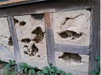 einem Fachwerk nachgebildete Nisthilfe für Wildbienen, besetzt mit A. plumipes, Großer Garten Dresden, Mai 2016 (© Tommy Kästner)( Bild vergrößern)