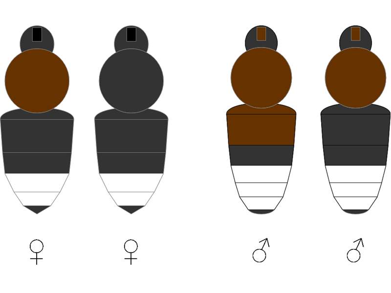 Beide Geschlechter sind grundlegend schwarz gefärbt und besitzen