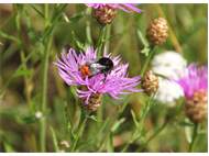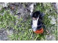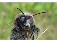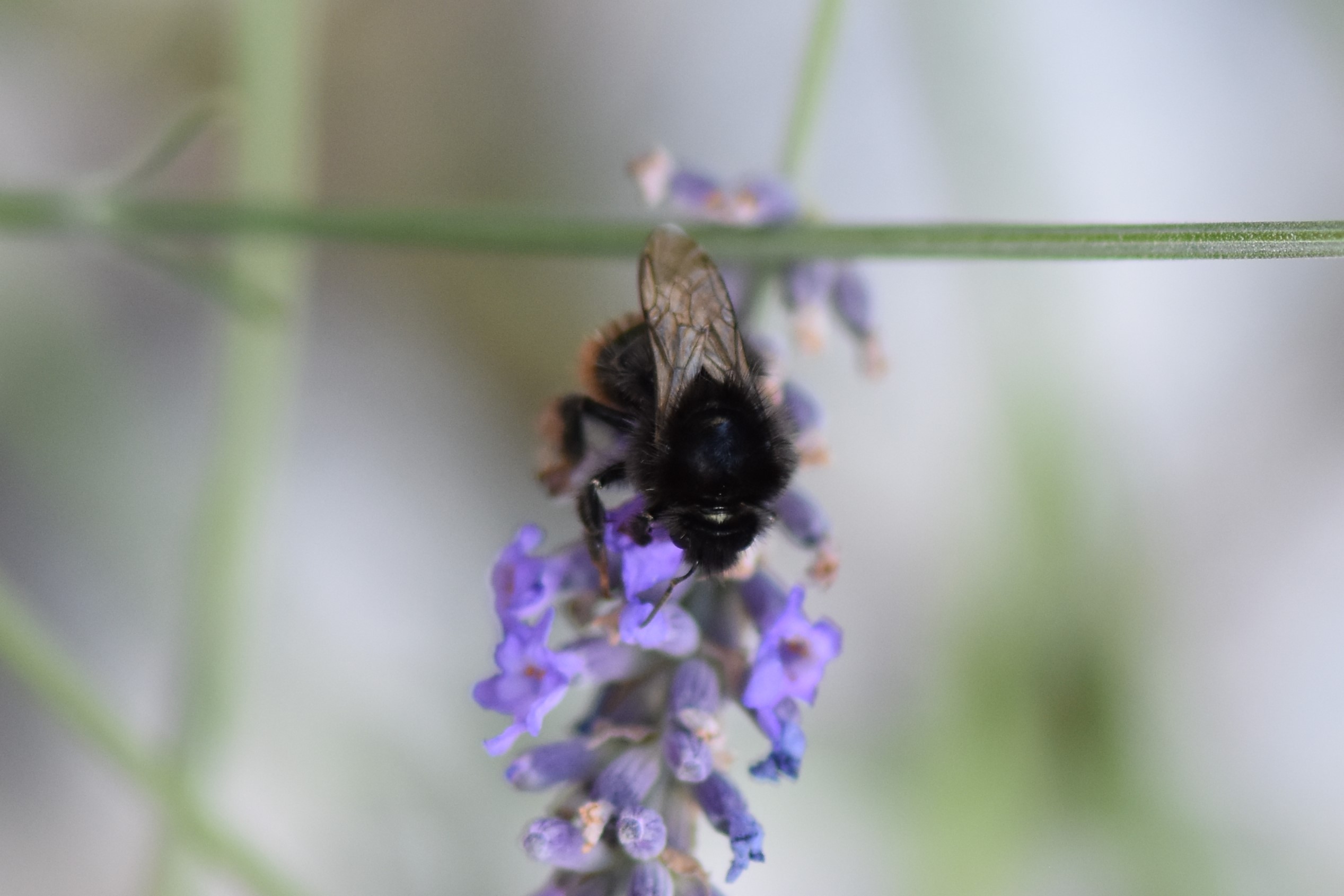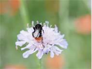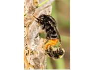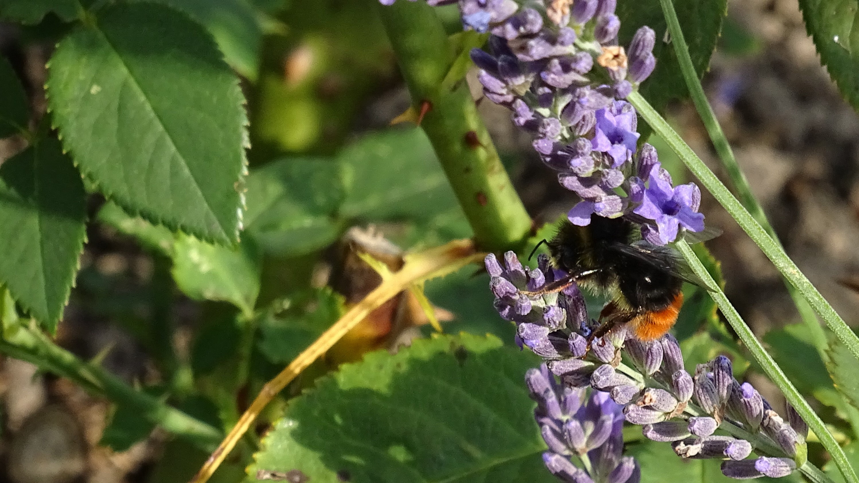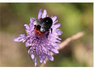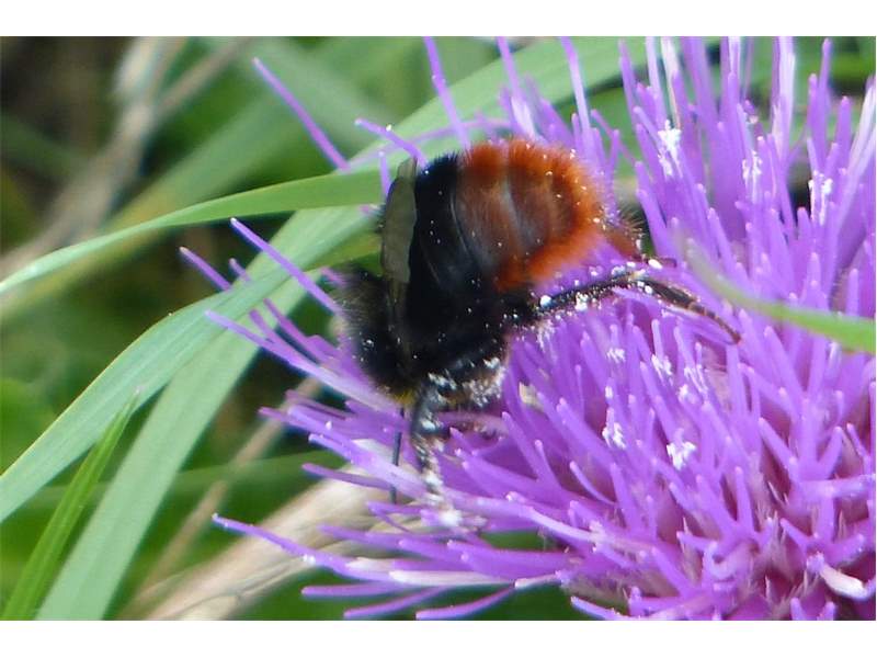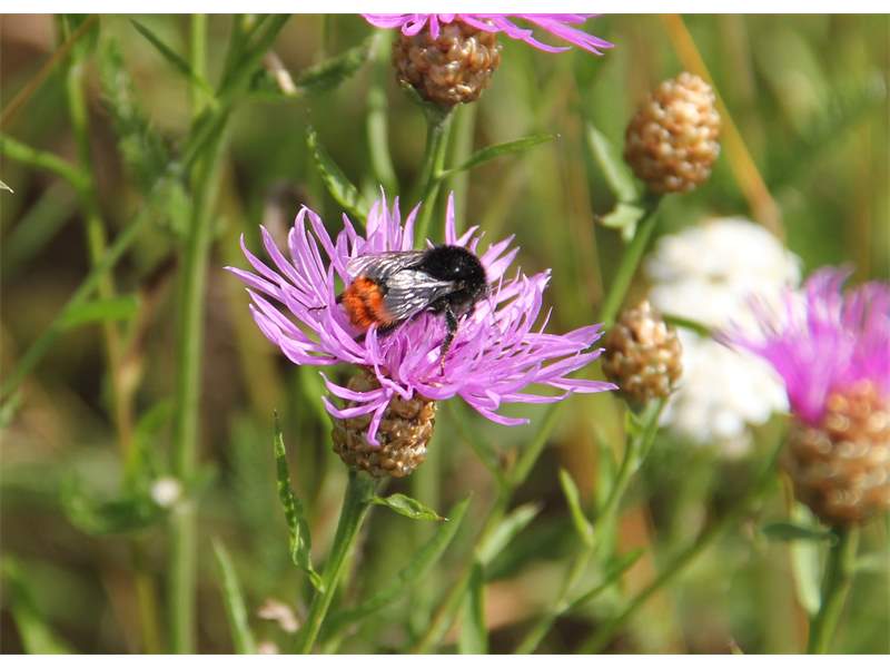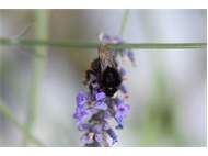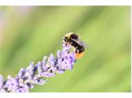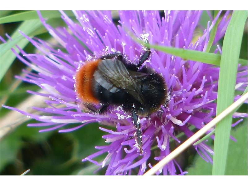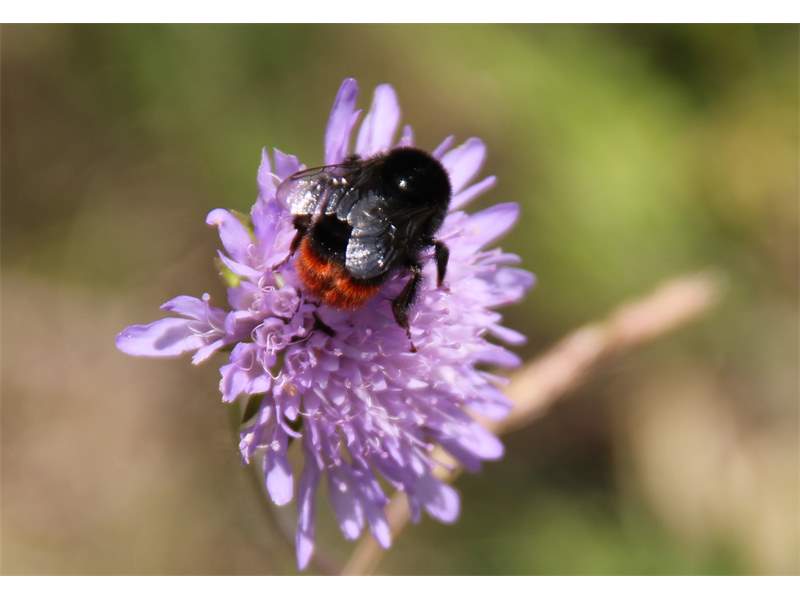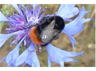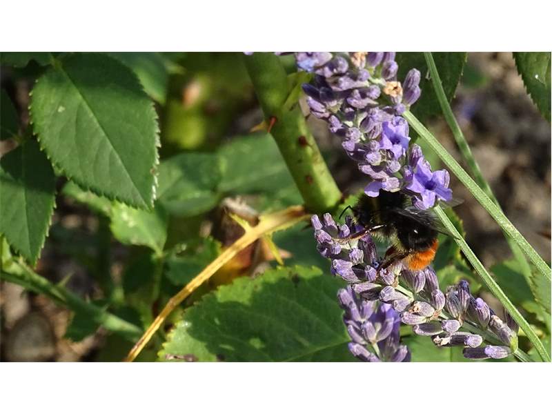 Steinhummel (Bombus lapidarius (Linnaeus, 1758)) an Lavendel, Dresden, Stadtrand, Juli 2019. Der Drohn ist an der hellen Kopfbehaarung zu erkennen, beim Weibchen sind Kopf und Thorax komplett schwarz. Auffällig ist das samtig rote Hinterteil. (© Annegret Seemann)( Bild vergrößern)