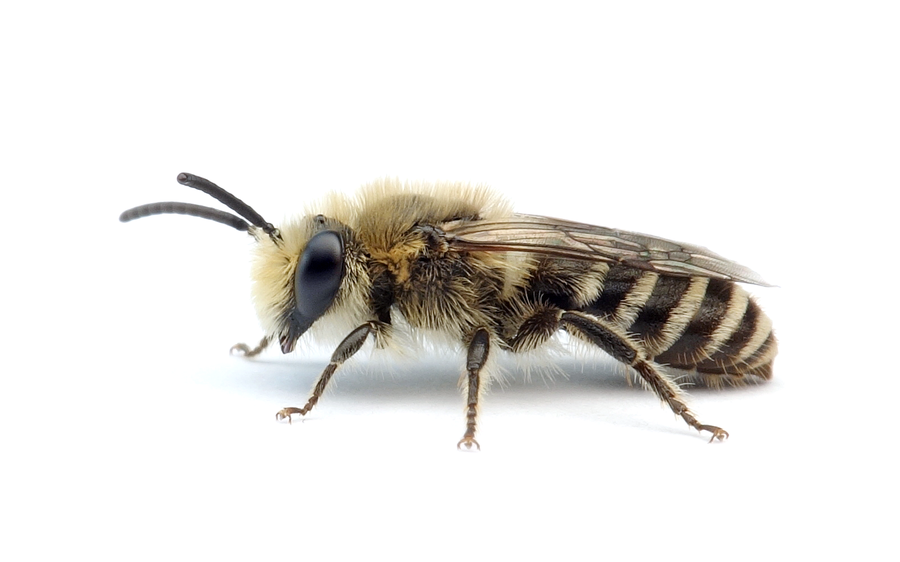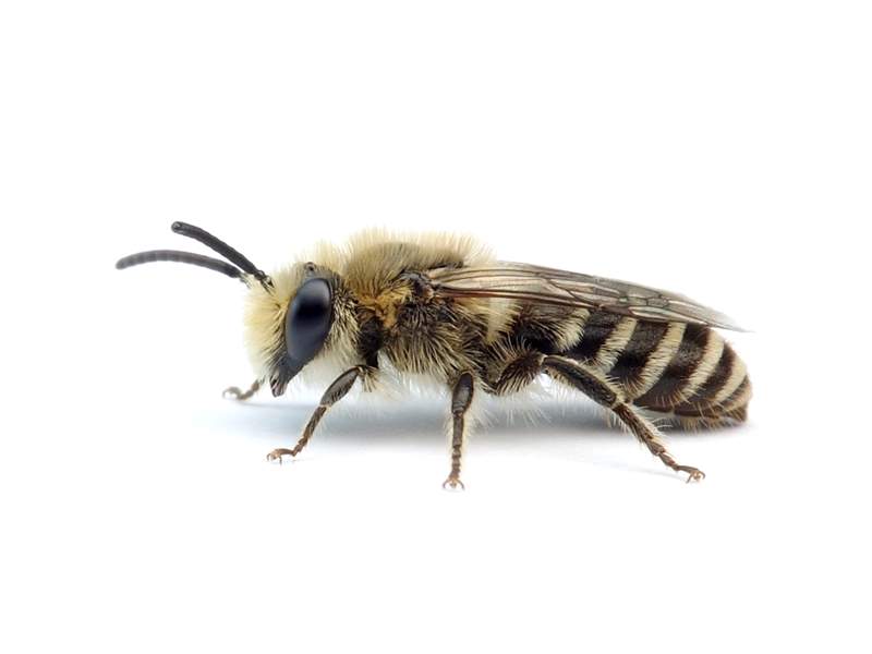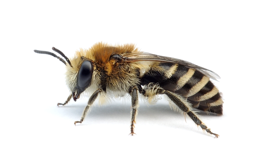 Männchen: Körperlänge 7–9 mm. Ähnlich dem Weibchen aber Gesicht dichter behaart, Tergite 2–6 spärlich lang behaart und Haarbinden auf den Tergiträndern etwas weniger dicht. Haarfärbung des Mesonotums oft blasser und dadurch insgesamt weniger kontrastreich als das Weibchen. Fühlerglieder 3 und 4 etwa so breit wie lang. Tergit 1 glänzend; zerstreut punktiert, die Abstände größer als ein Punktdurchmesser. Endränder der Sternite 2–6 ohne durchgehende, dichte, anliegende Haarbinden. Sternite 4–6 mit deutlichen seitlichen Erhebungen; Sternit 6 dahinter eingedrückt. Neben diesen Eindrücken, zum seitlichen Rand zu, je ein auffallender Höcker mit einem langen, lockeren, nach hinten gerichteten Haarpinsel. Anhand diesen Merkmales mit keiner anderen Art zu verwechseln.