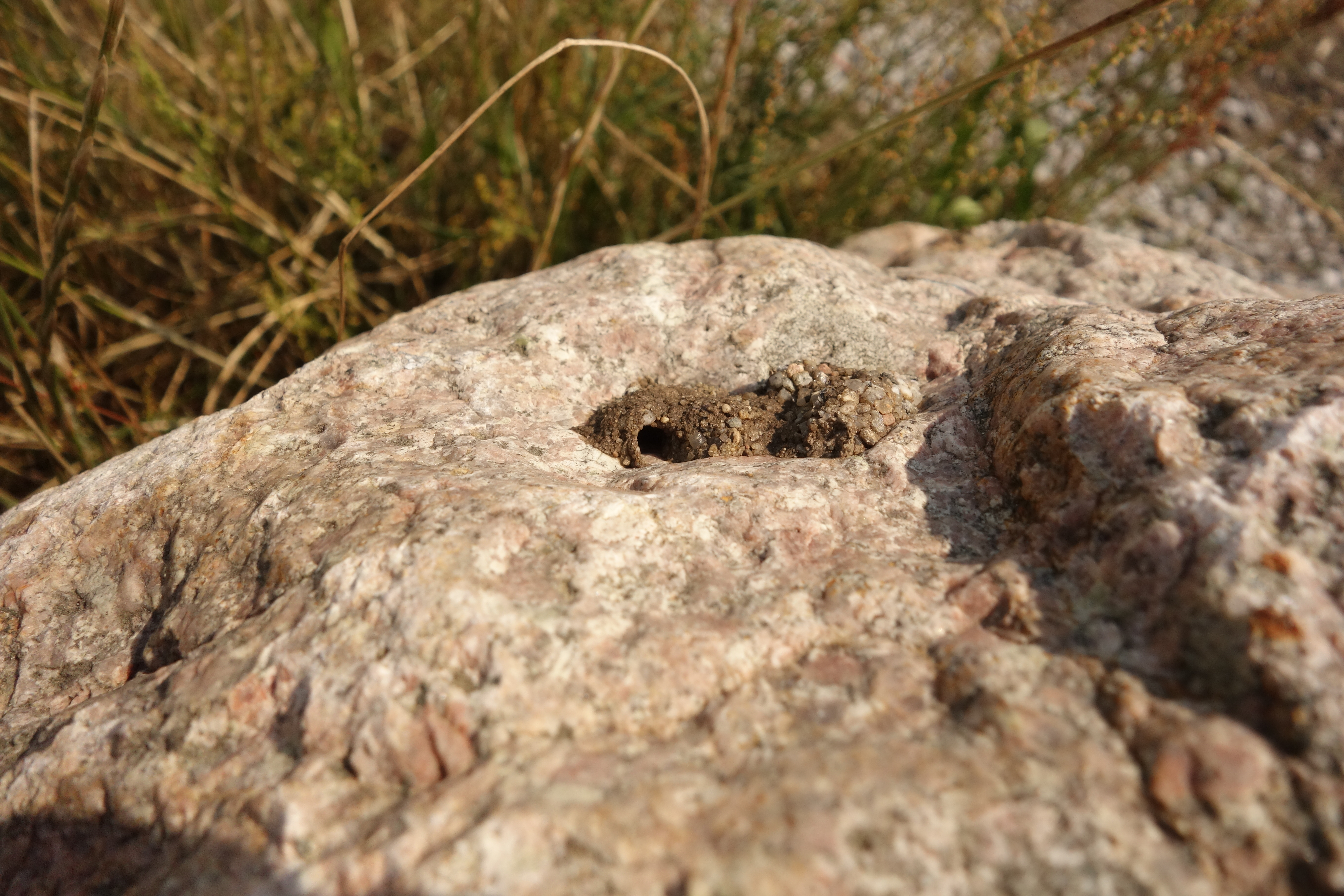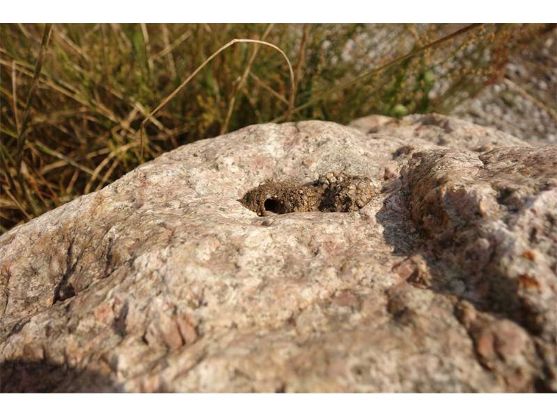 Die für Bienen ungewöhnlichen Freinester werden südlich exponiert an kantige Steine gebaut, die meist einen Mindestdurchmesser von 30 cm aufweisen (nur 8% besiedelter Steine besitzen einen Durchmesser unter 30 cm.). Die genutzten Steine liegen gewöhnlich in einer Distanz von 20 m zur nächsten Natternkopfpflanze (Echium vulgare). Als Nestbaumaterial dient mit Steinchen versetzter Lehm, der mit Speichel vermischt einen sehr festen Mörtel ergibt (Blank & Rothe 1998).