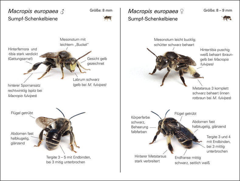 Weibchen: Hintertibia puschig weiß behaart (durch Öl-Pollen-Gemisch oft gelblich verfärbt); Metatarsen 2 und 3 innen und außen schwarz behaart.