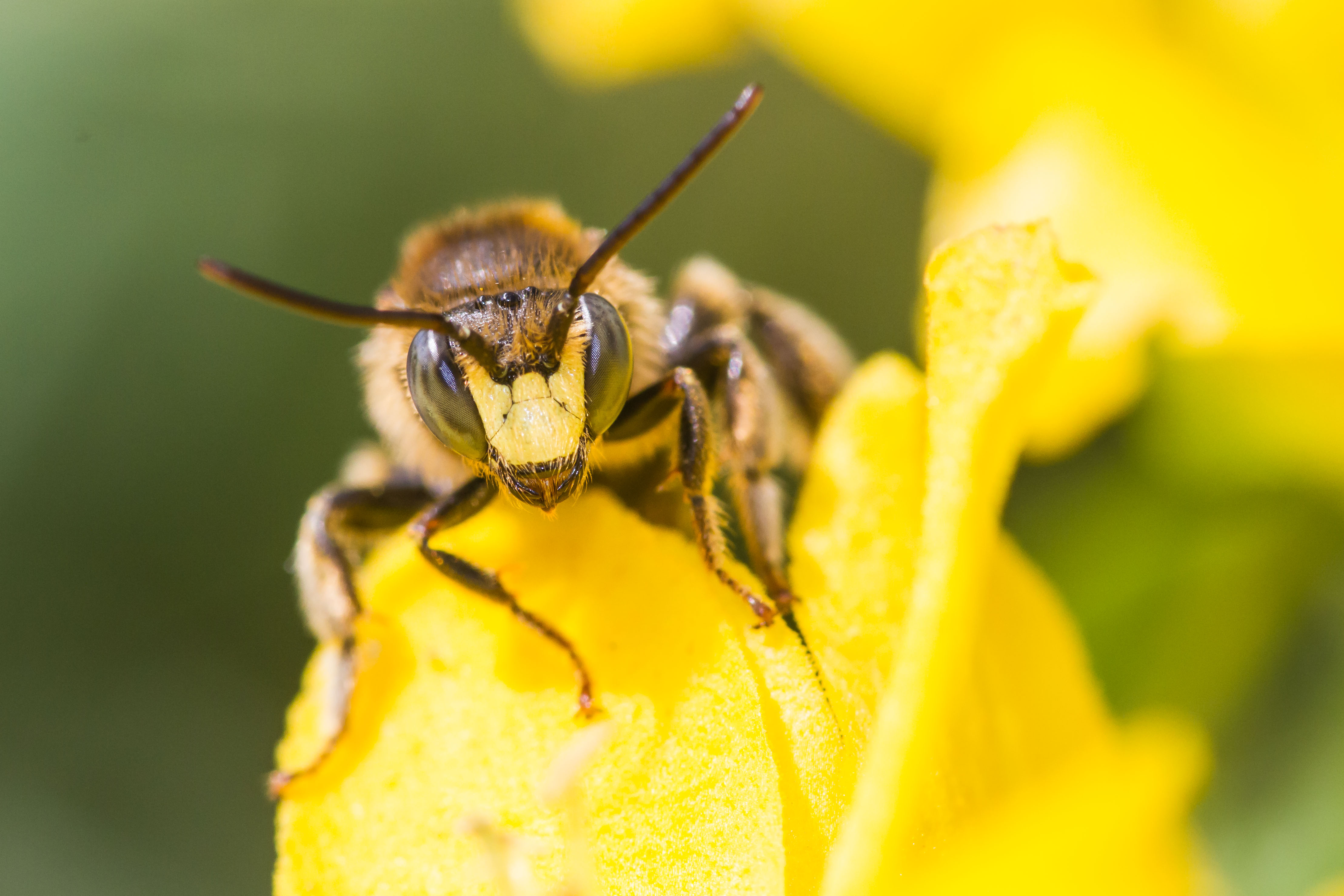 Macropis fulvipes ist komplett gelb gefärbt; der Spornansatz der Hintertibia läuft spitz aus.