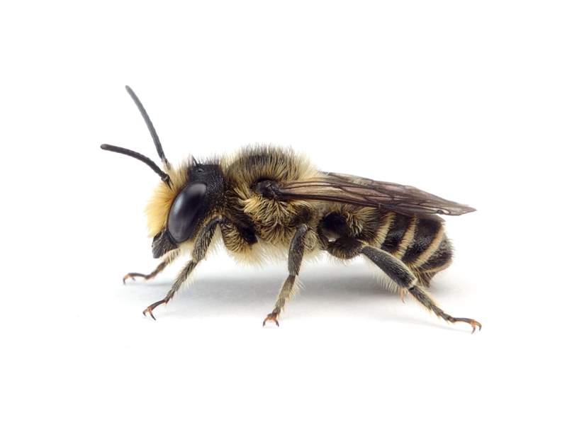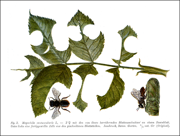 Weibchen von Megachile centuncularis mit Nestmaterial. Aus Friese 1923, Die europäischen Bienen, Berlin & Leipzig, Tafel 13.