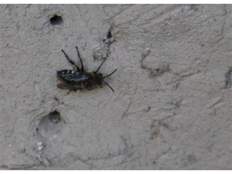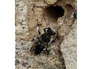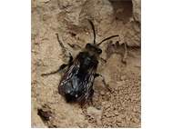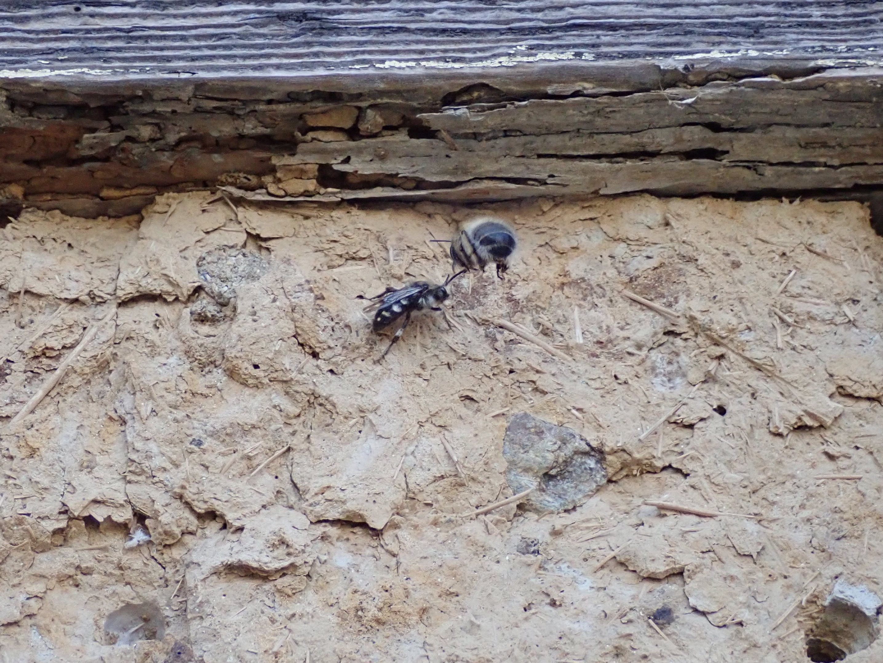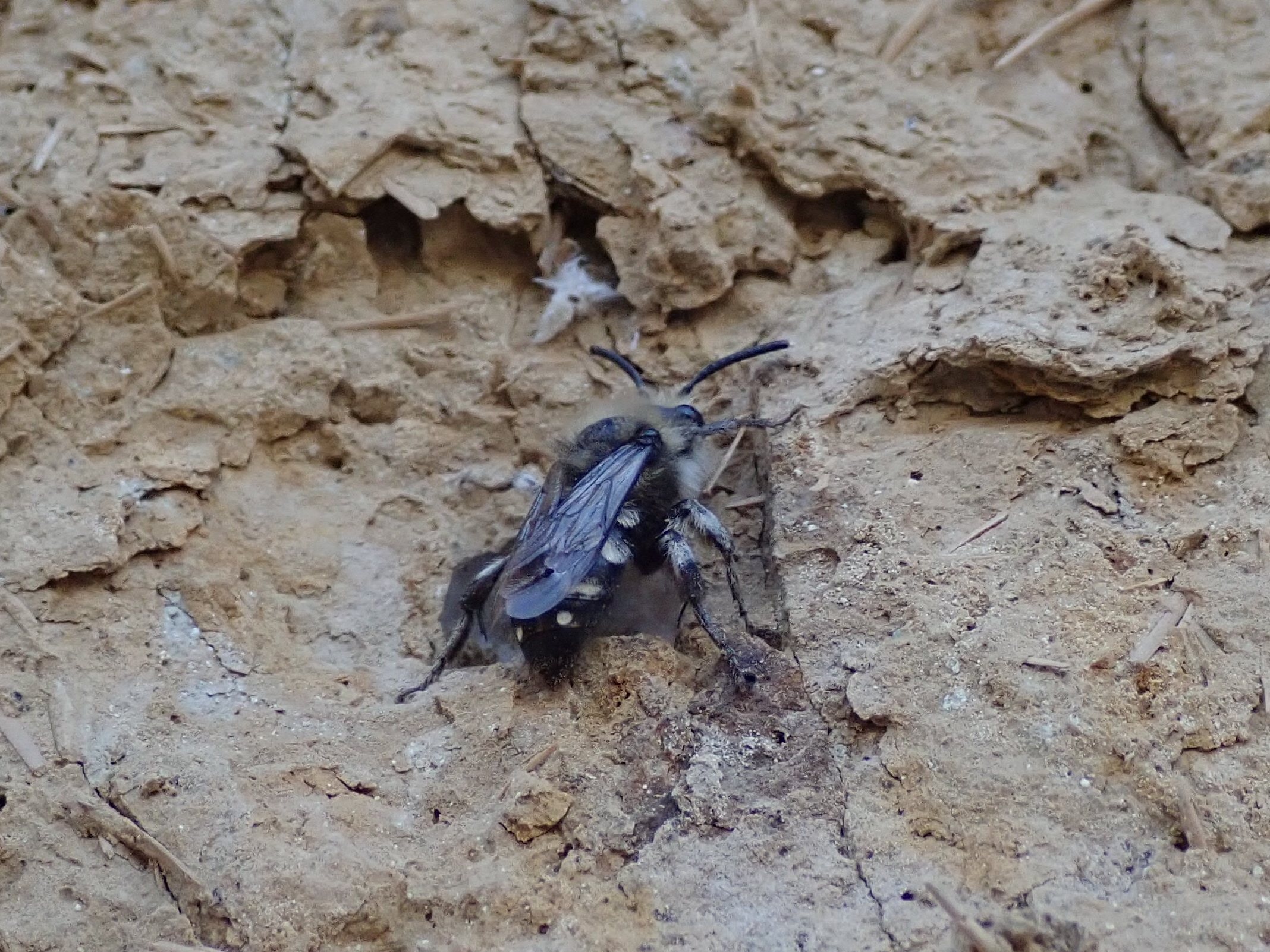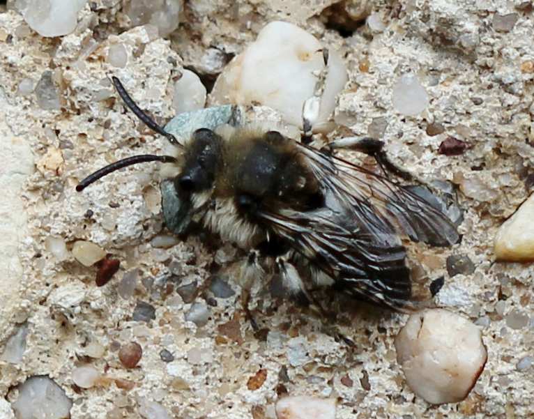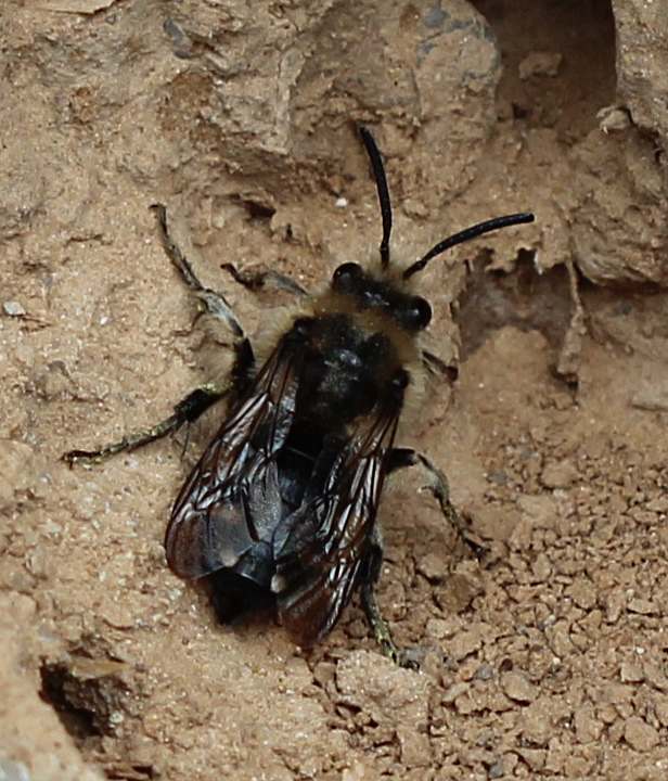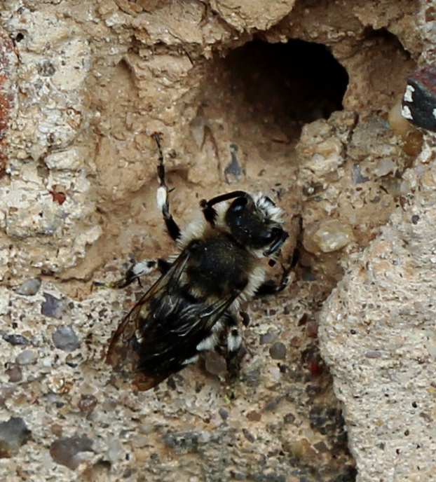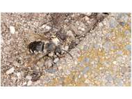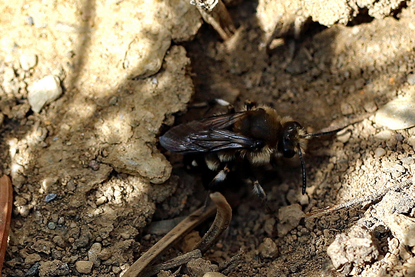 Gemeine Trauerbiene (Melecta albifrons (Foerster, 1771)), Weibchen, Exemplar mit reinweißen Haarflecken; Anthophora plumipes-Weibchen versuchen erfolglos, es von ihren Niststätten zu vertreiben; Roßwein OT Gleisberg, 26.04.2020 (© Andreas Hurtig)( Bild vergrößern)