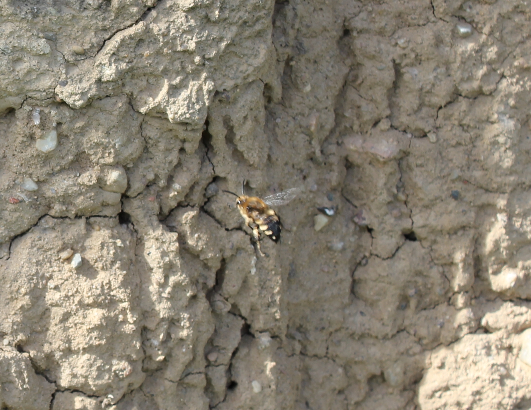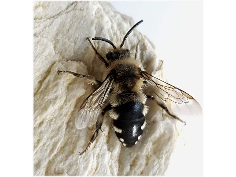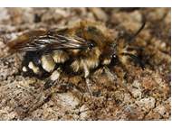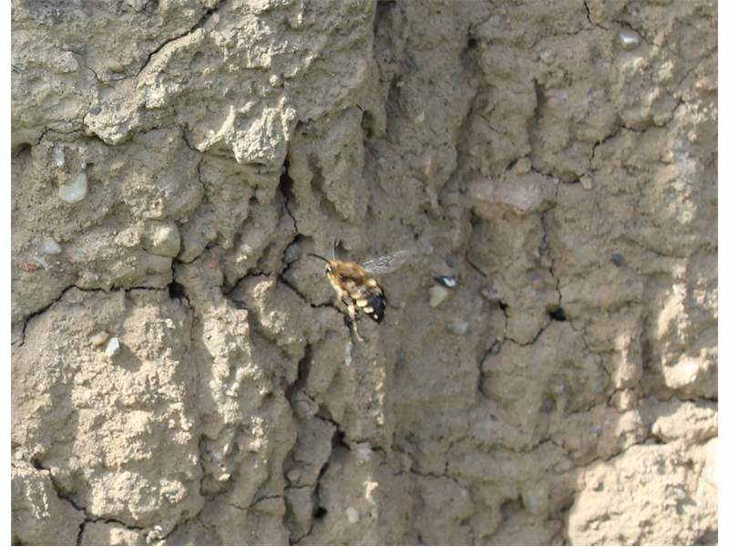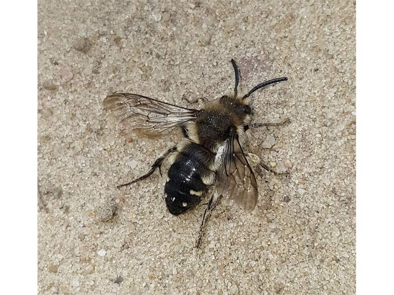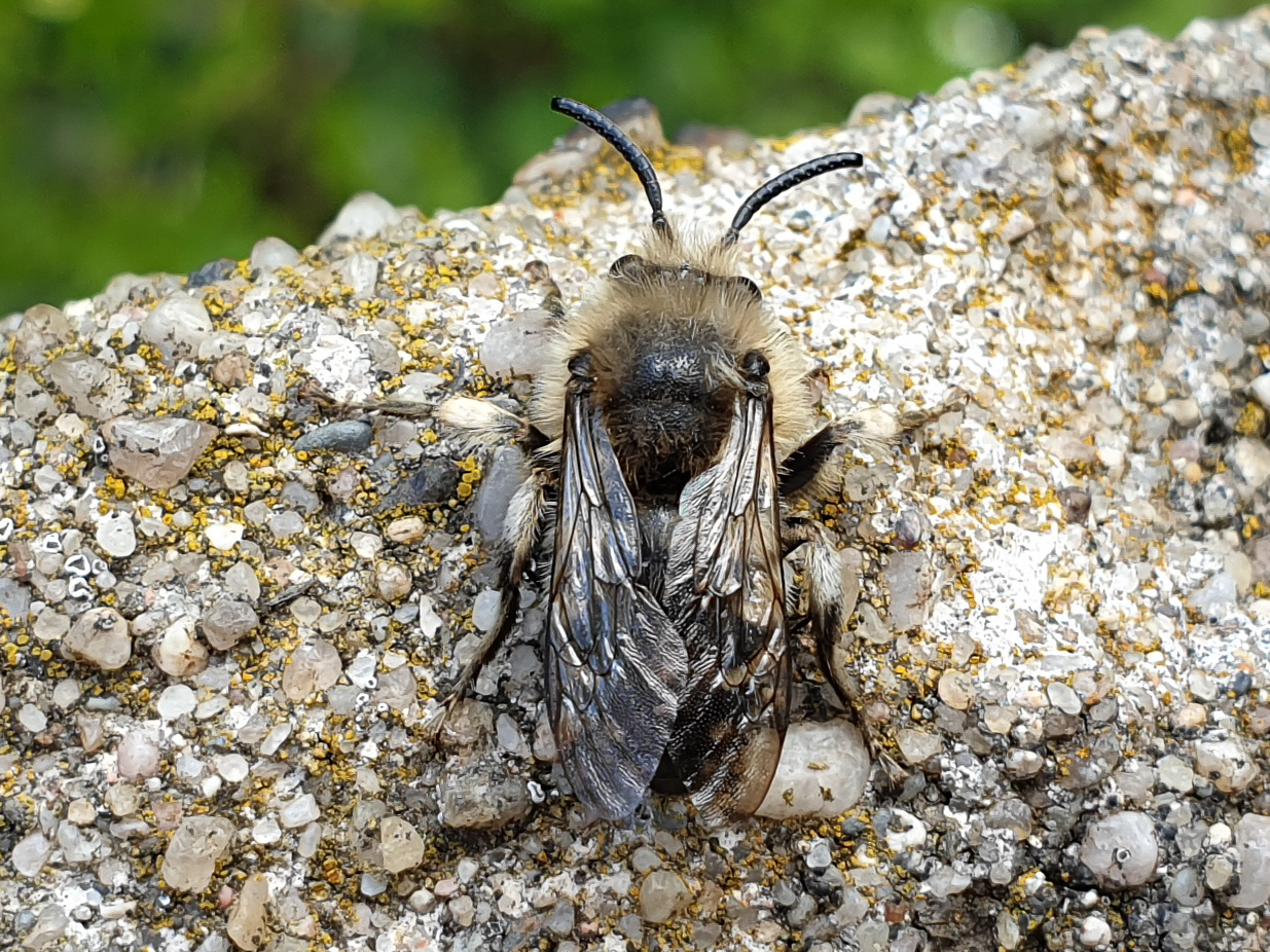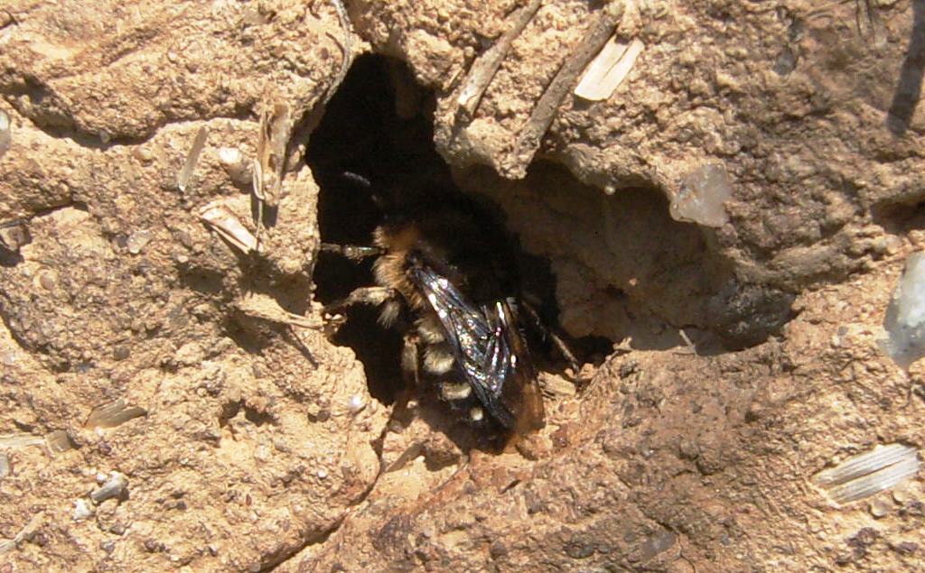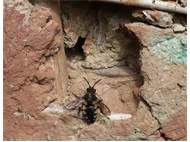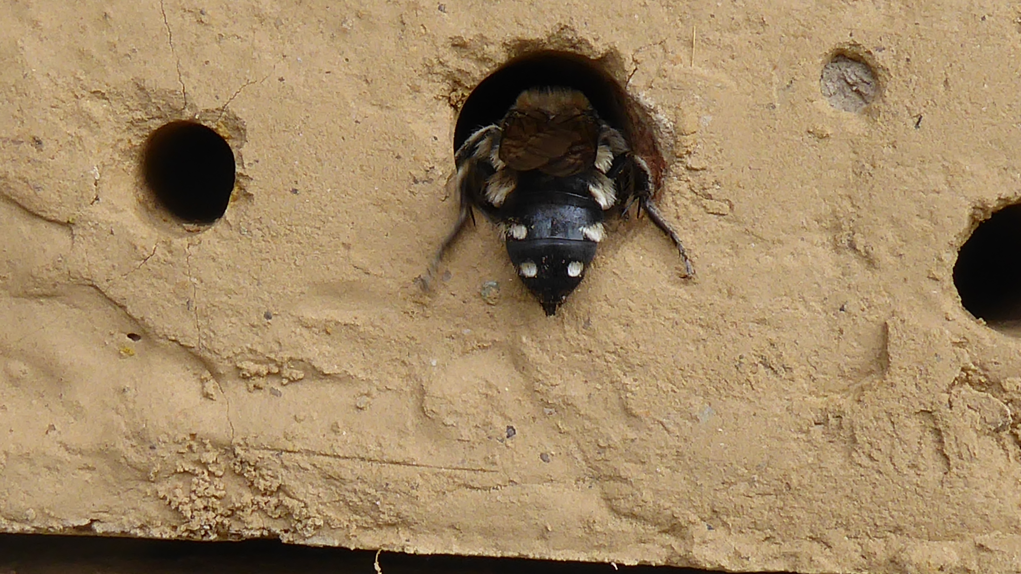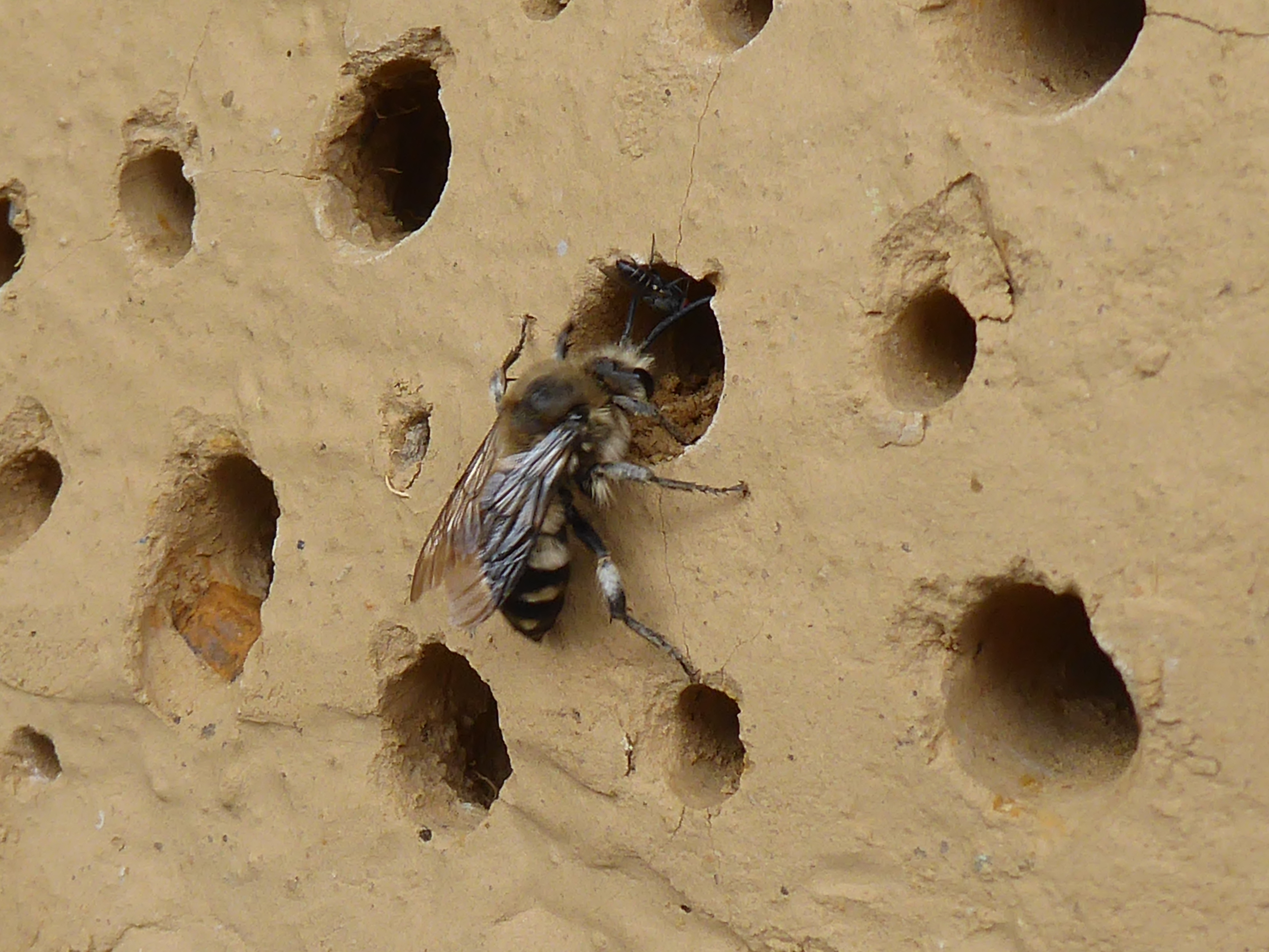 Gemeine Trauerbiene (Melecta albifrons (Foerster, 1771)), Weibchen, Exemplar mit reinweißen Haarflecken; Anthophora plumipes-Weibchen versuchen erfolglos, es von ihren Niststätten zu vertreiben; Roßwein OT Gleisberg, 26.04.2020 (© Andreas Hurtig)( Bild vergrößern)