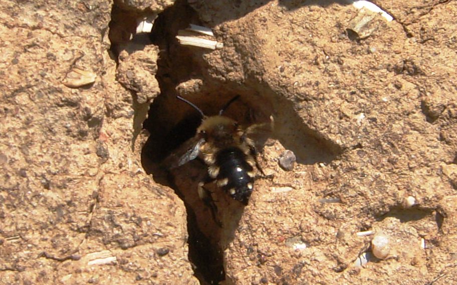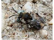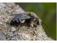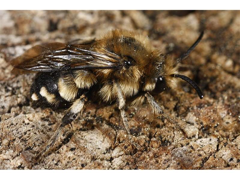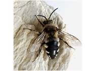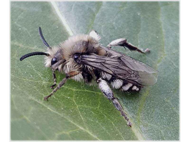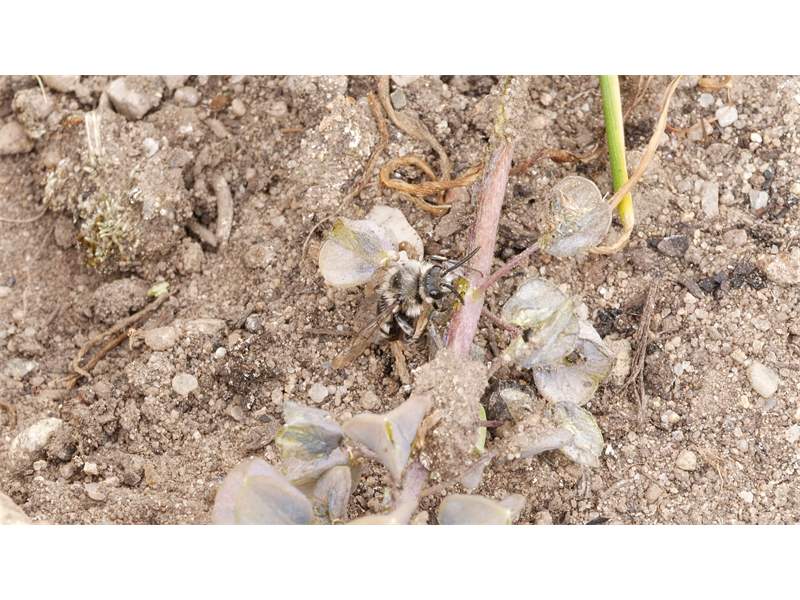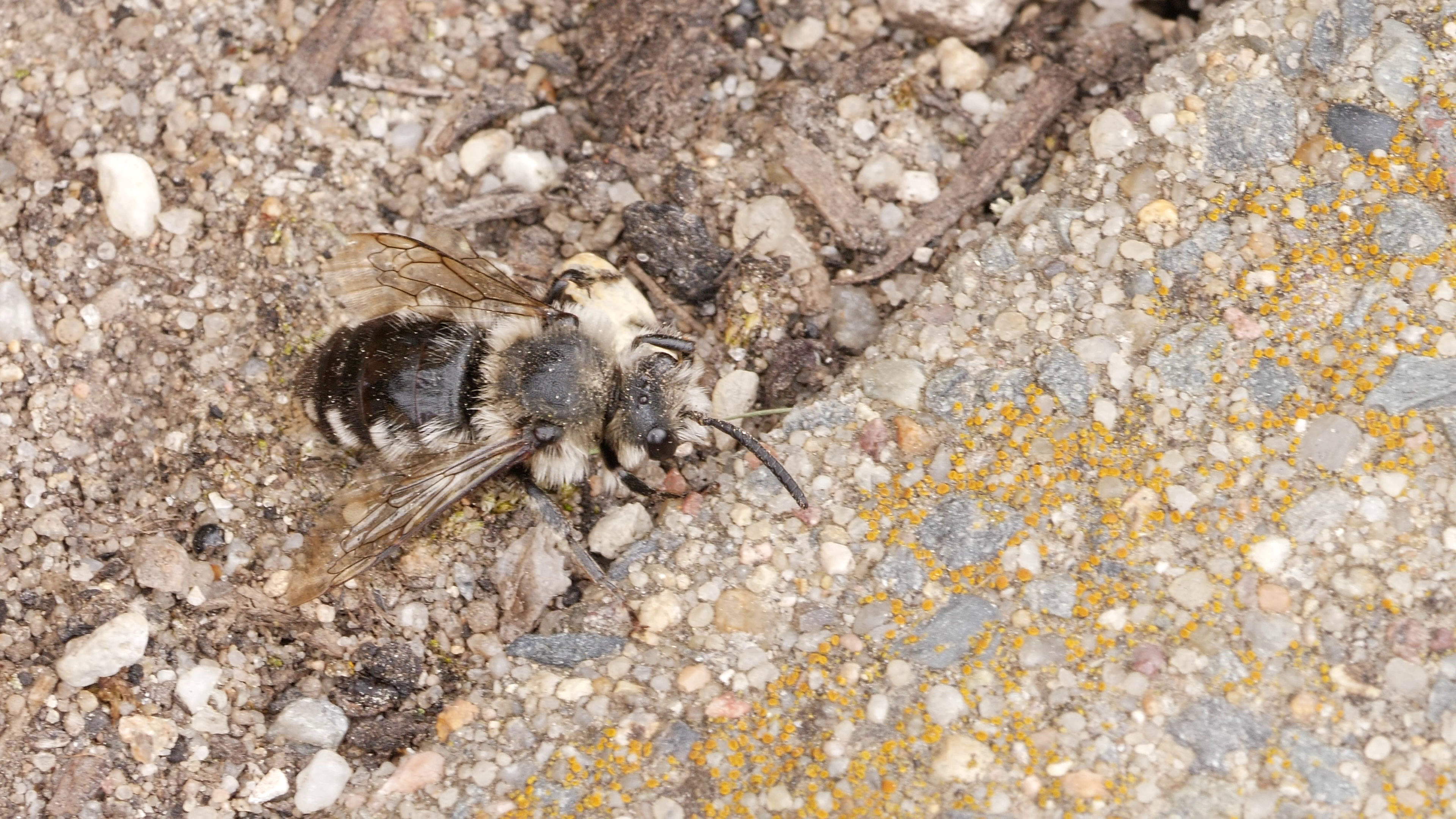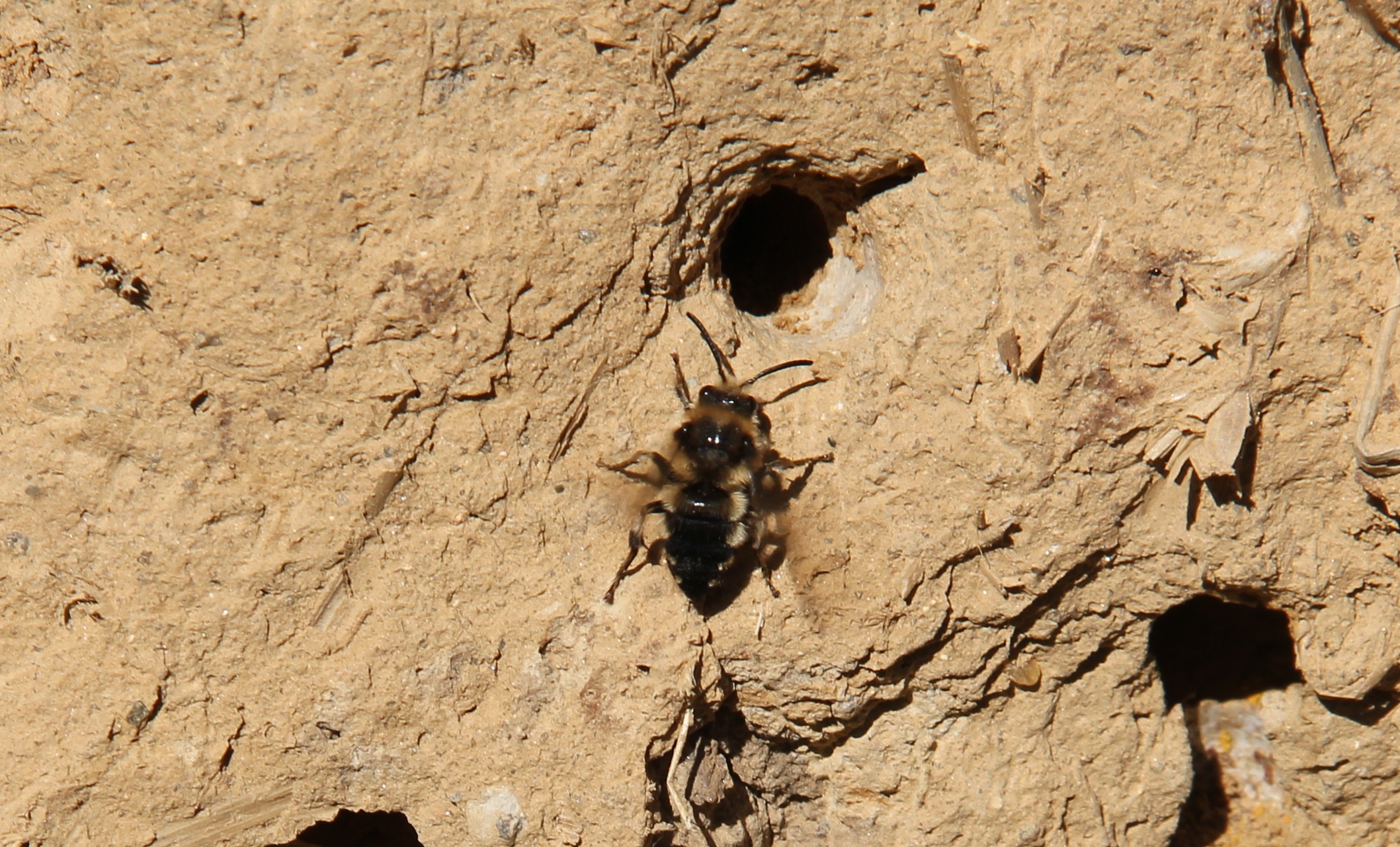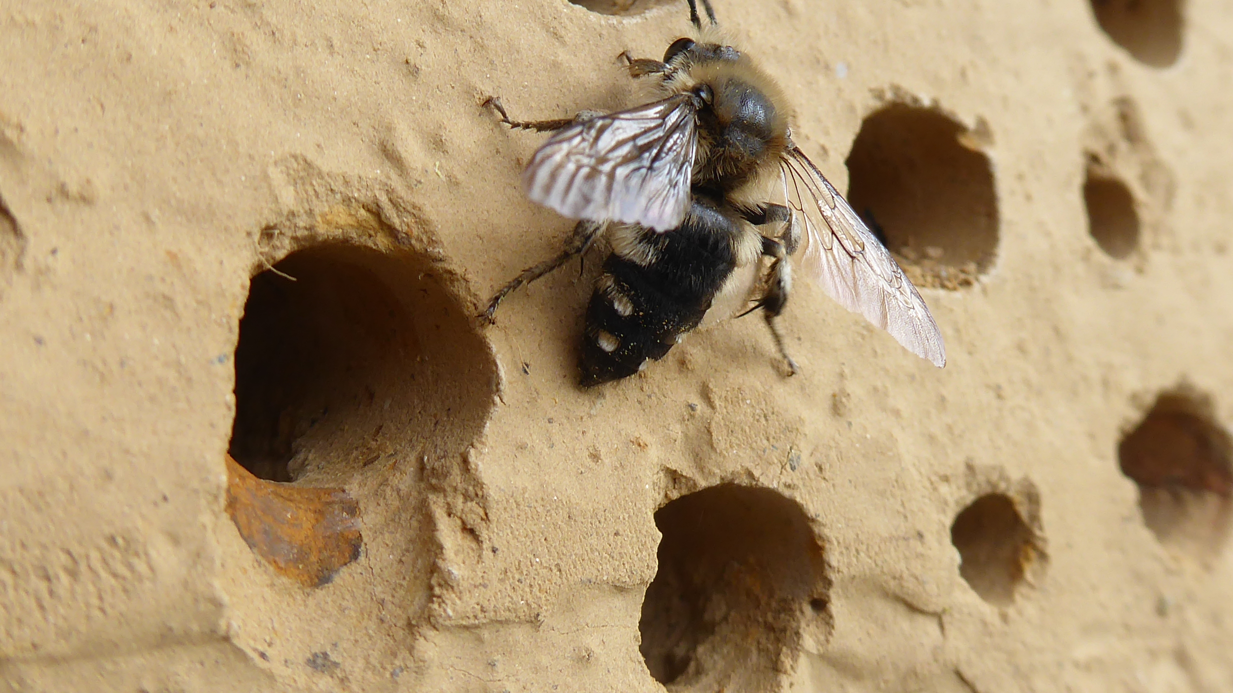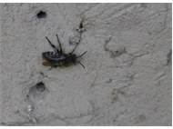 Gemeine Trauerbiene (Melecta albifrons (Foerster, 1771)), Weibchen, Exemplar mit reinweißen Haarflecken; Anthophora plumipes-Weibchen versuchen erfolglos, es von ihren Niststätten zu vertreiben; Roßwein OT Gleisberg, 26.04.2020 (© Andreas Hurtig)( Bild vergrößern)