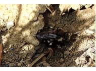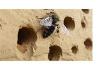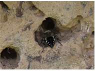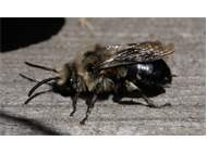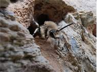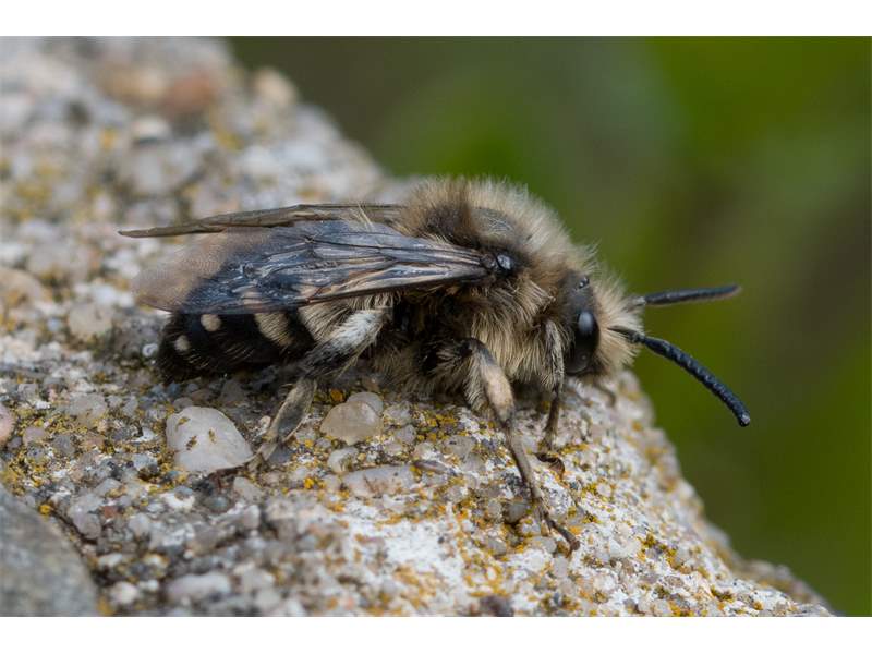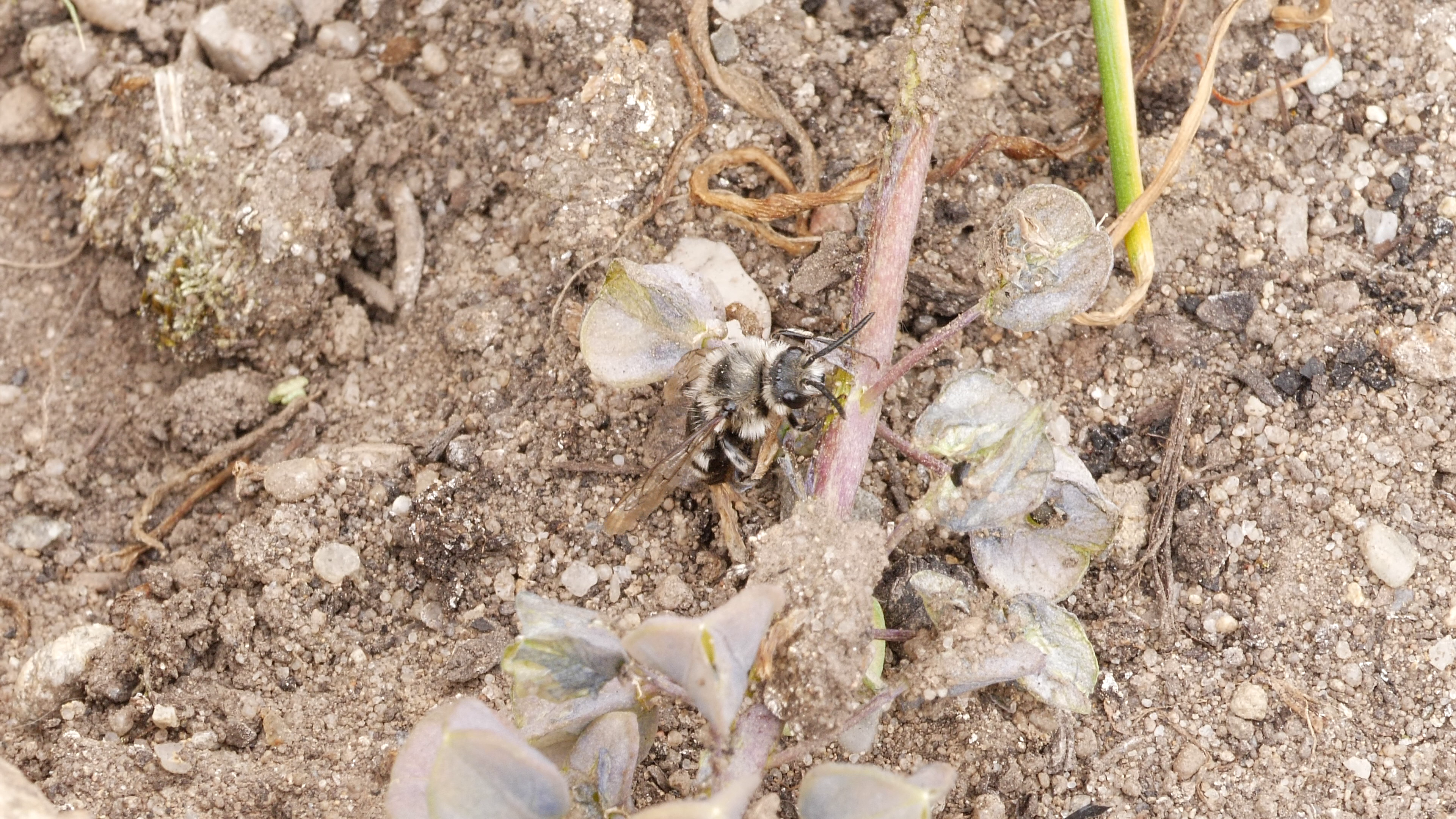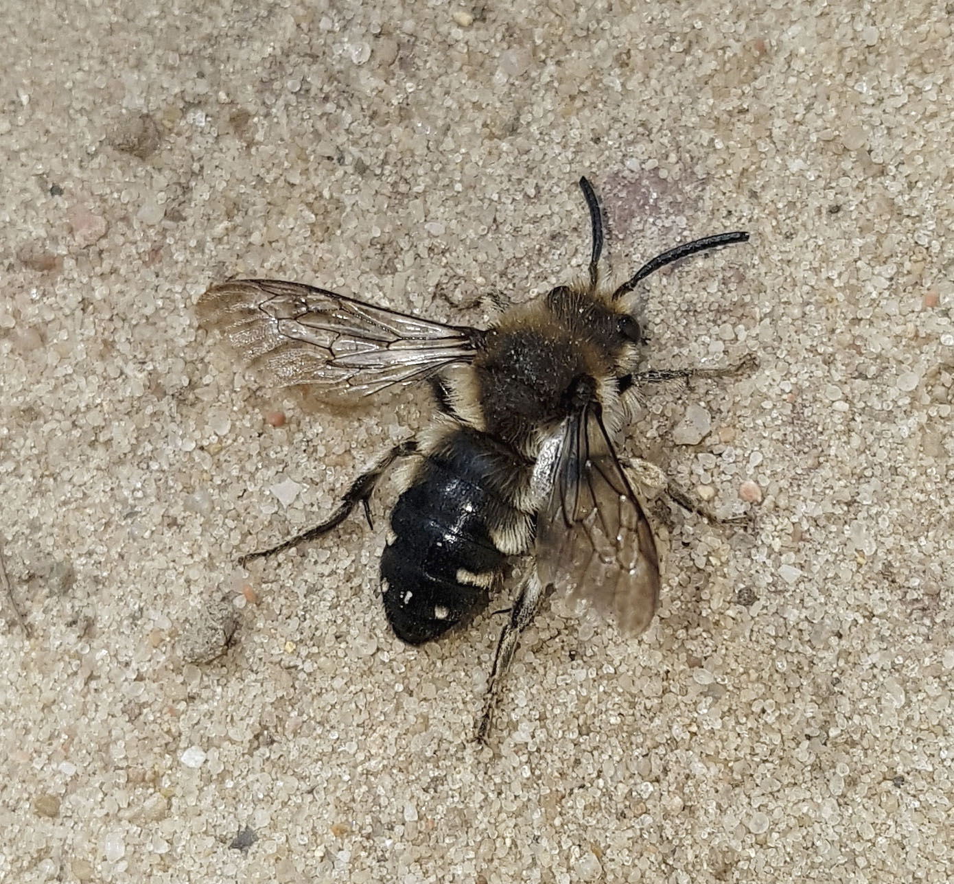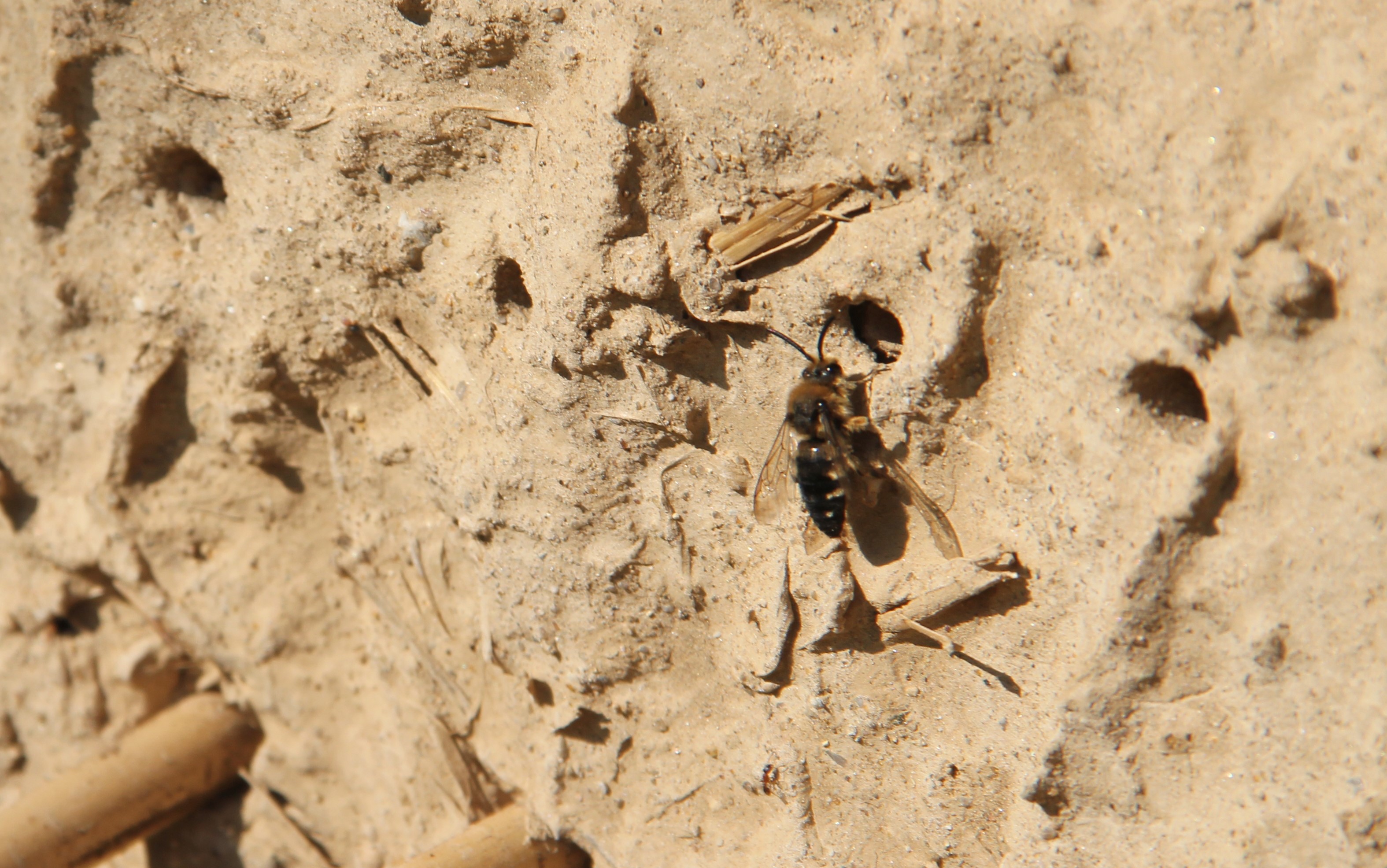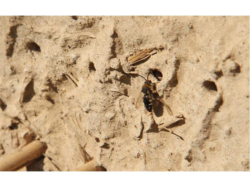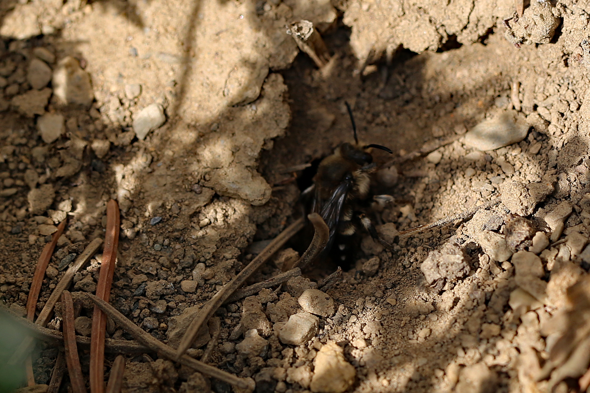 Gemeine Trauerbiene (Melecta albifrons (Foerster, 1771)), Weibchen, Exemplar mit reinweißen Haarflecken; Anthophora plumipes-Weibchen versuchen erfolglos, es von ihren Niststätten zu vertreiben; Roßwein OT Gleisberg, 26.04.2020 (© Andreas Hurtig)( Bild vergrößern)
