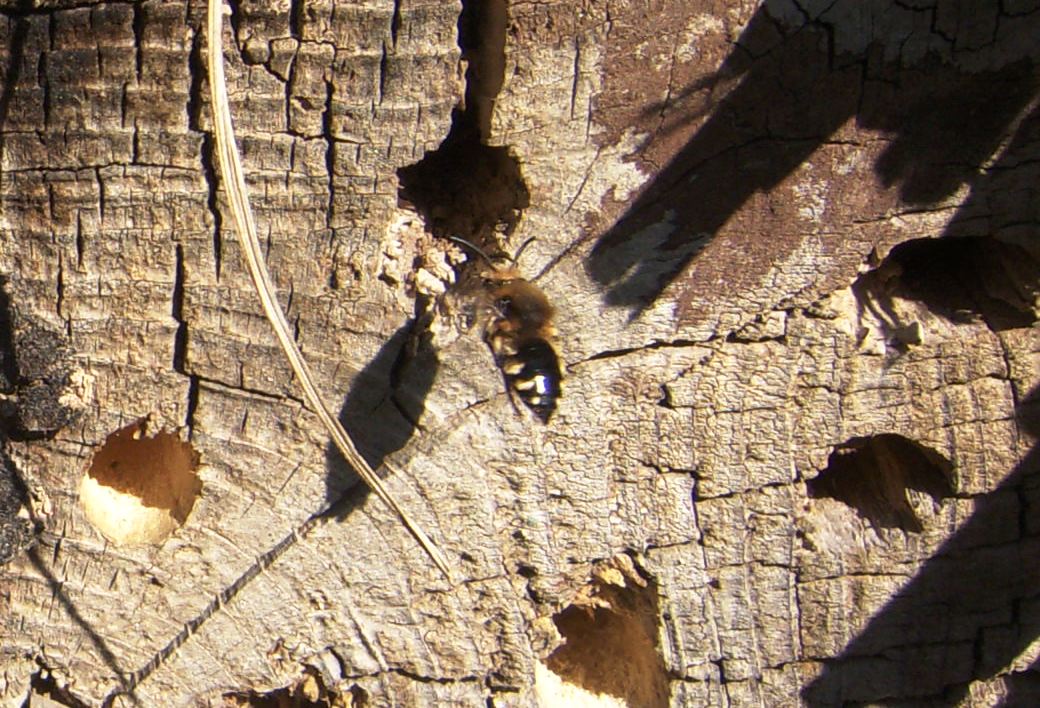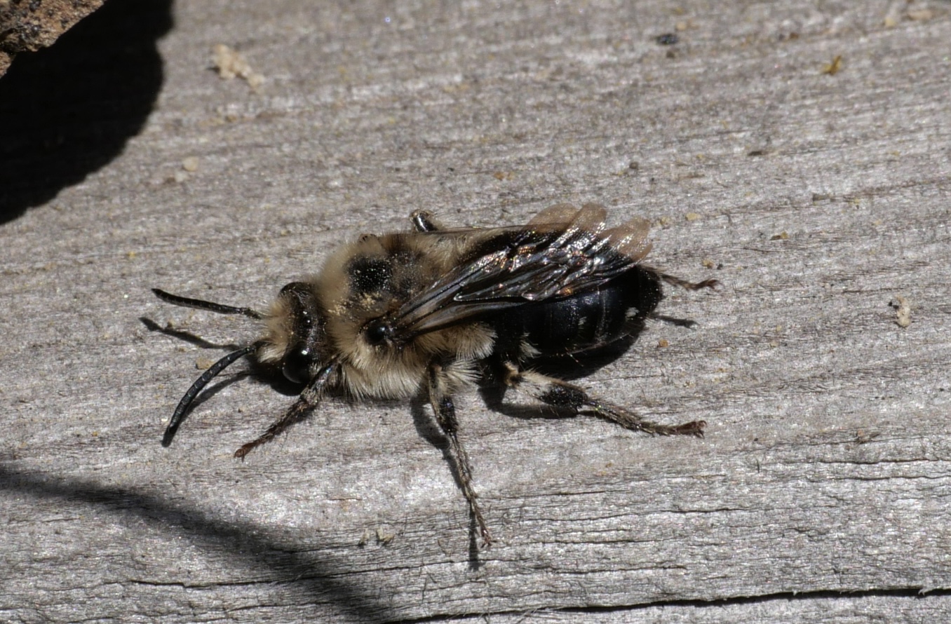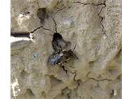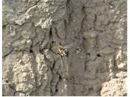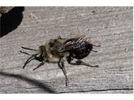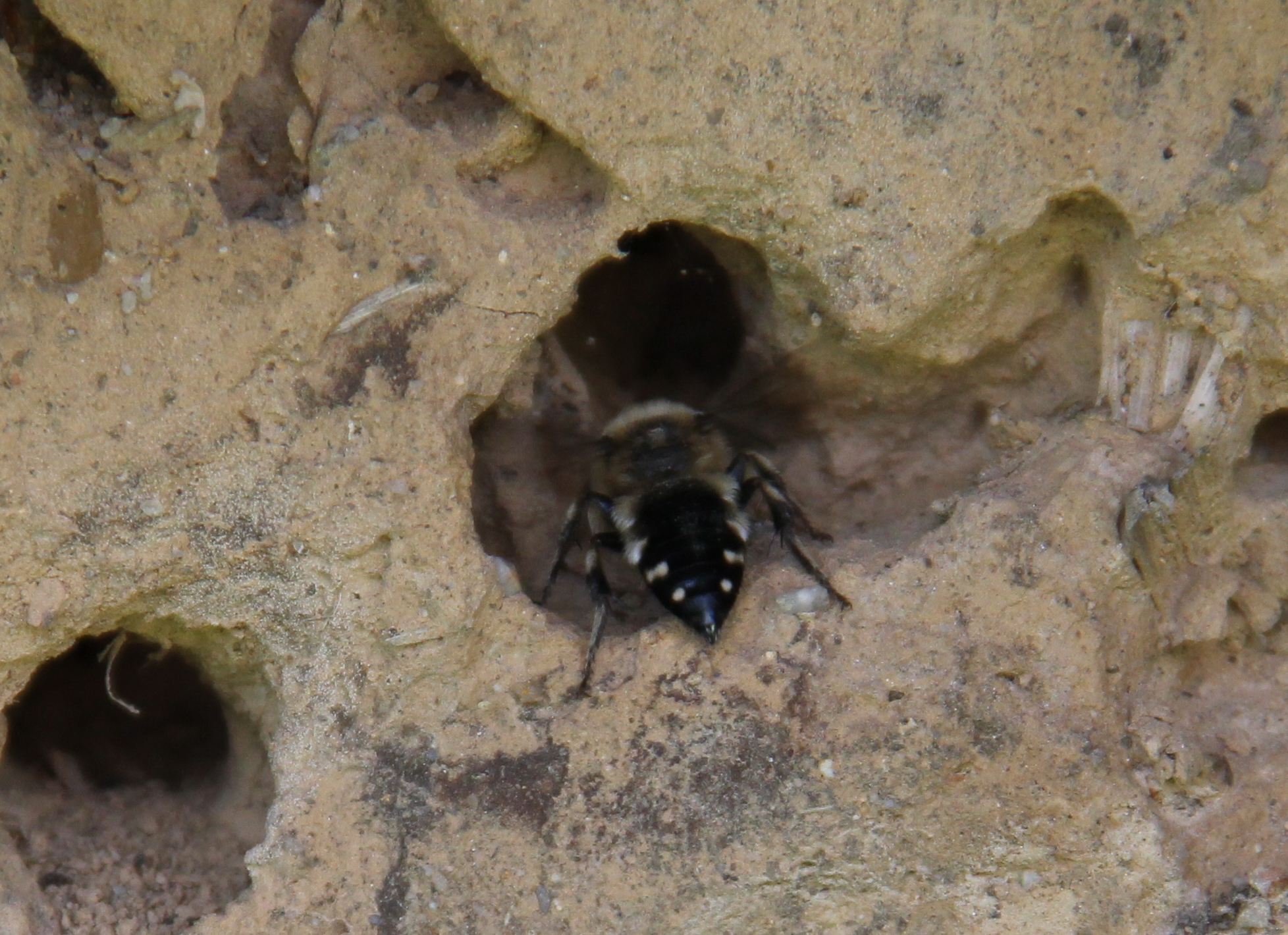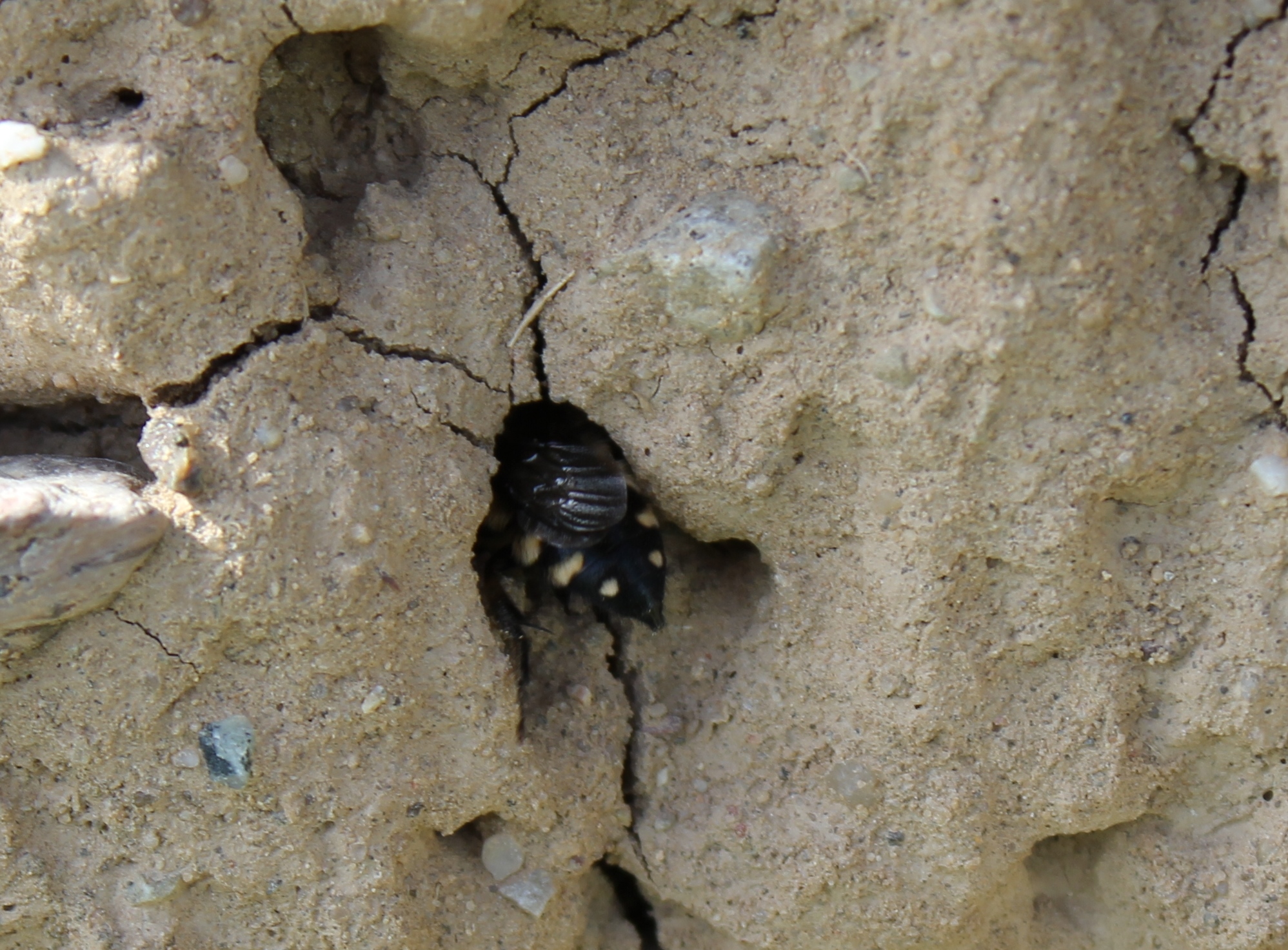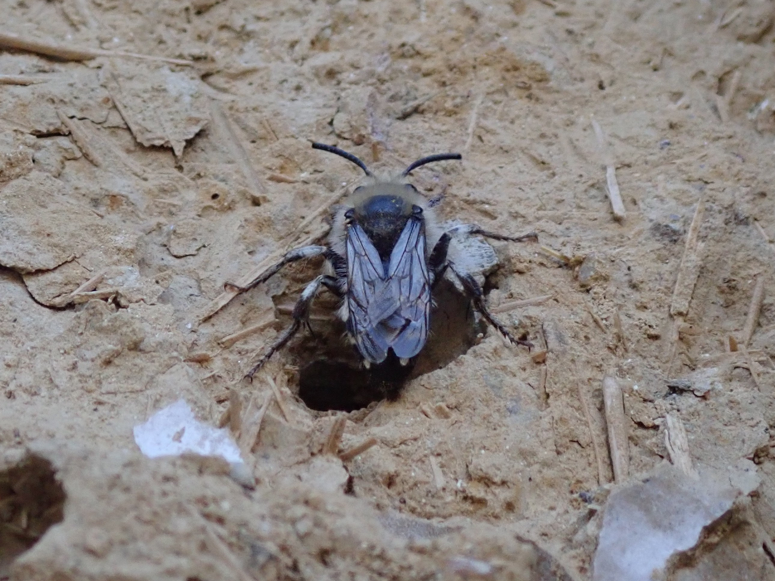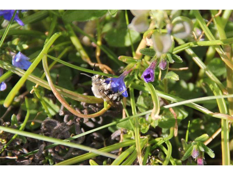 Gemeine Trauerbiene (Melecta albifrons (Foerster, 1771)), Weibchen, Exemplar mit reinweißen Haarflecken; Anthophora plumipes-Weibchen versuchen erfolglos, es von ihren Niststätten zu vertreiben; Roßwein OT Gleisberg, 26.04.2020 (© Andreas Hurtig)( Bild vergrößern)