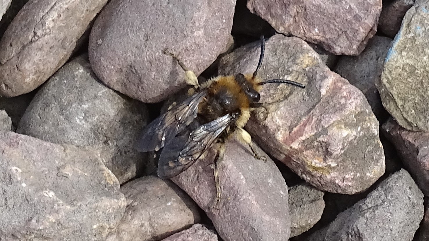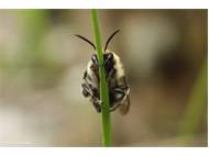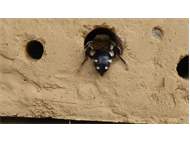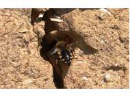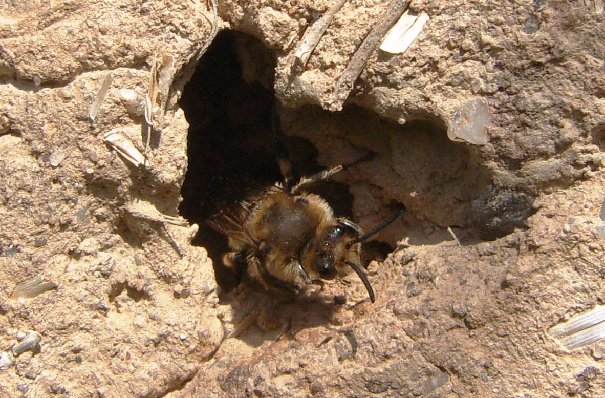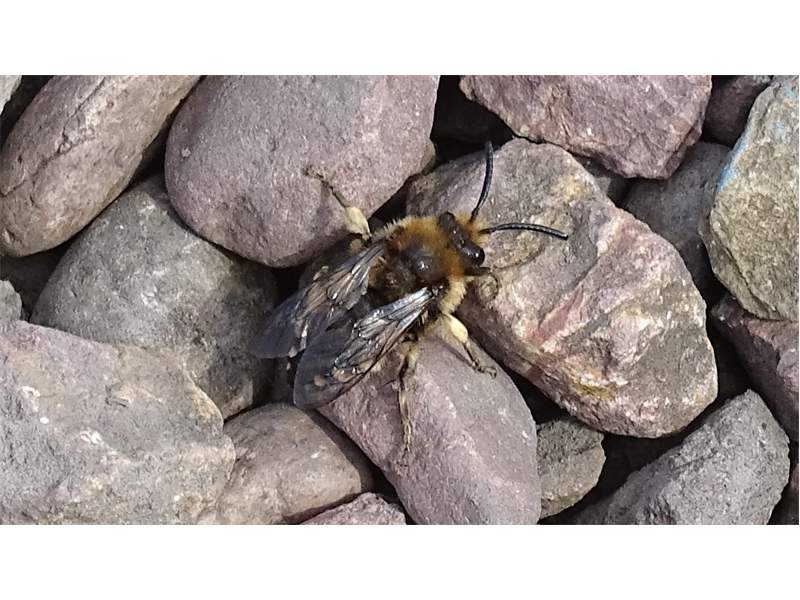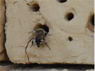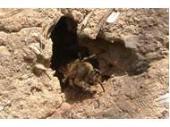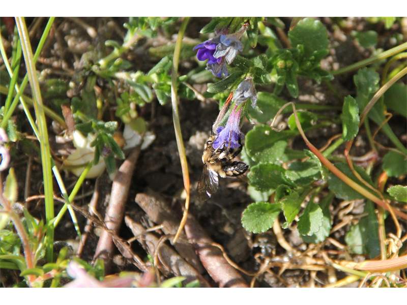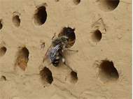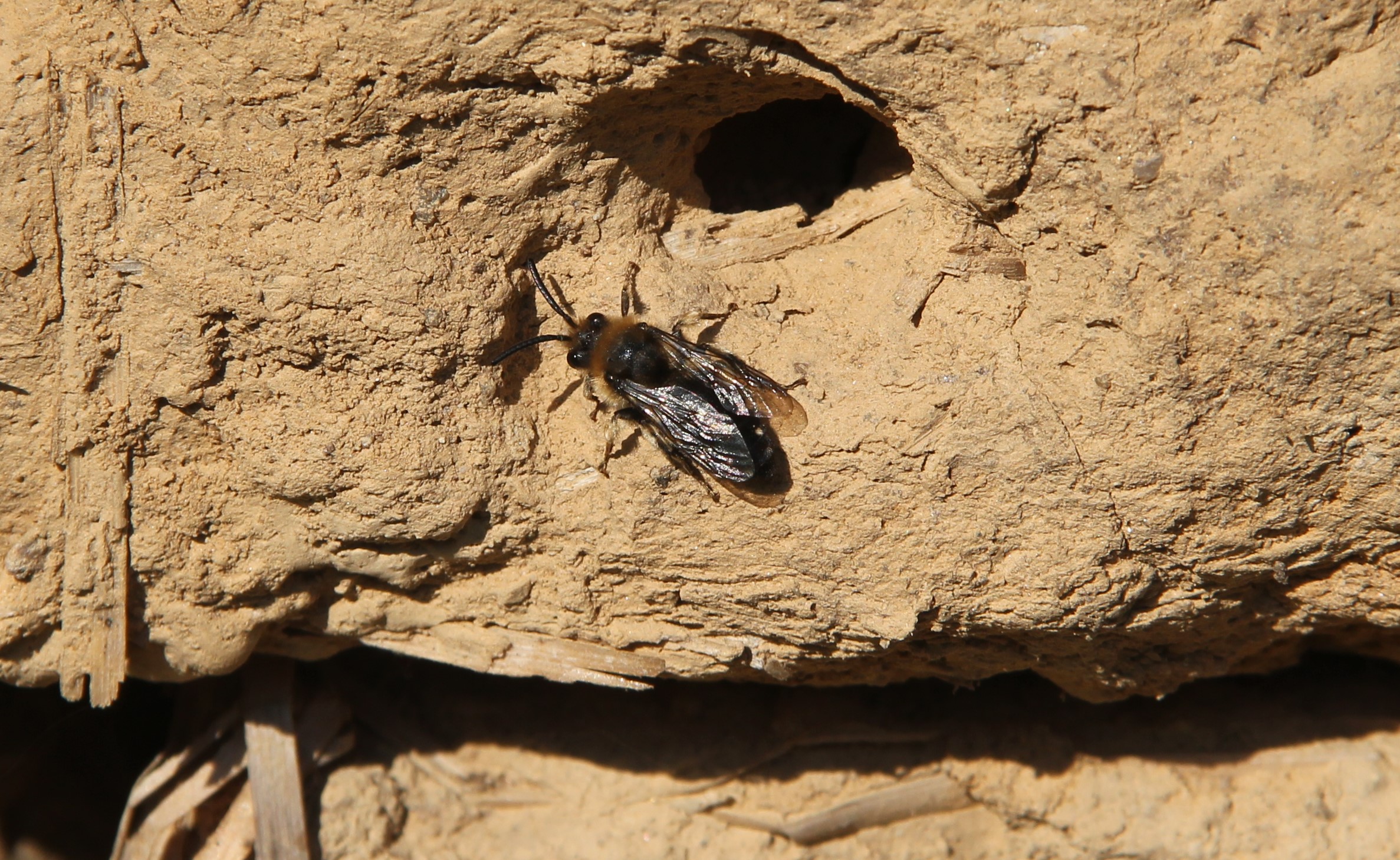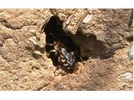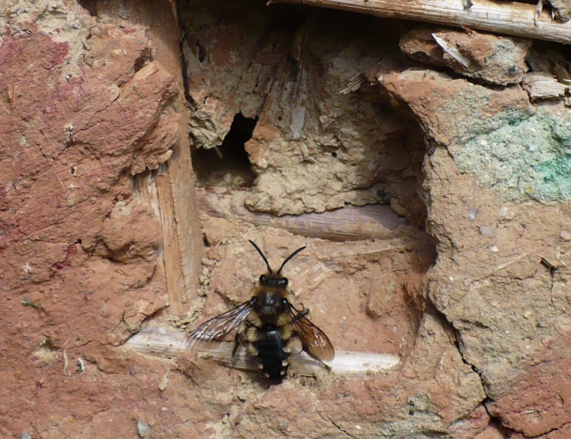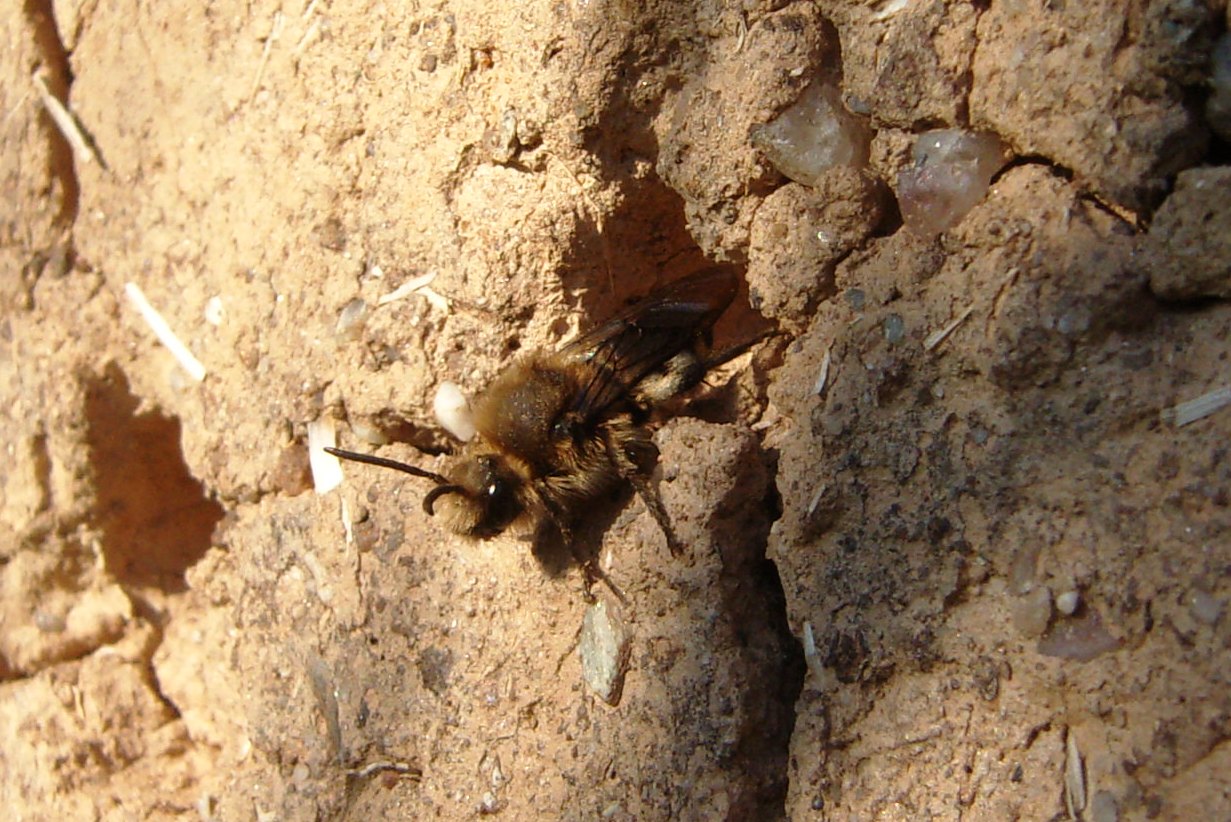Gemeine Trauerbiene (Melecta albifrons (Foerster, 1771)), Weibchen, Exemplar mit reinweißen Haarflecken; Anthophora plumipes-Weibchen versuchen erfolglos, es von ihren Niststätten zu vertreiben; Roßwein OT Gleisberg, 26.04.2020 (© Andreas Hurtig)( Bild vergrößern)