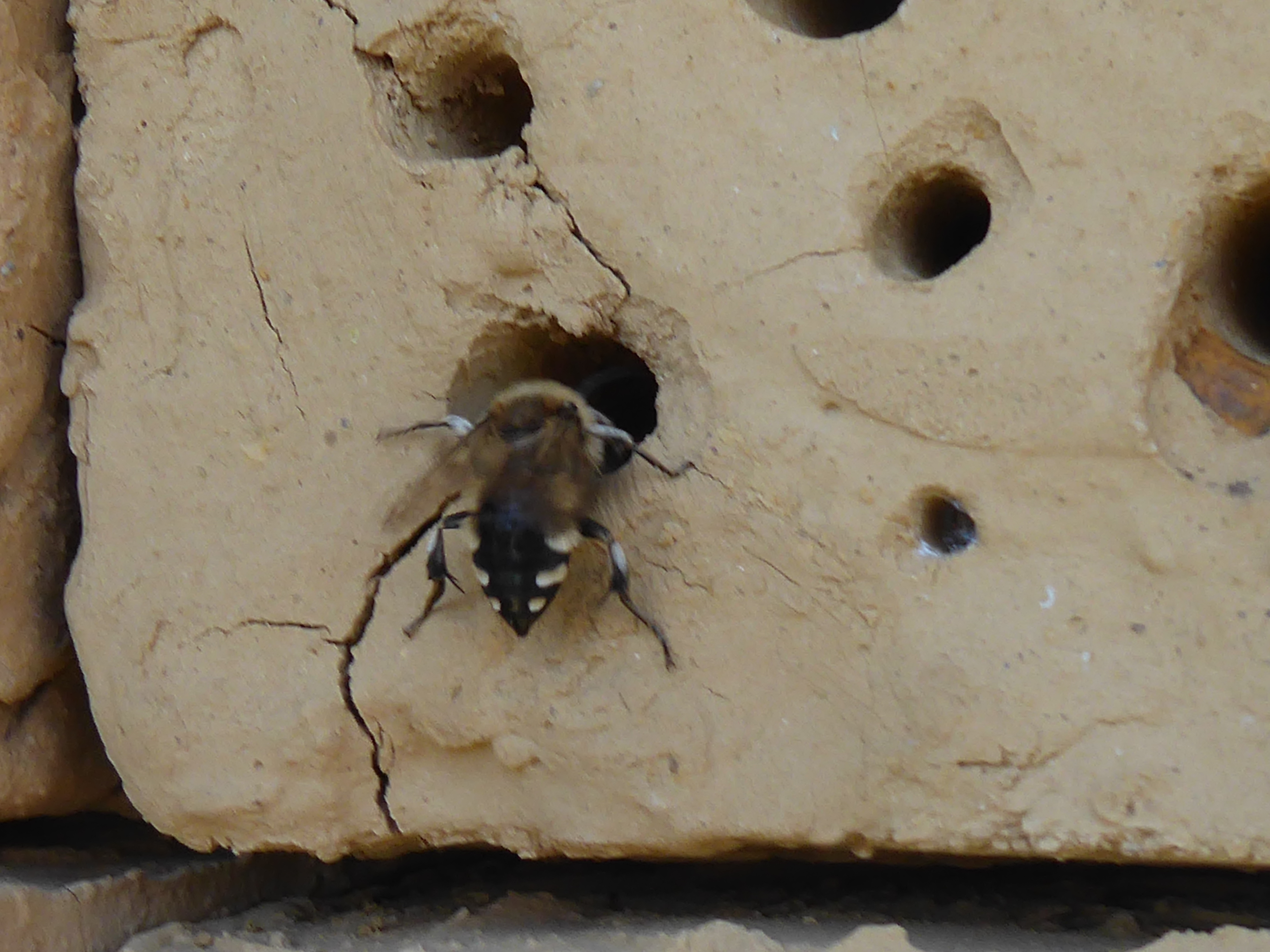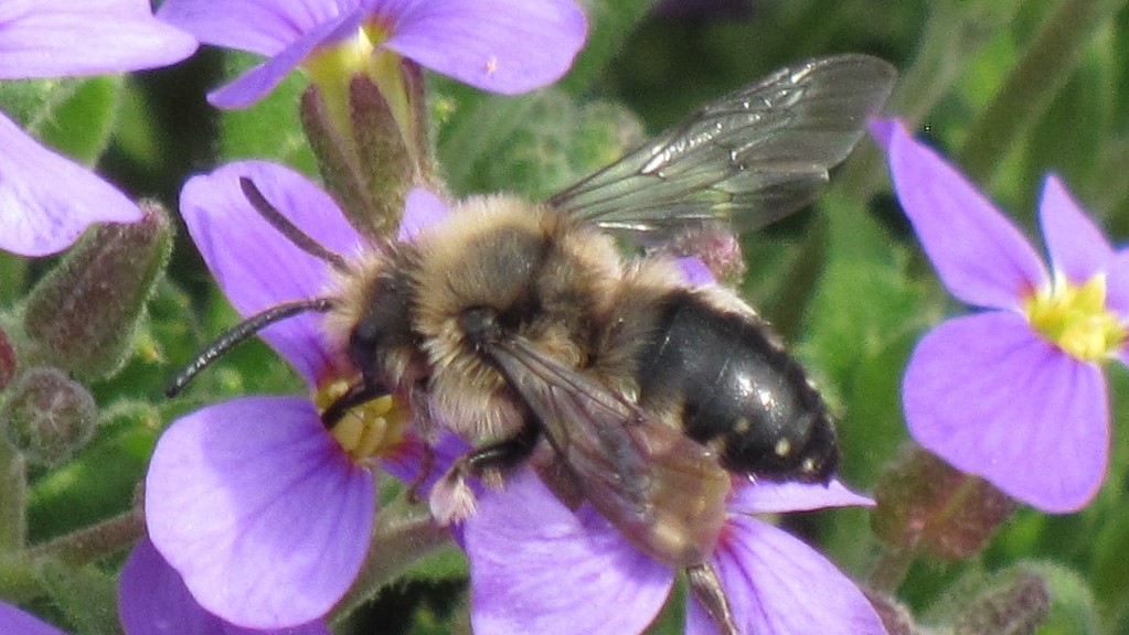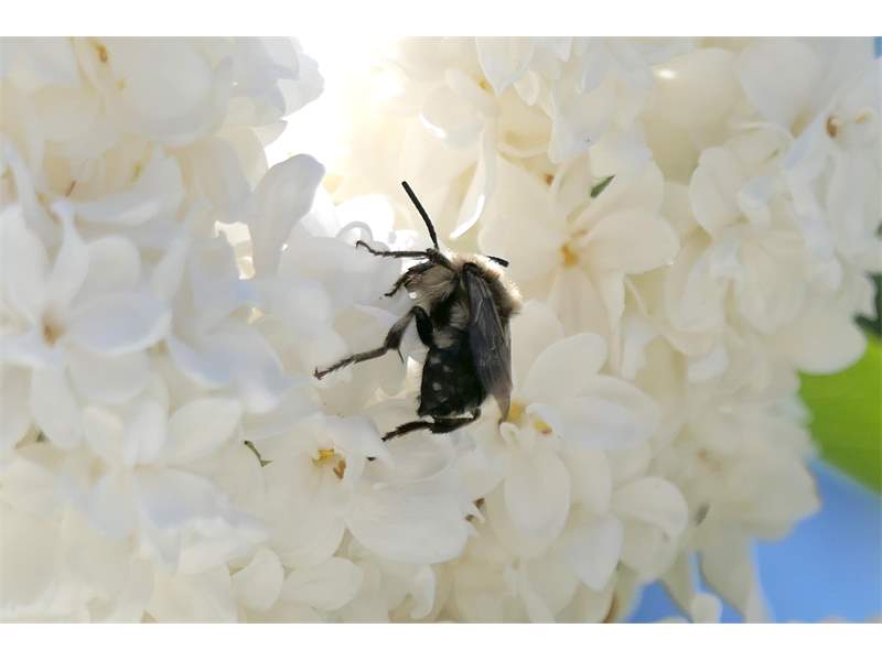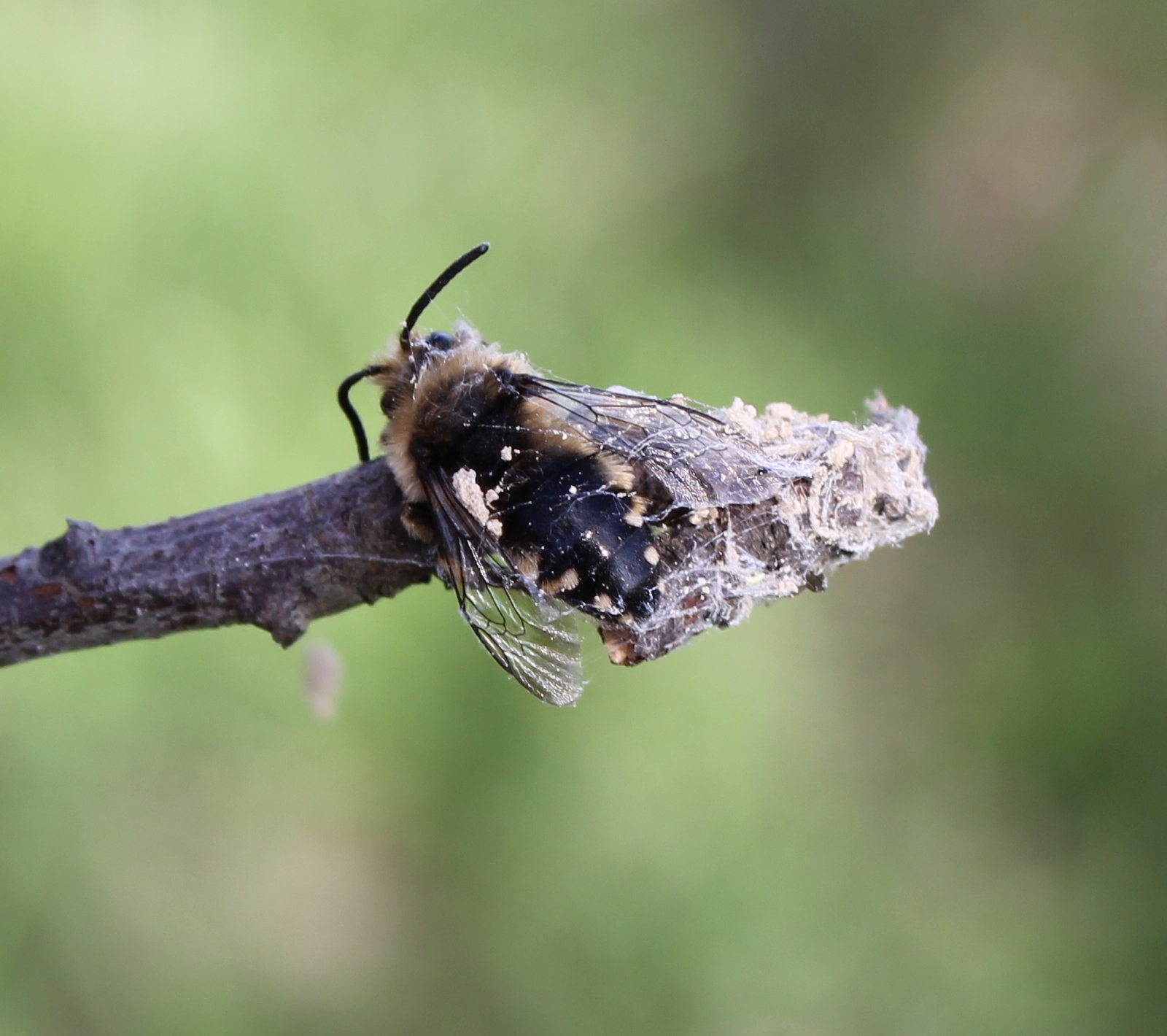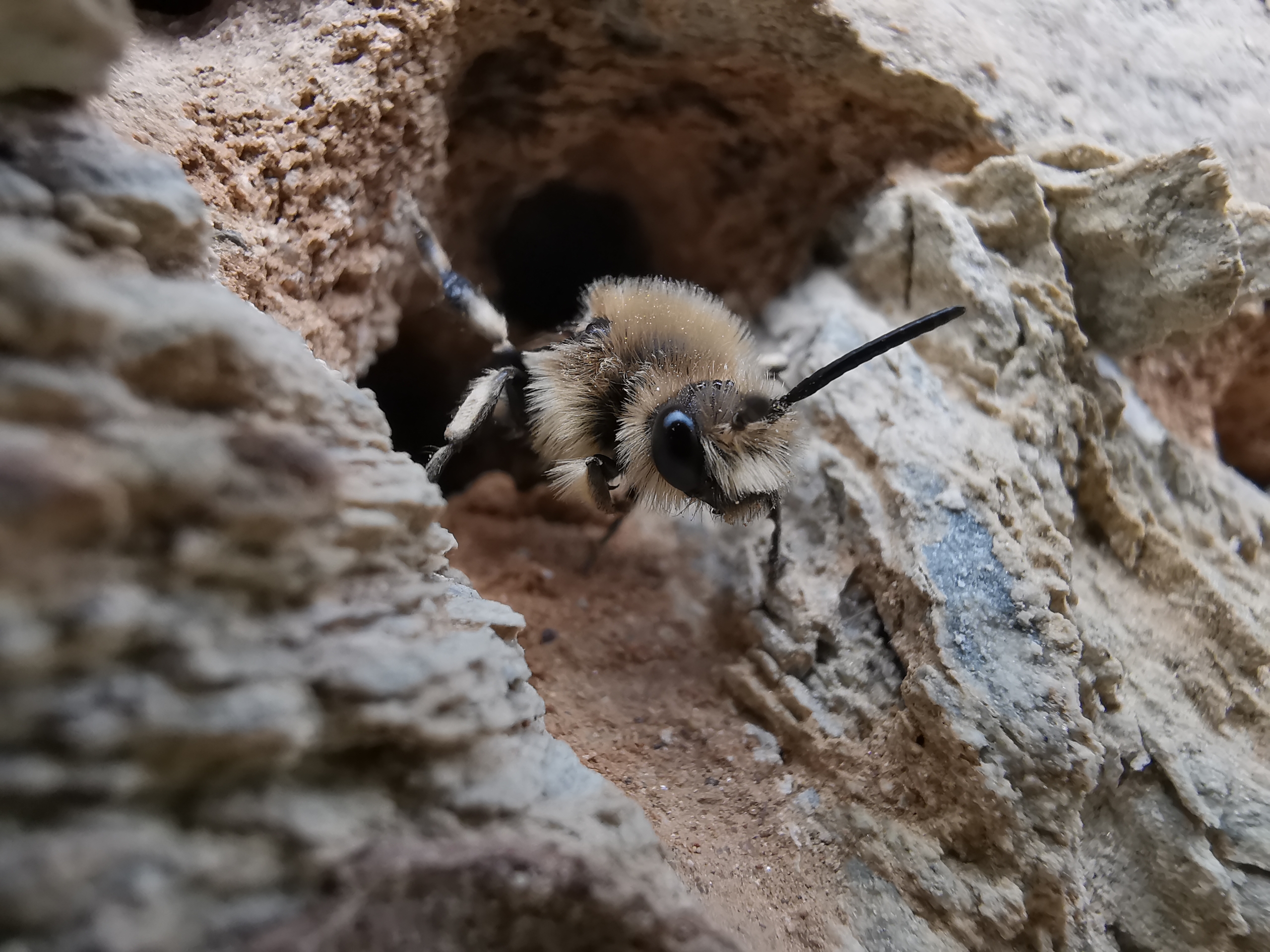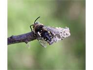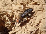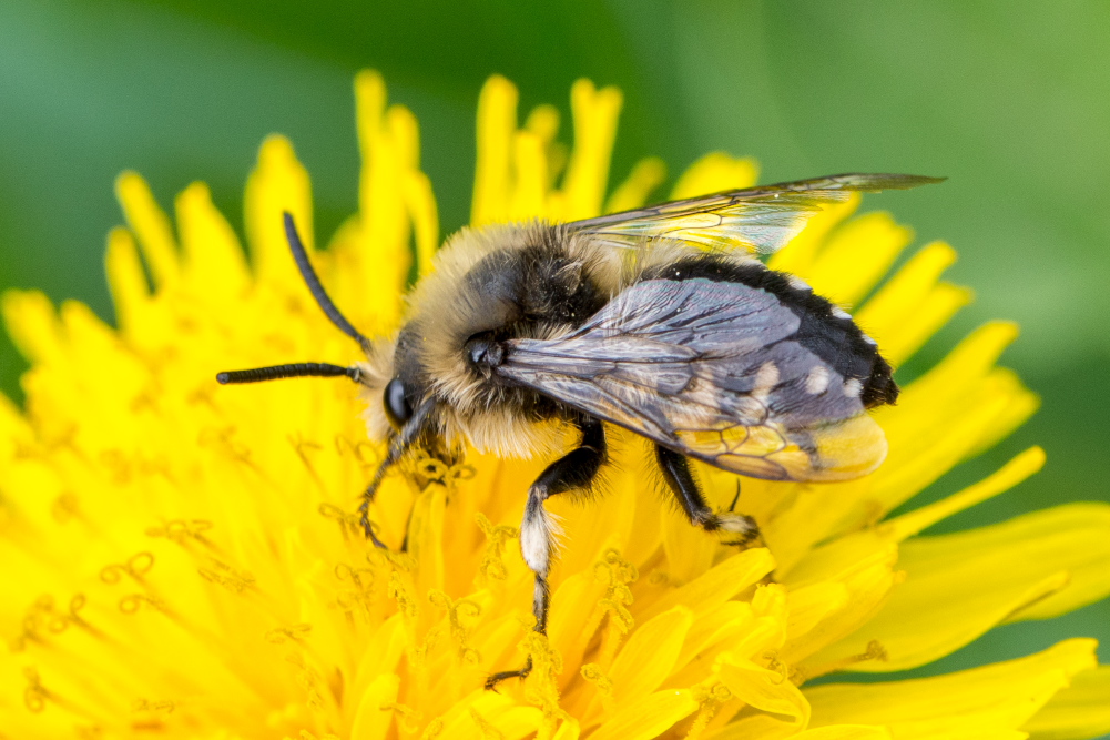 Gemeine Trauerbiene (Melecta albifrons (Foerster, 1771)), Weibchen, Exemplar mit reinweißen Haarflecken; Anthophora plumipes-Weibchen versuchen erfolglos, es von ihren Niststätten zu vertreiben; Roßwein OT Gleisberg, 26.04.2020 (© Andreas Hurtig)( Bild vergrößern)