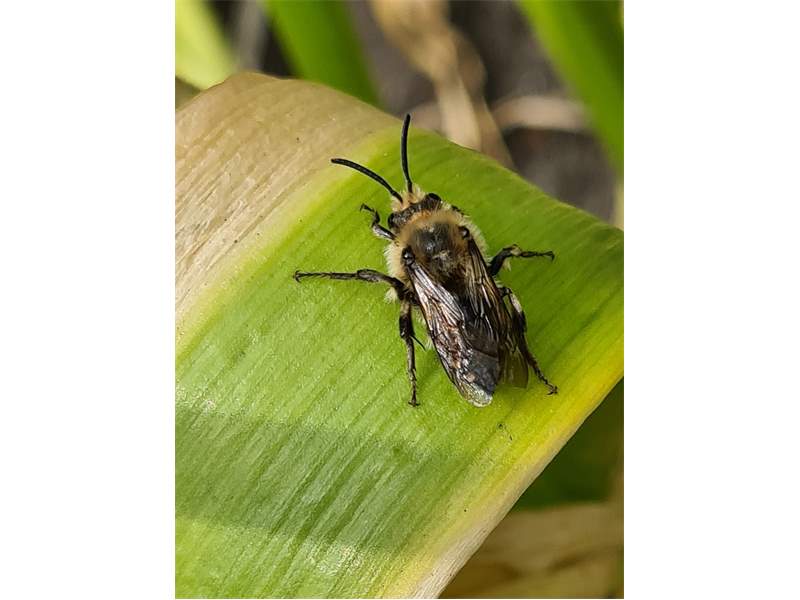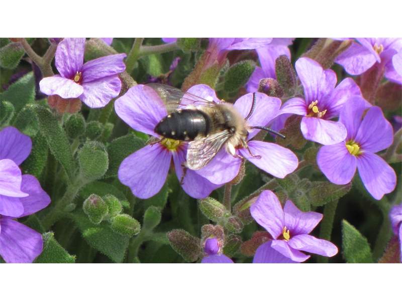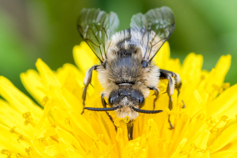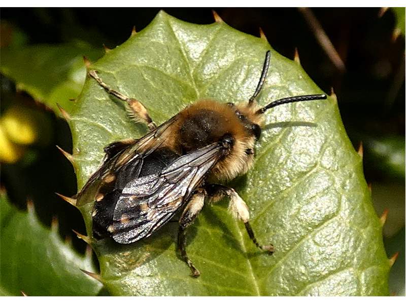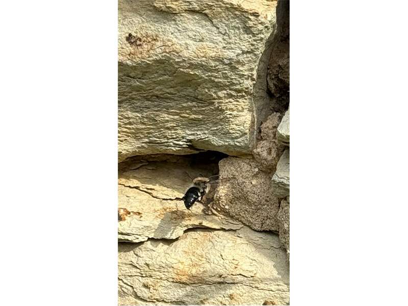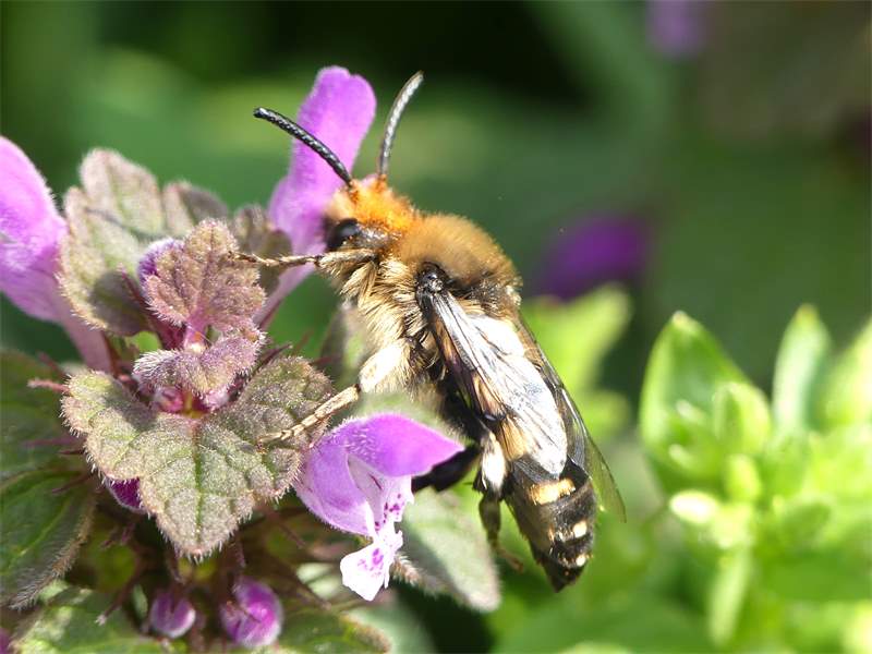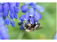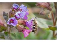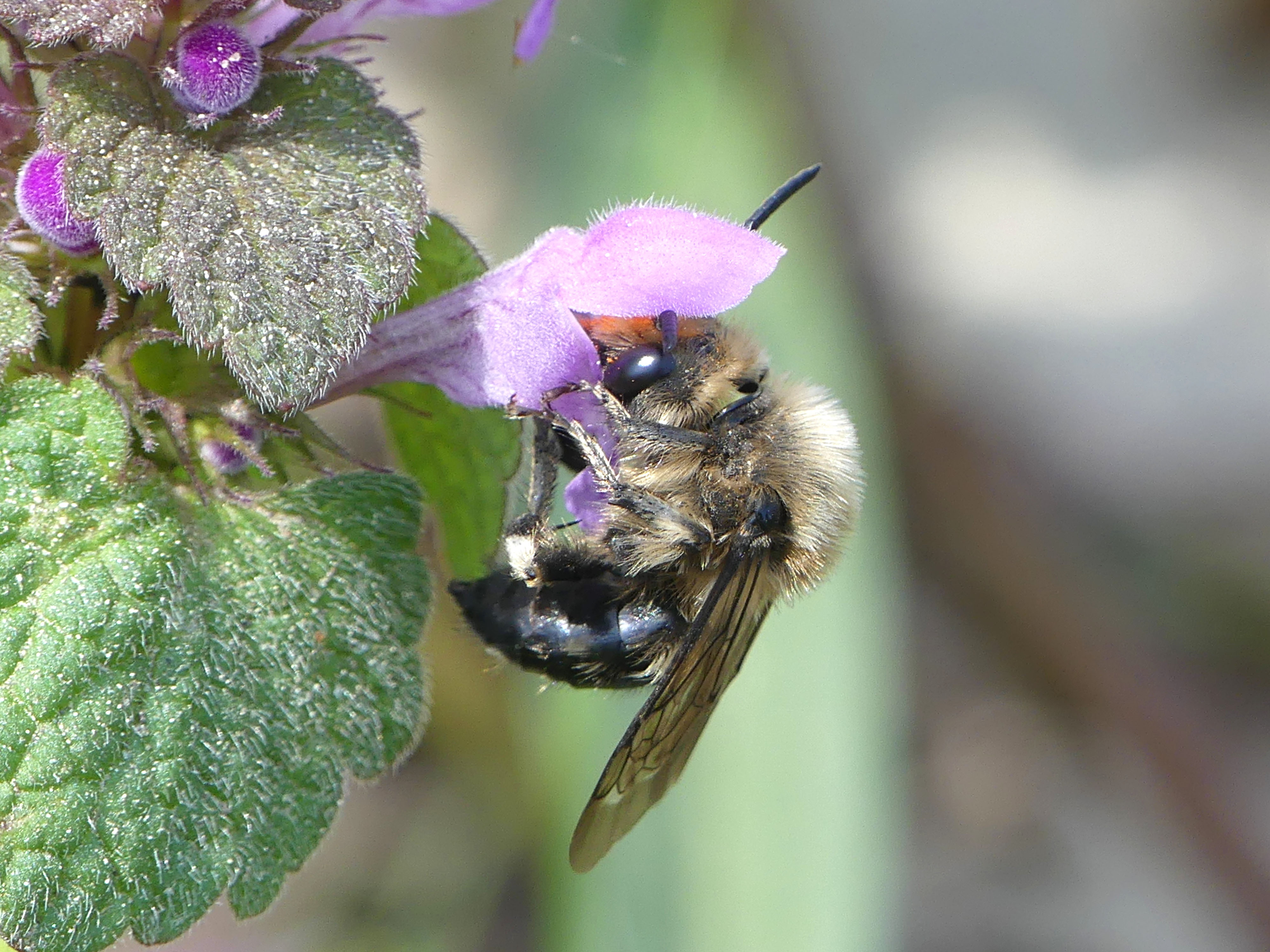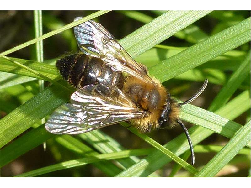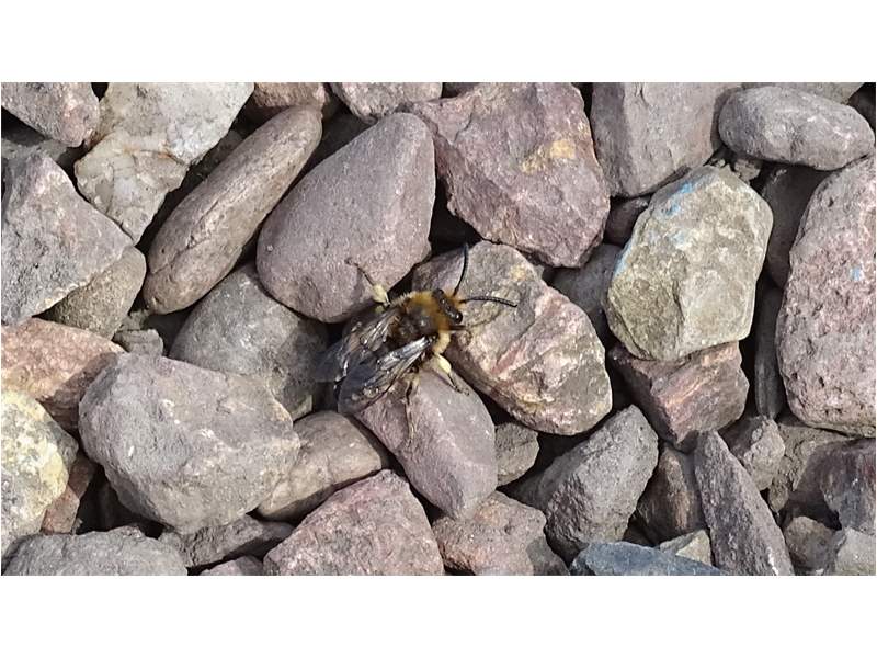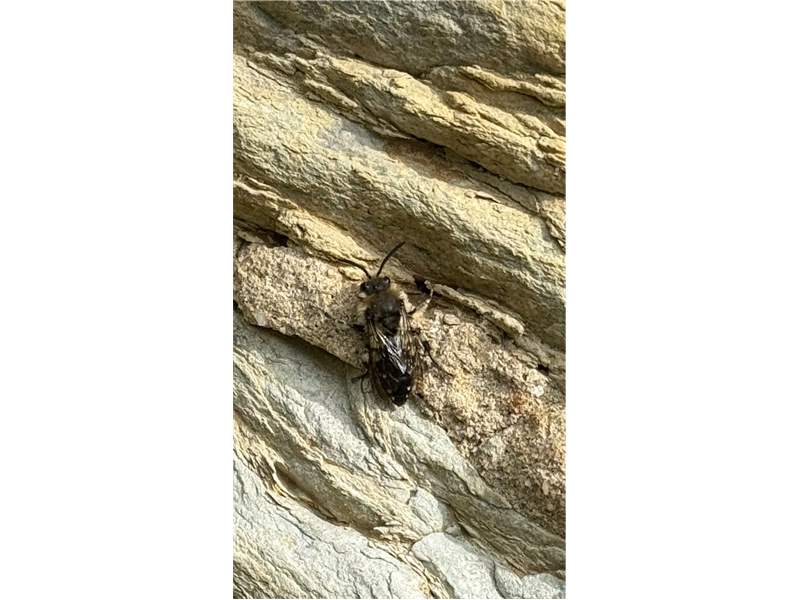 Gemeine Trauerbiene (Melecta albifrons (Foerster, 1771)), Weibchen, Exemplar mit reinweißen Haarflecken; Anthophora plumipes-Weibchen versuchen erfolglos, es von ihren Niststätten zu vertreiben; Roßwein OT Gleisberg, 26.04.2020 (© Andreas Hurtig)( Bild vergrößern)