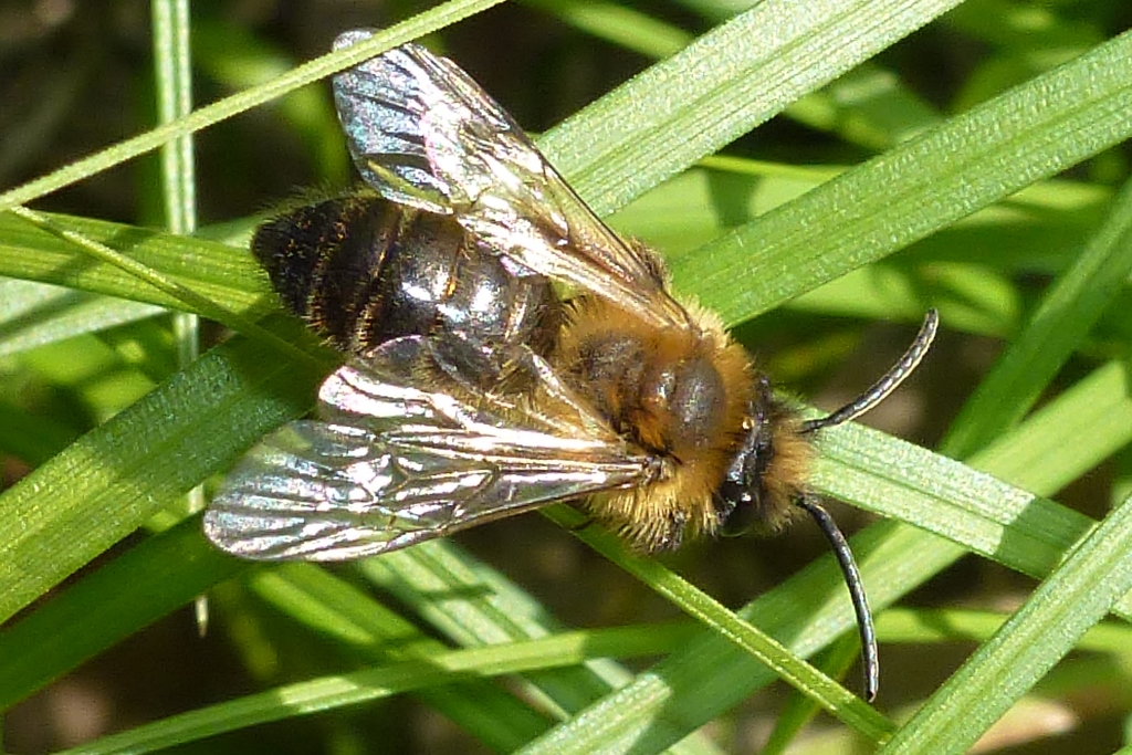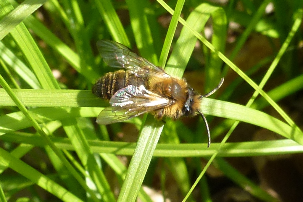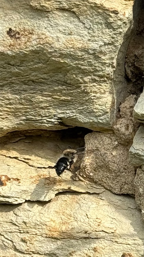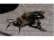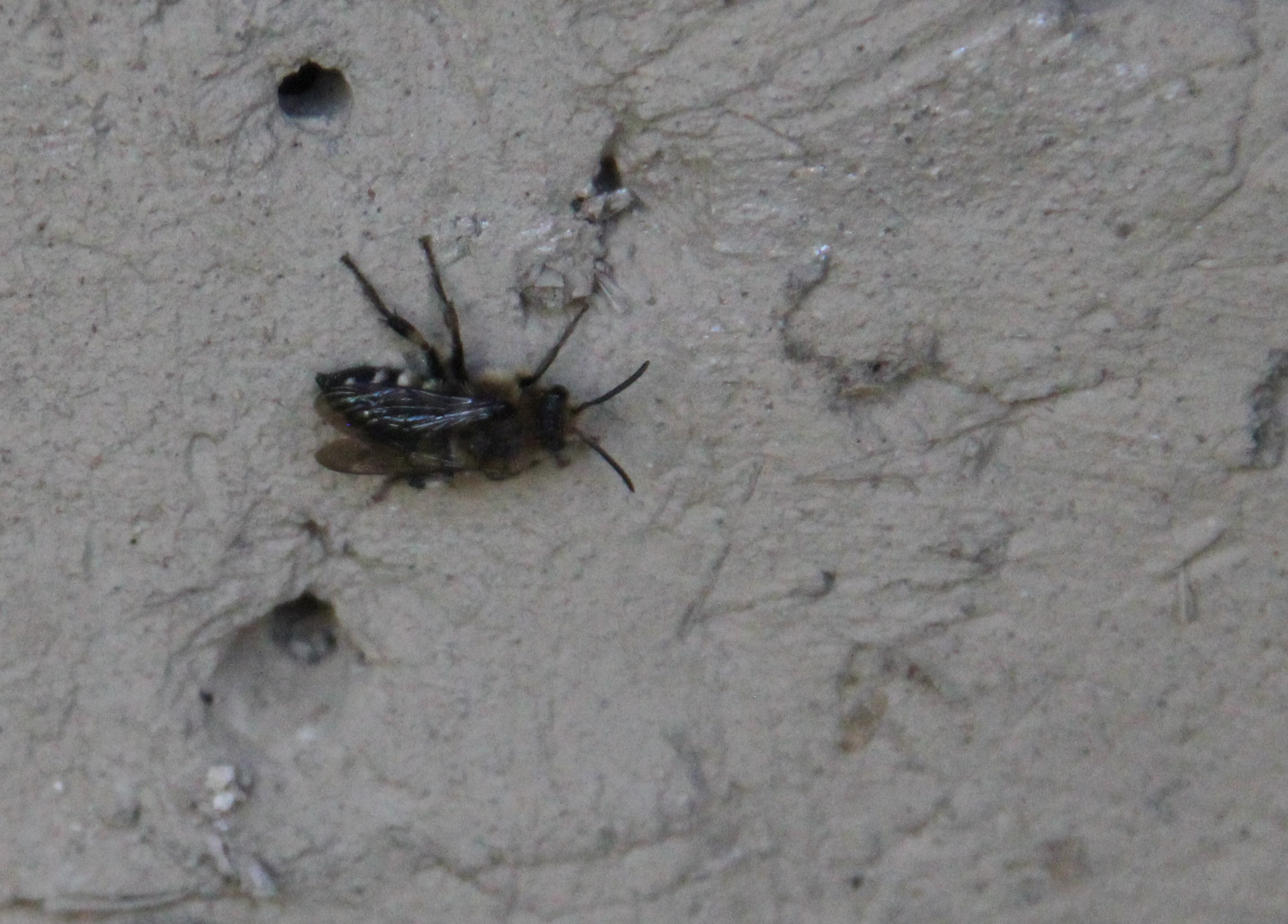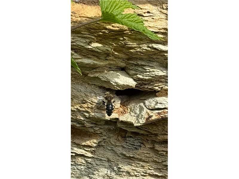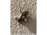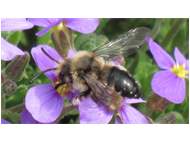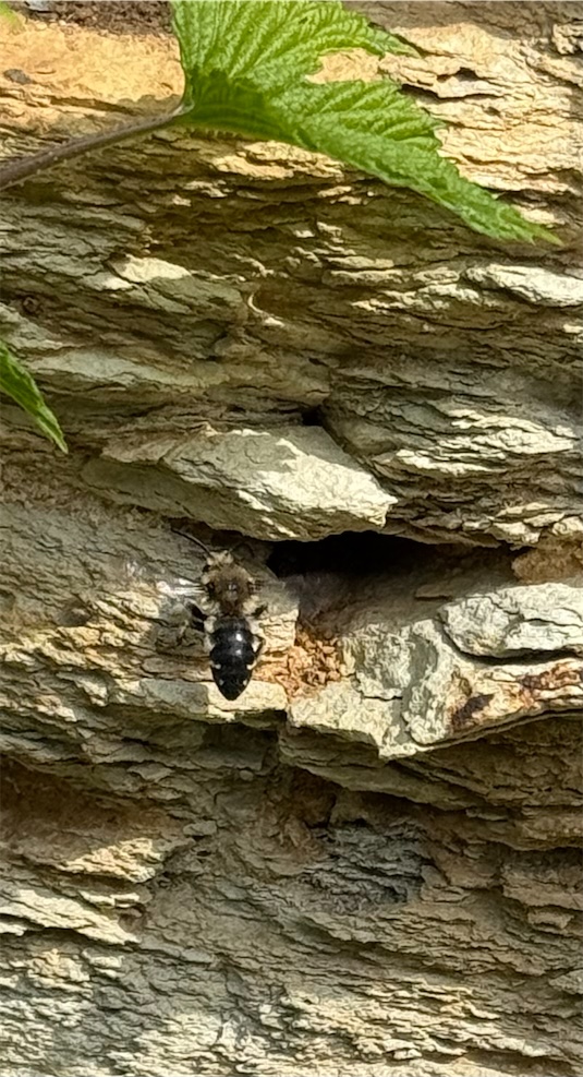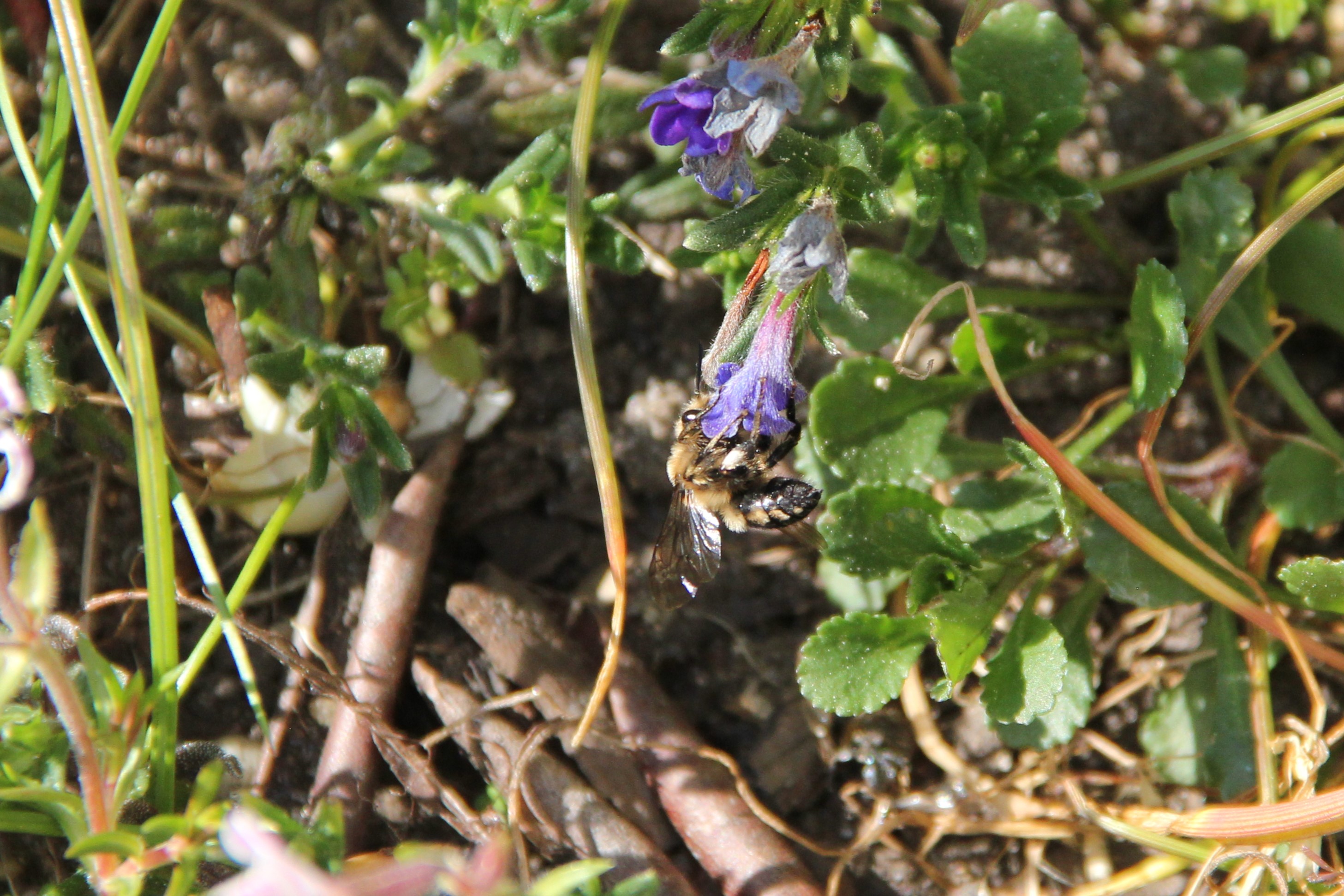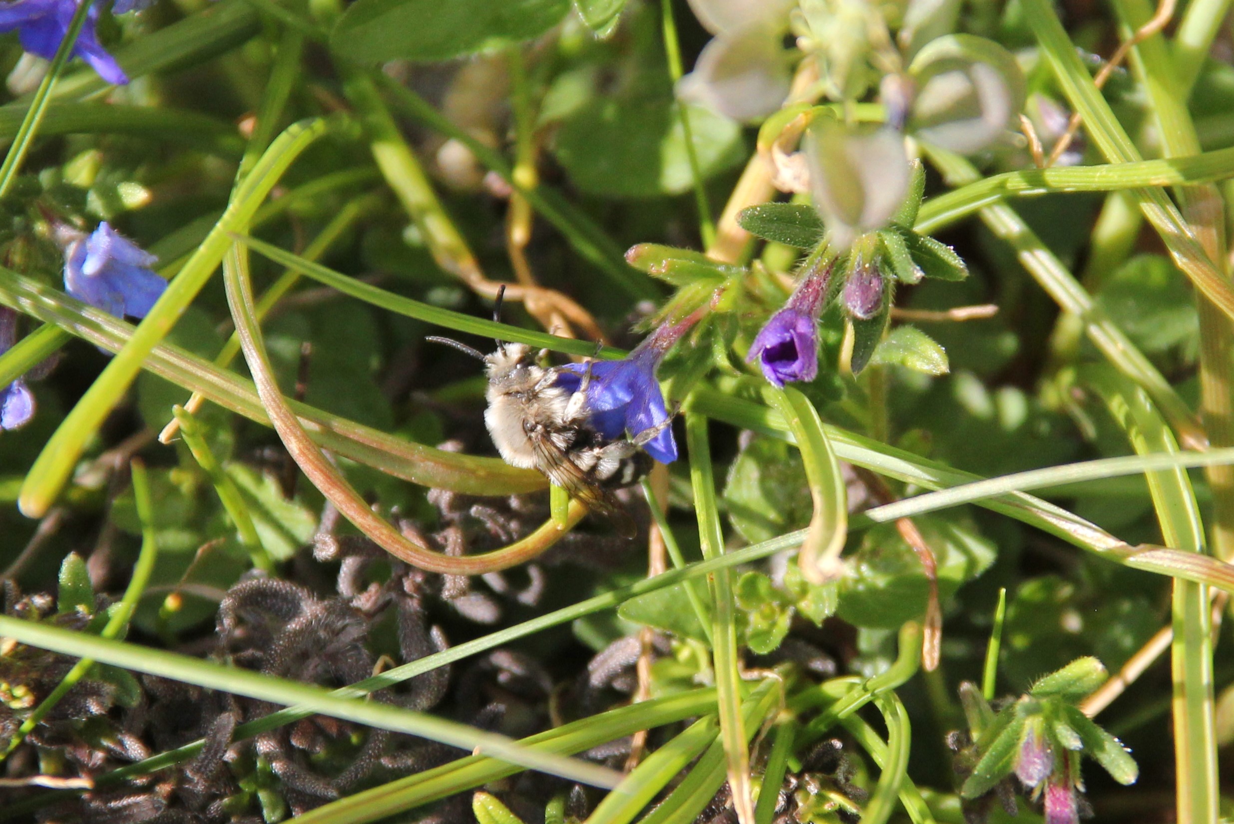 Gemeine Trauerbiene (Melecta albifrons (Foerster, 1771)), Weibchen, Exemplar mit reinweißen Haarflecken; Anthophora plumipes-Weibchen versuchen erfolglos, es von ihren Niststätten zu vertreiben; Roßwein OT Gleisberg, 26.04.2020 (© Andreas Hurtig)( Bild vergrößern)