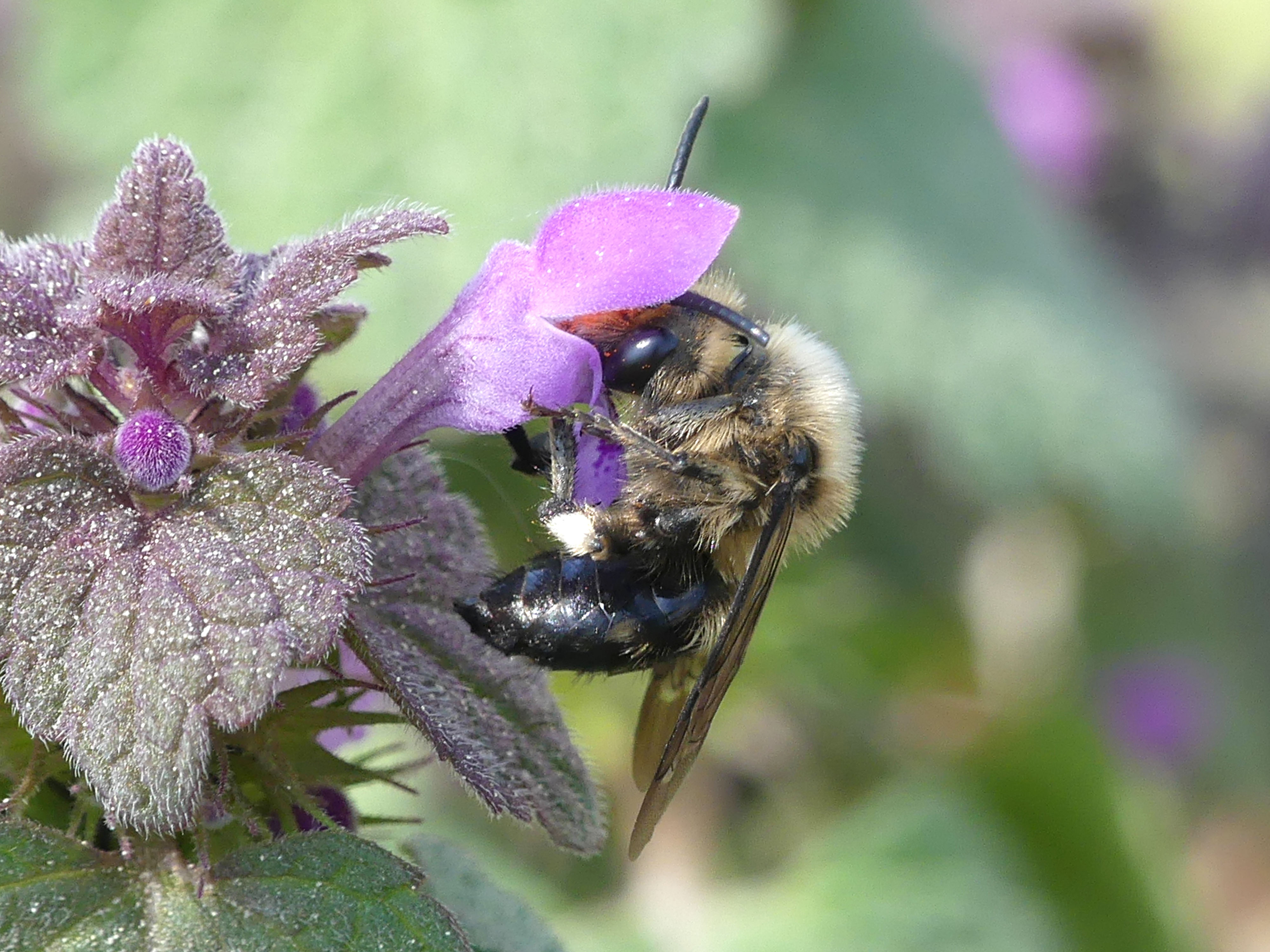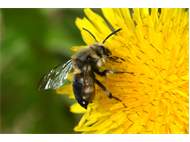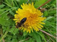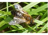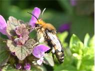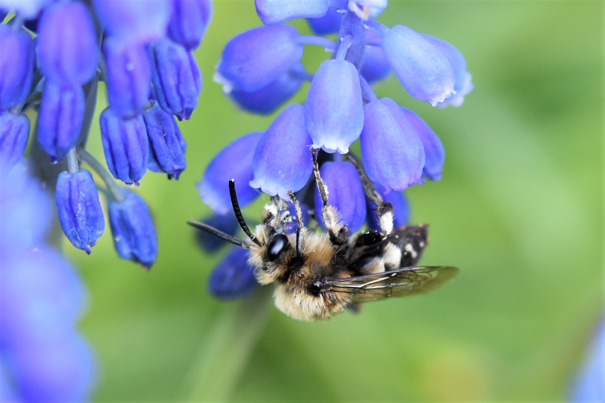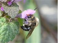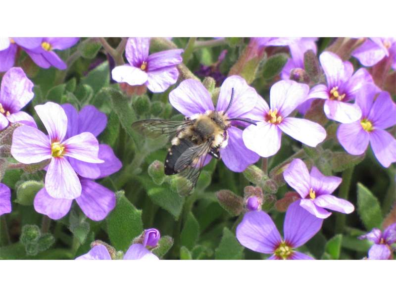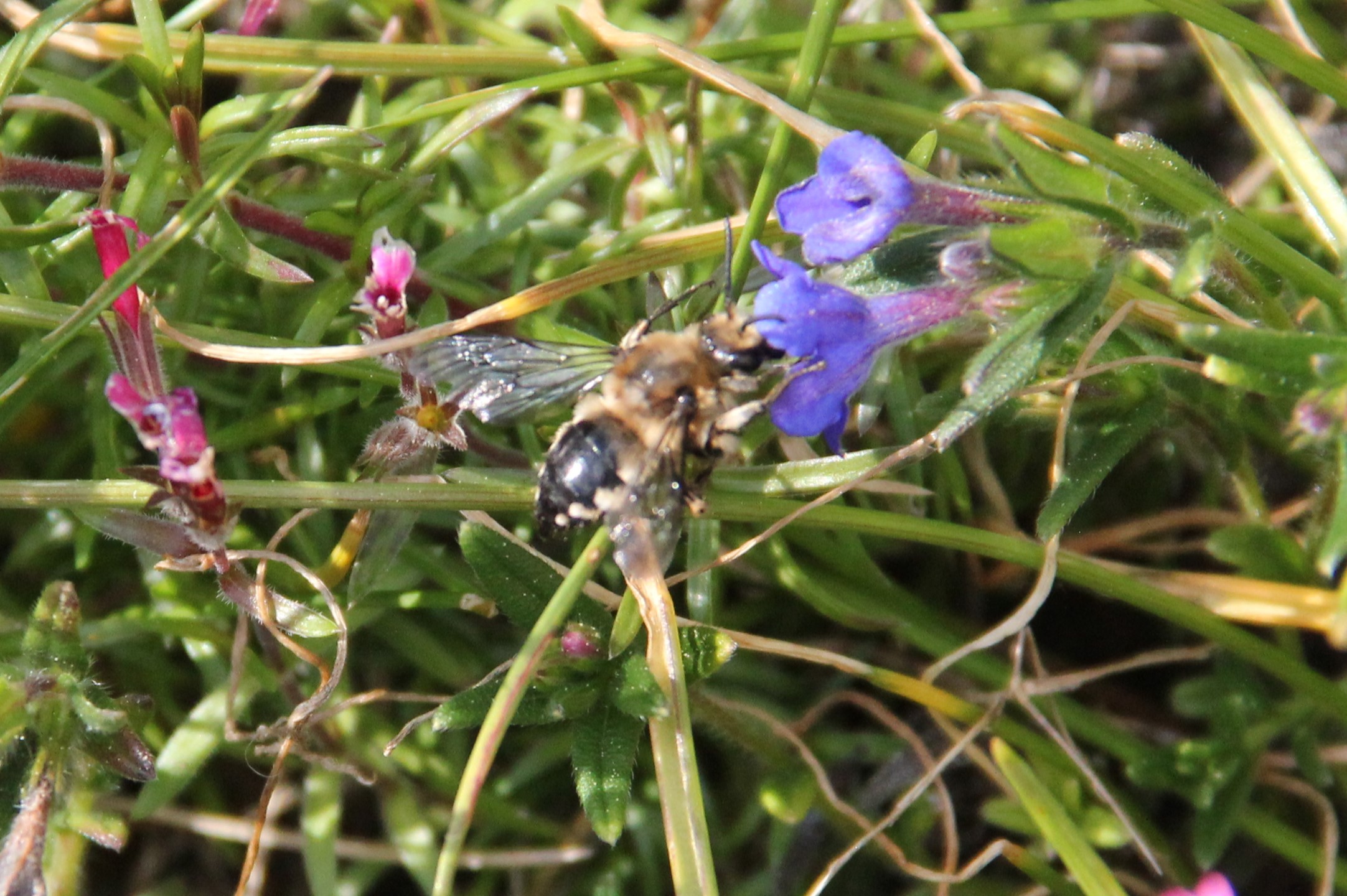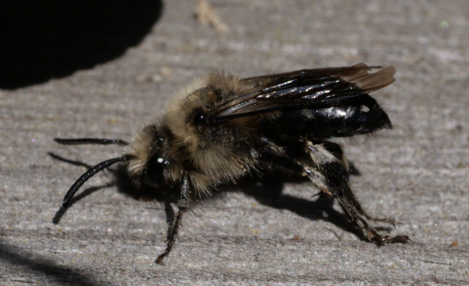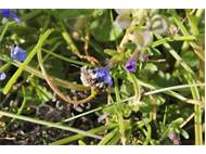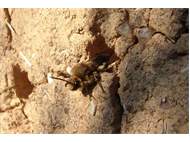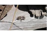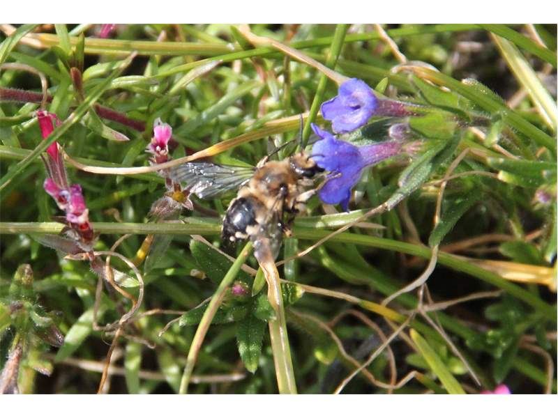Gemeine Trauerbiene (Melecta albifrons (Foerster, 1771)), Weibchen, Exemplar mit reinweißen Haarflecken; Anthophora plumipes-Weibchen versuchen erfolglos, es von ihren Niststätten zu vertreiben; Roßwein OT Gleisberg, 26.04.2020 (© Andreas Hurtig)( Bild vergrößern)
