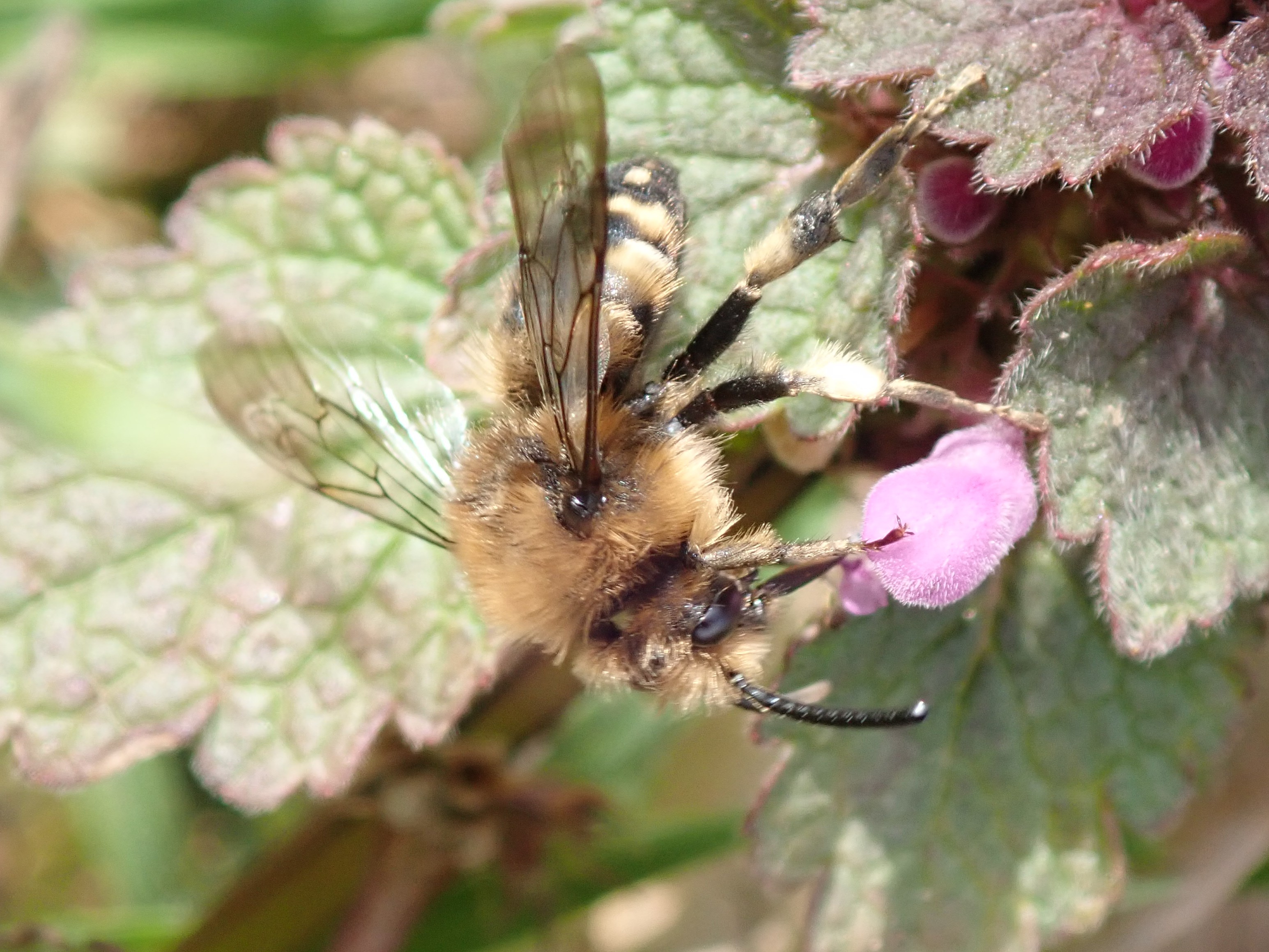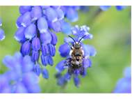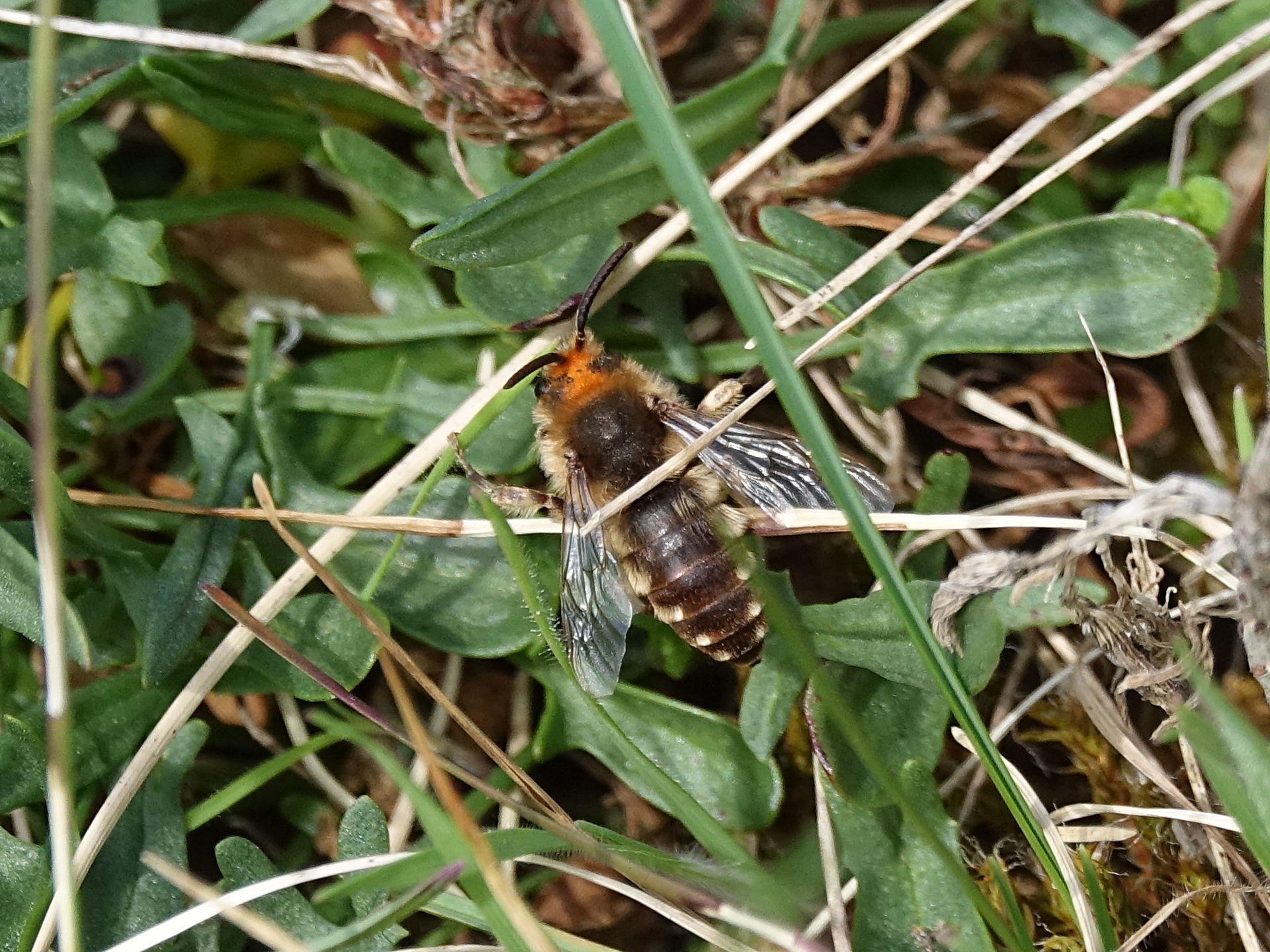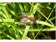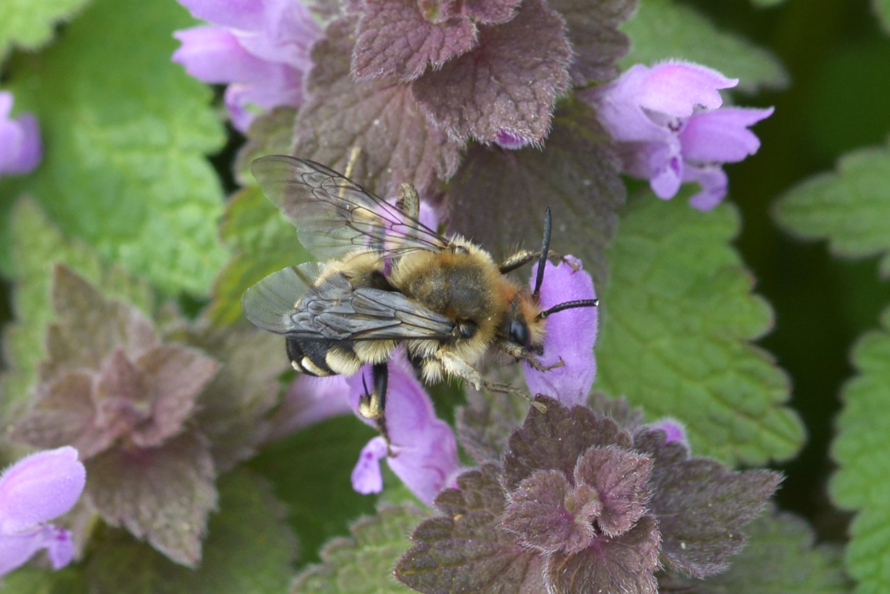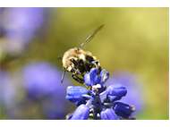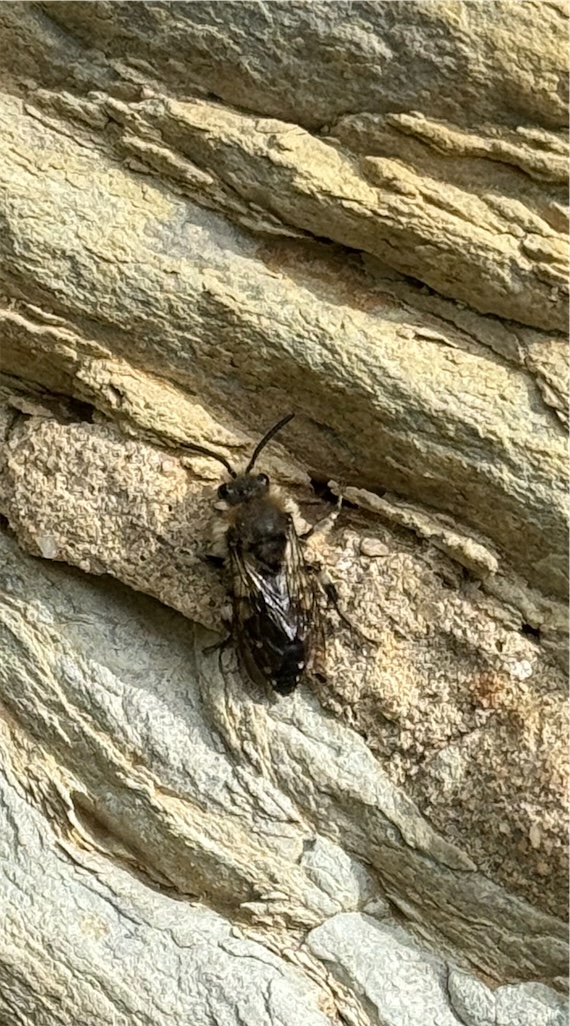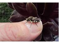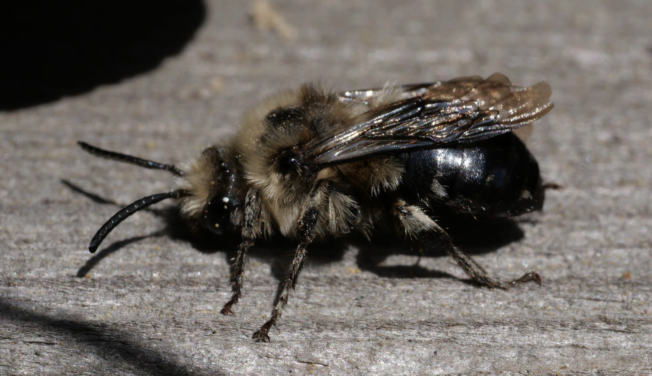 Gemeine Trauerbiene (Melecta albifrons (Foerster, 1771)), Weibchen, Exemplar mit reinweißen Haarflecken; Anthophora plumipes-Weibchen versuchen erfolglos, es von ihren Niststätten zu vertreiben; Roßwein OT Gleisberg, 26.04.2020 (© Andreas Hurtig)( Bild vergrößern)