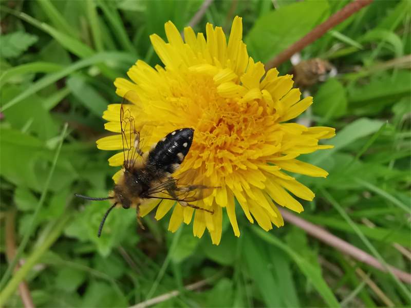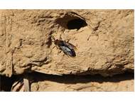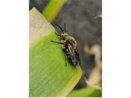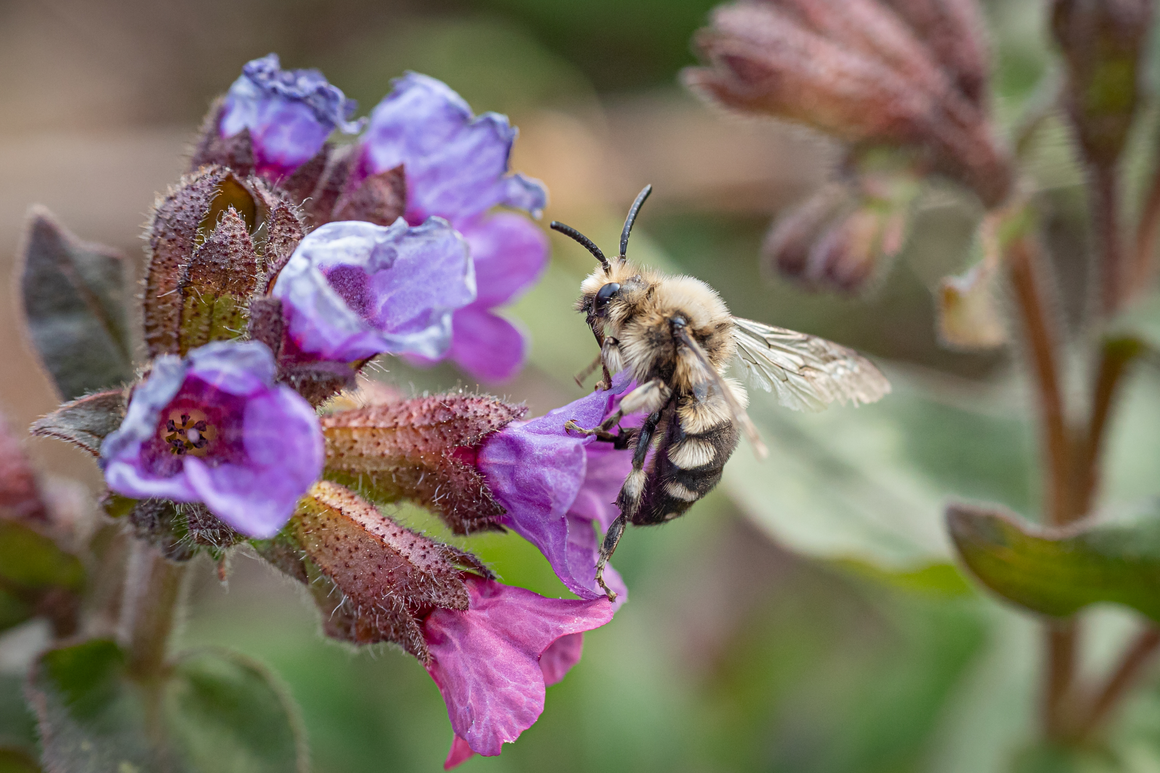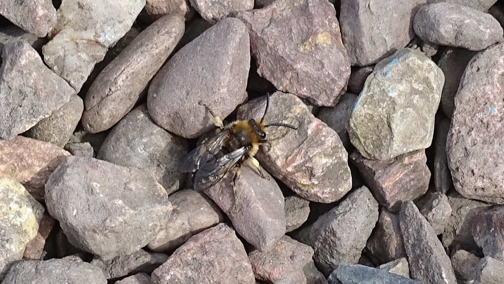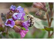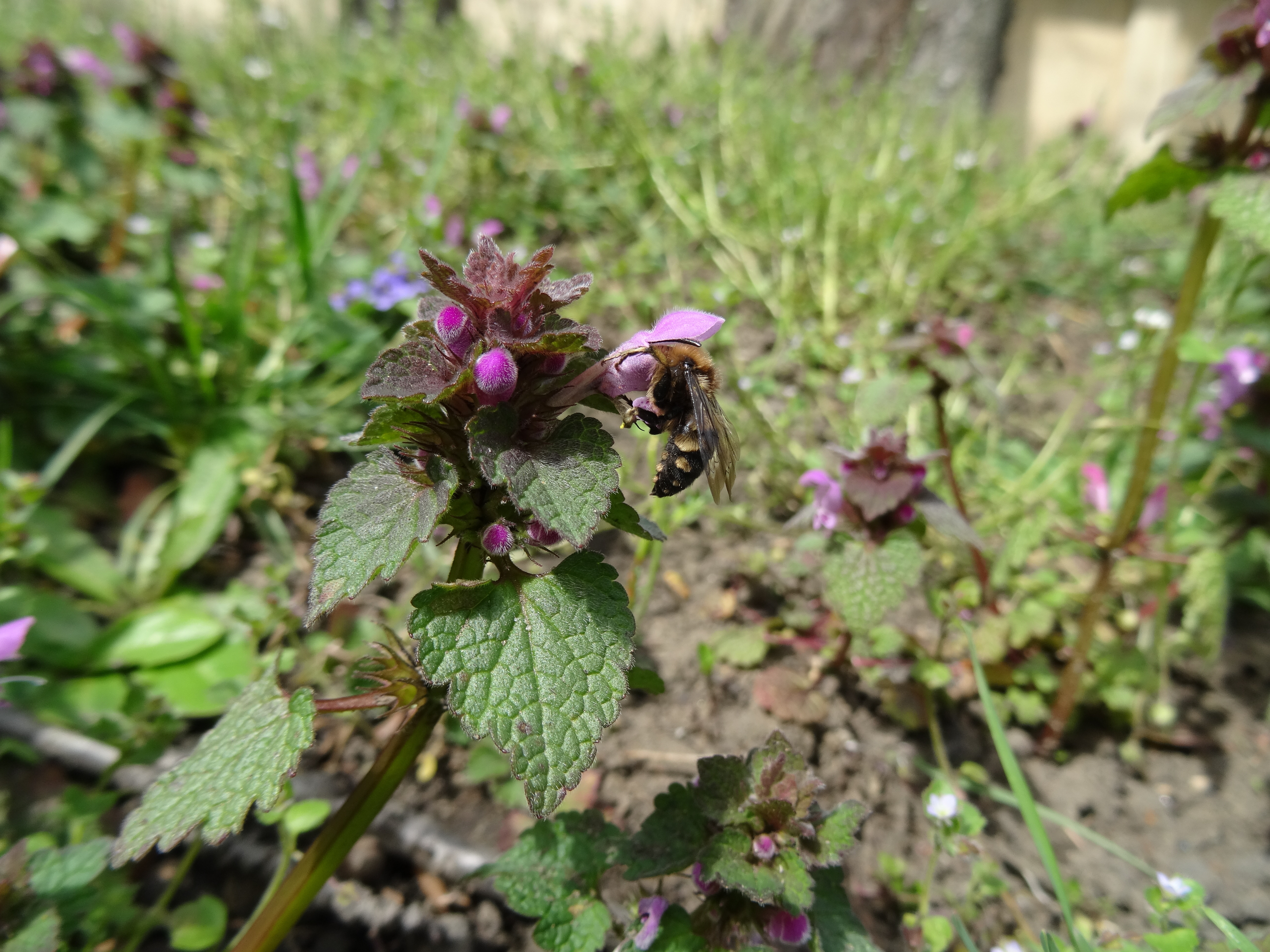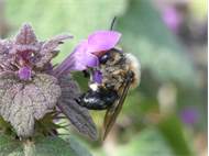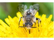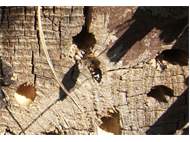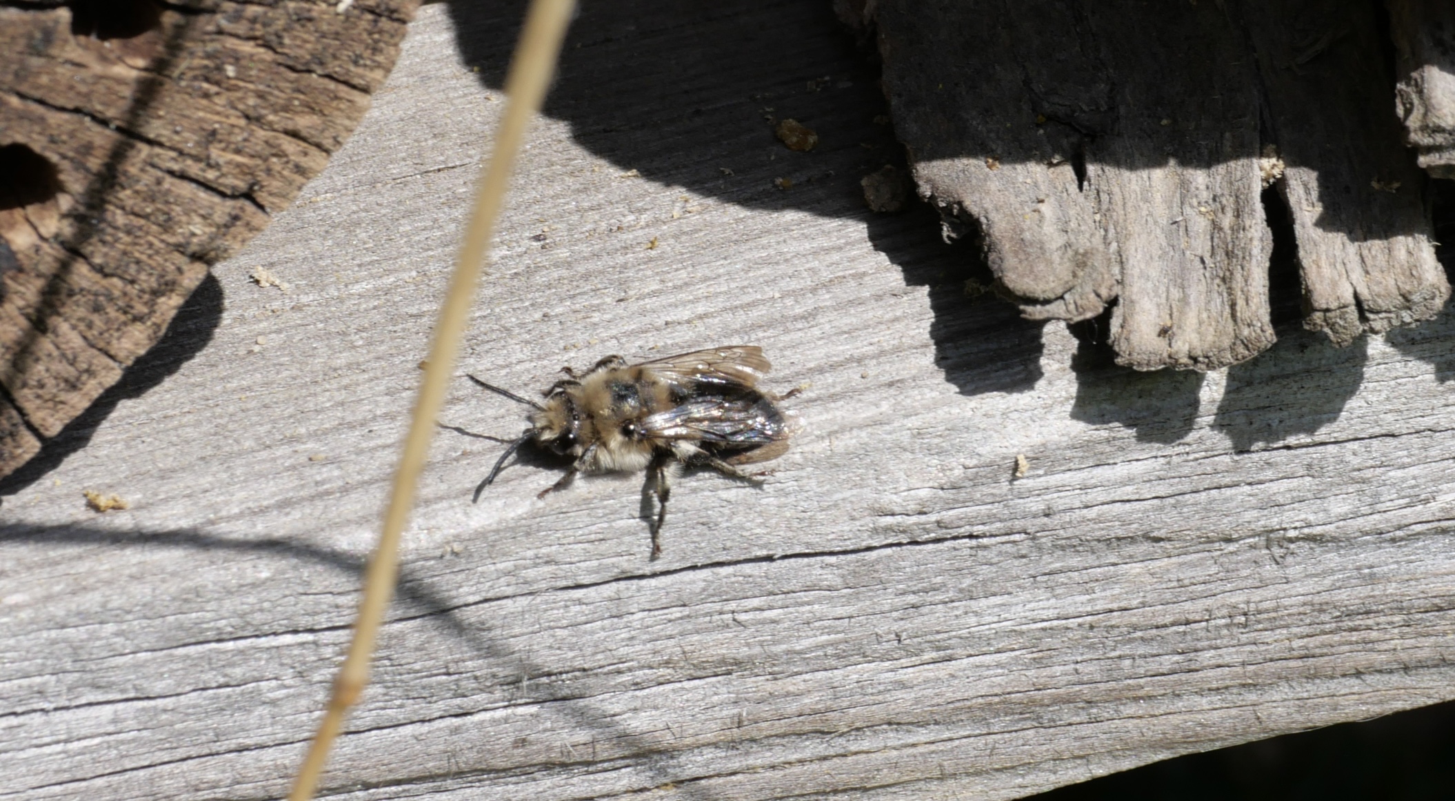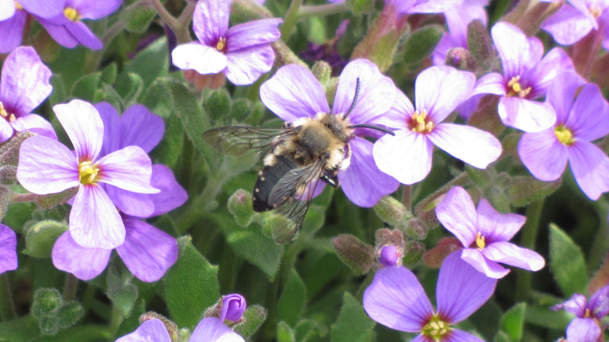 Gemeine Trauerbiene (Melecta albifrons (Foerster, 1771)), Weibchen, Exemplar mit reinweißen Haarflecken; Anthophora plumipes-Weibchen versuchen erfolglos, es von ihren Niststätten zu vertreiben; Roßwein OT Gleisberg, 26.04.2020 (© Andreas Hurtig)( Bild vergrößern)
