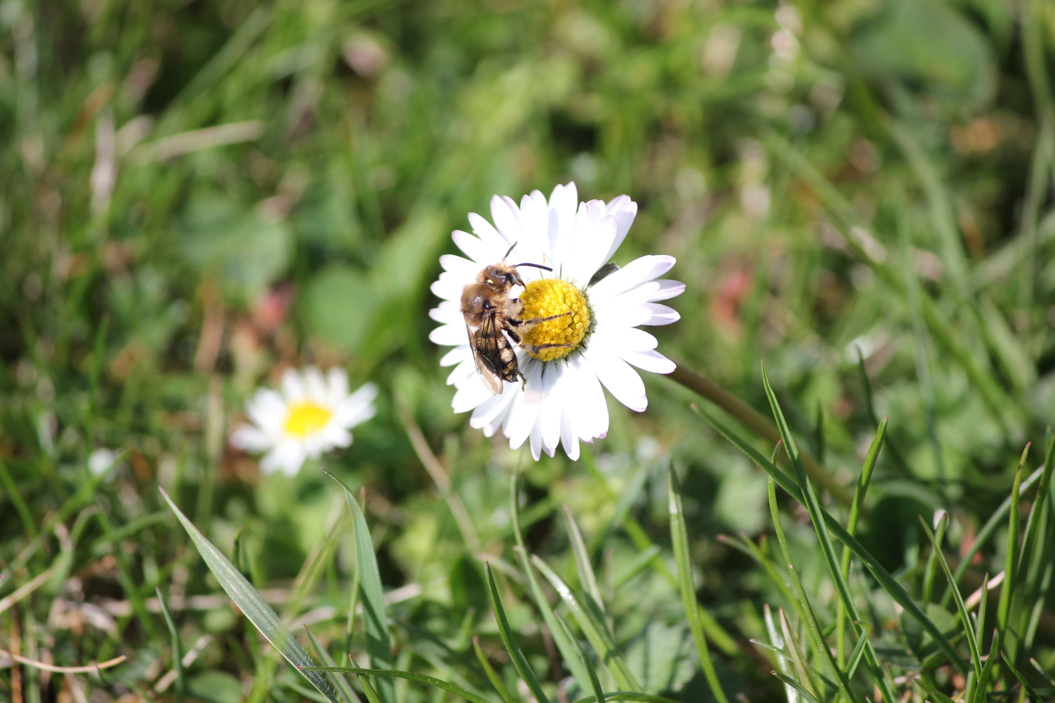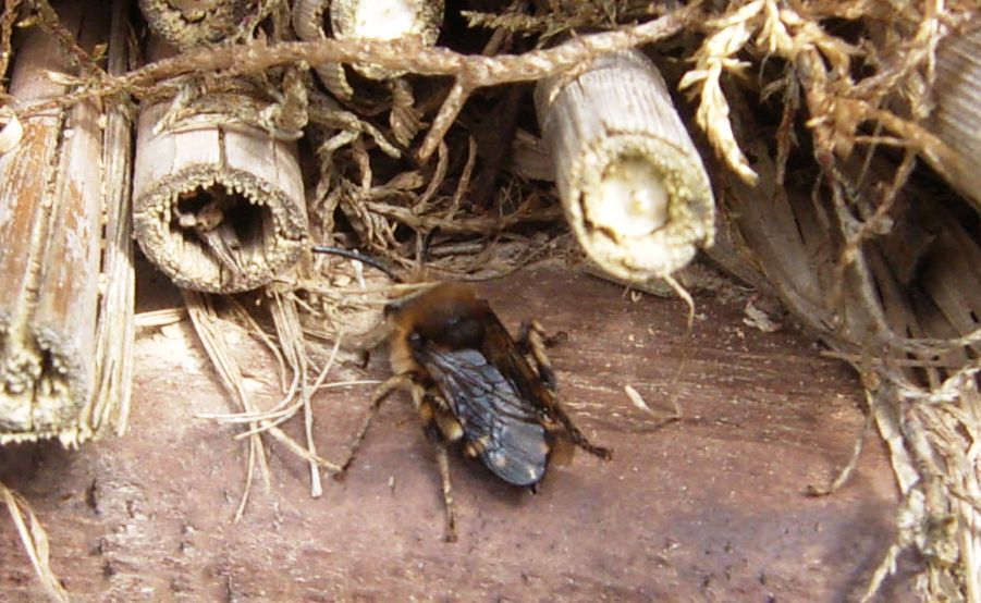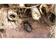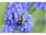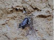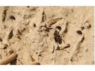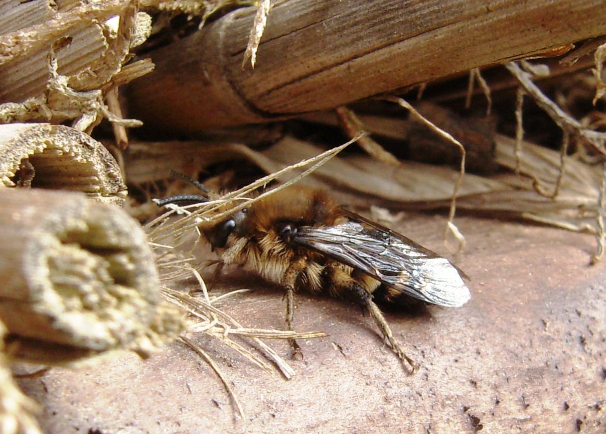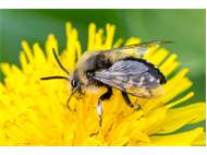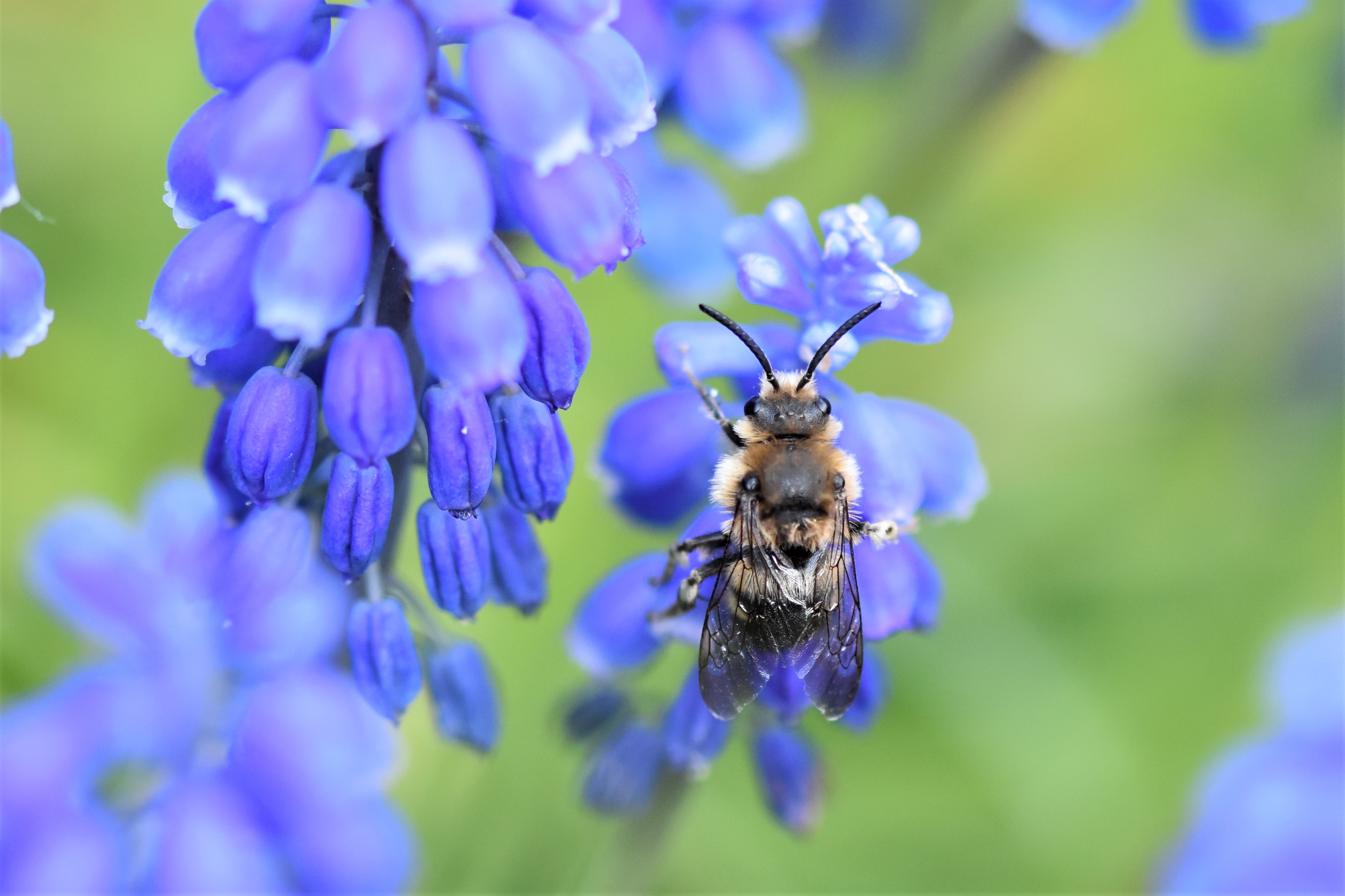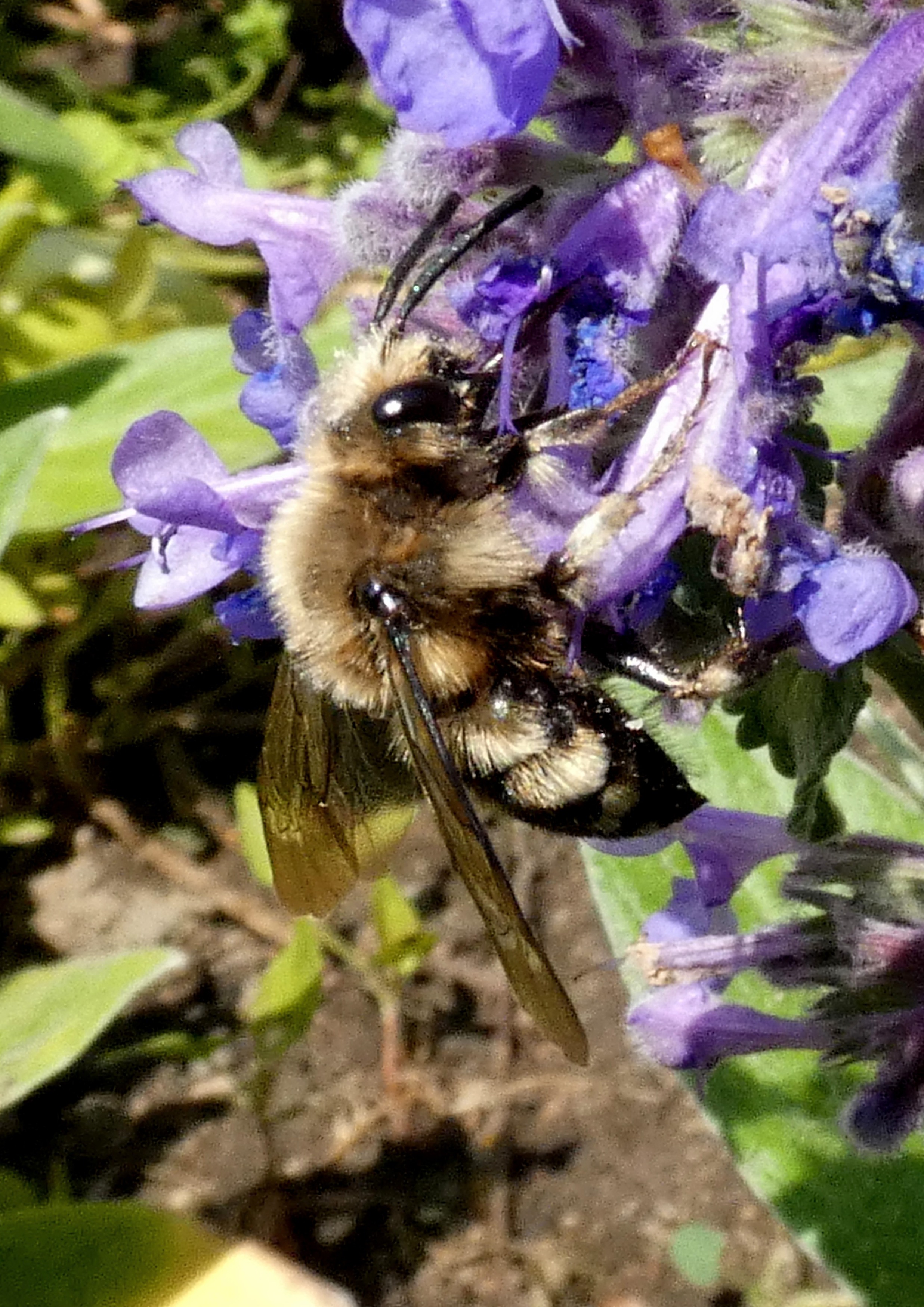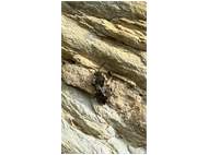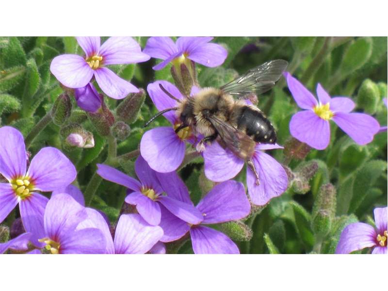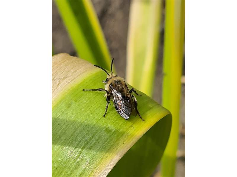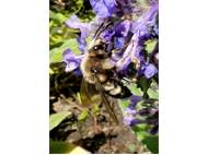 Gemeine Trauerbiene (Melecta albifrons (Foerster, 1771)), Weibchen, Exemplar mit reinweißen Haarflecken; Anthophora plumipes-Weibchen versuchen erfolglos, es von ihren Niststätten zu vertreiben; Roßwein OT Gleisberg, 26.04.2020 (© Andreas Hurtig)( Bild vergrößern)