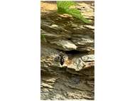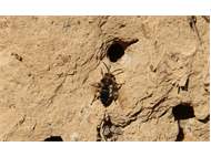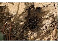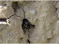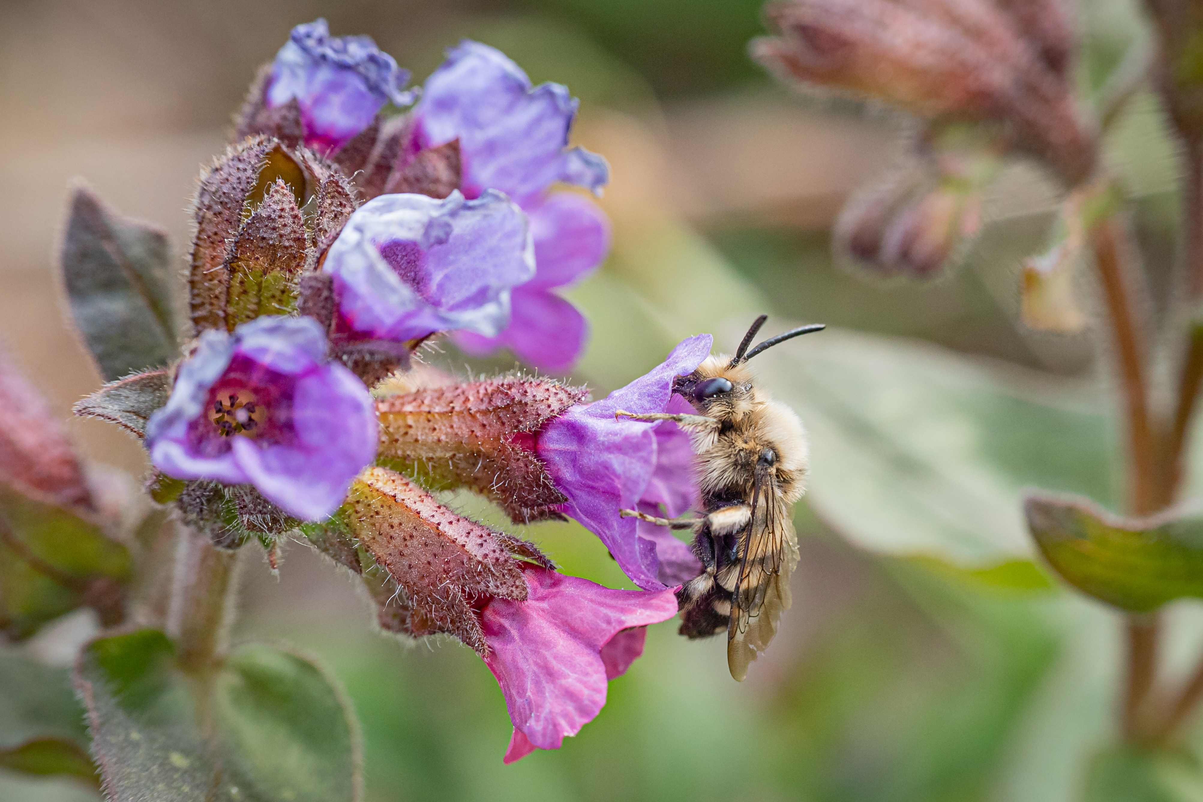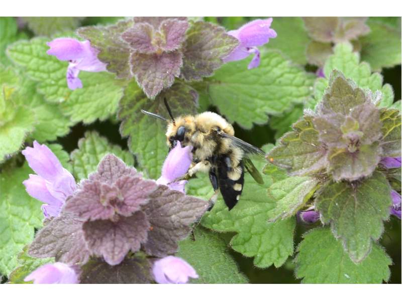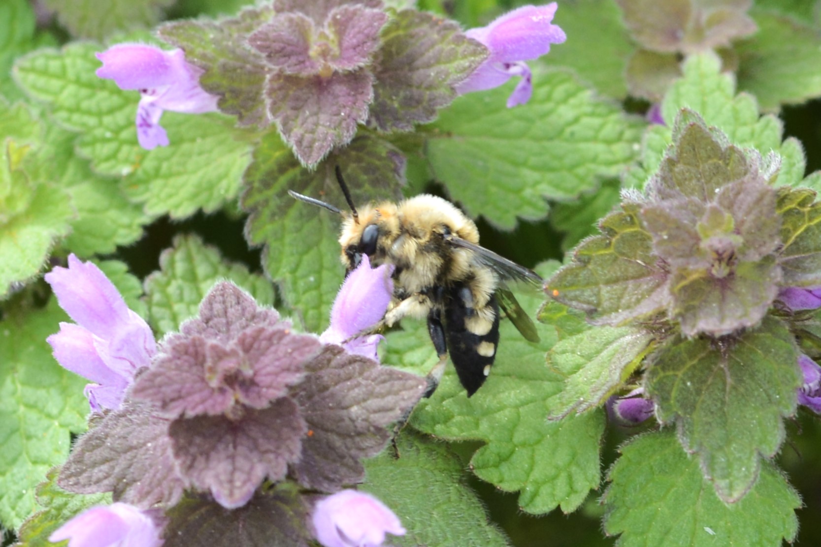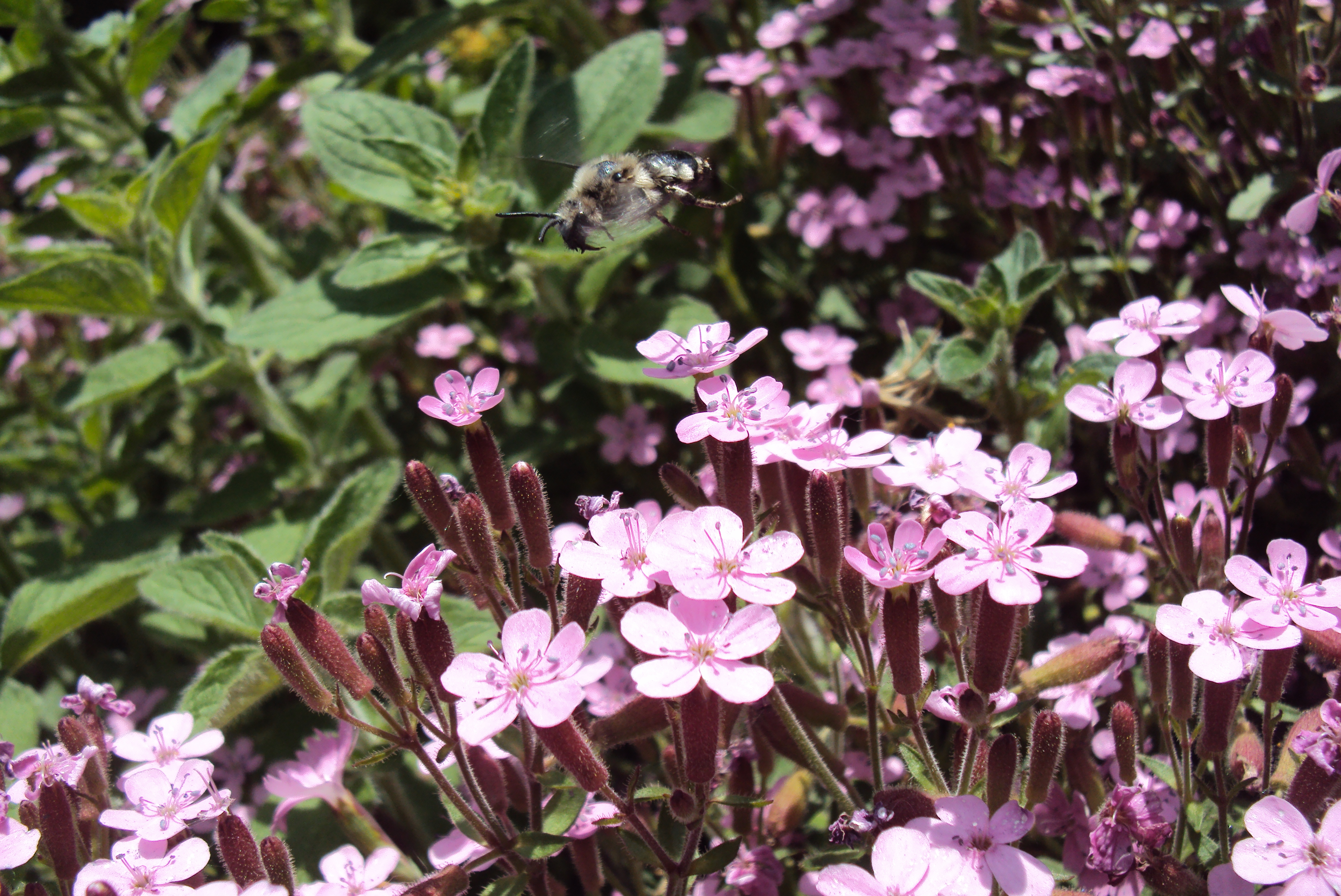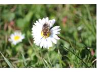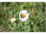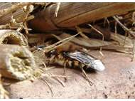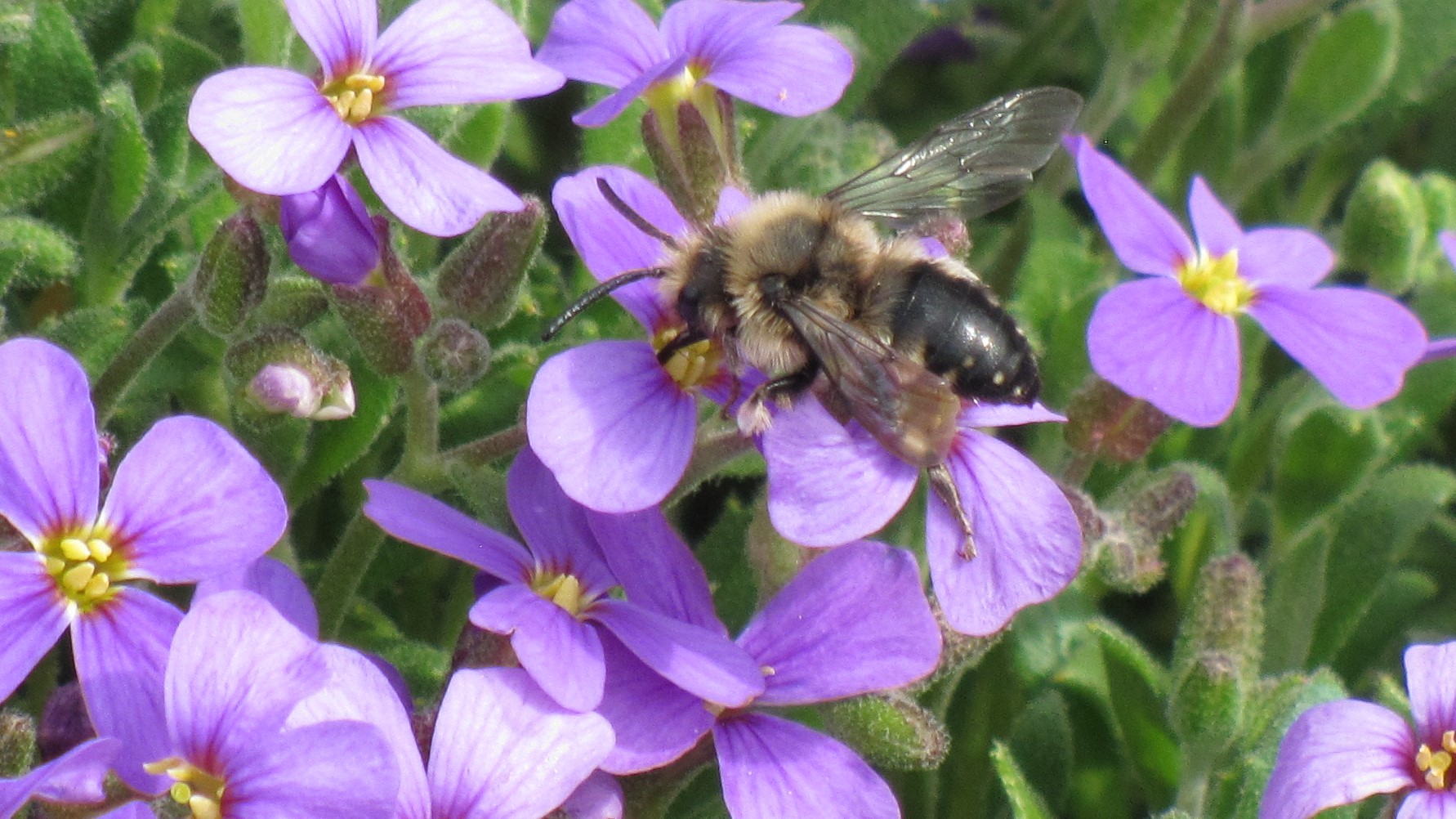 Gemeine Trauerbiene (Melecta albifrons (Foerster, 1771)), Weibchen, Exemplar mit reinweißen Haarflecken; Anthophora plumipes-Weibchen versuchen erfolglos, es von ihren Niststätten zu vertreiben; Roßwein OT Gleisberg, 26.04.2020 (© Andreas Hurtig)( Bild vergrößern)