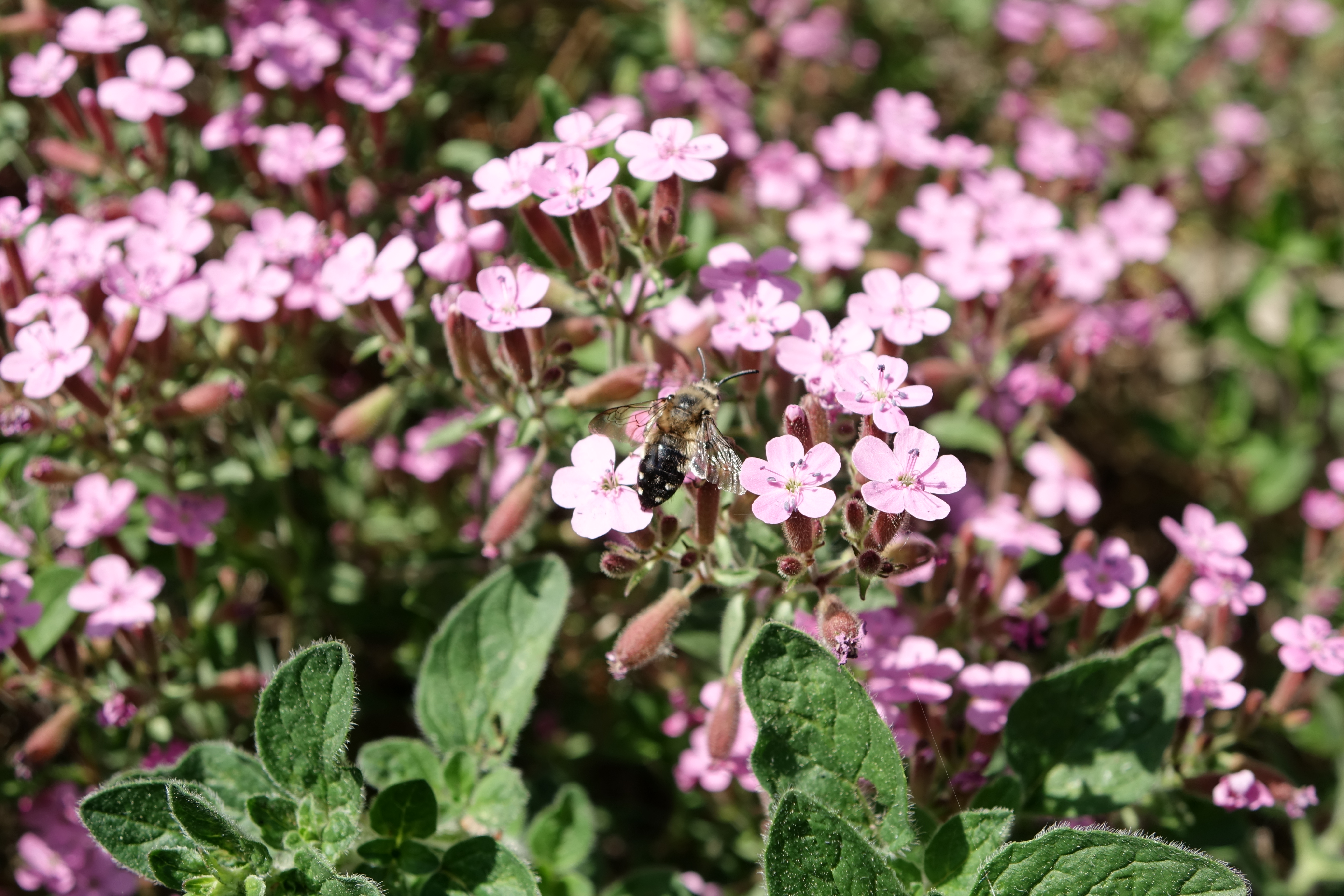 Gemeine Trauerbiene (Melecta albifrons (Foerster, 1771)), Weibchen, Exemplar mit reinweißen Haarflecken; Anthophora plumipes-Weibchen versuchen erfolglos, es von ihren Niststätten zu vertreiben; Roßwein OT Gleisberg, 26.04.2020