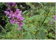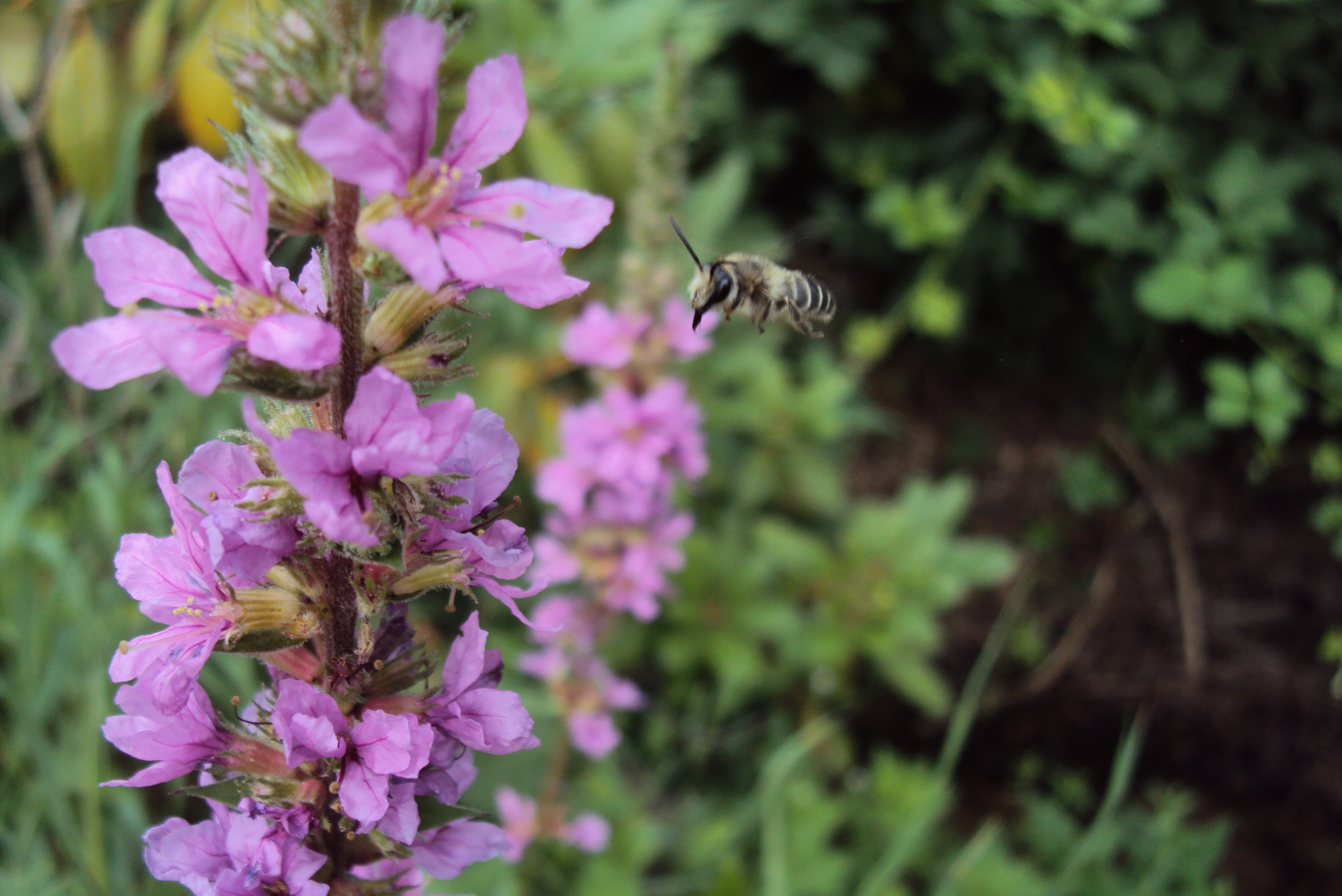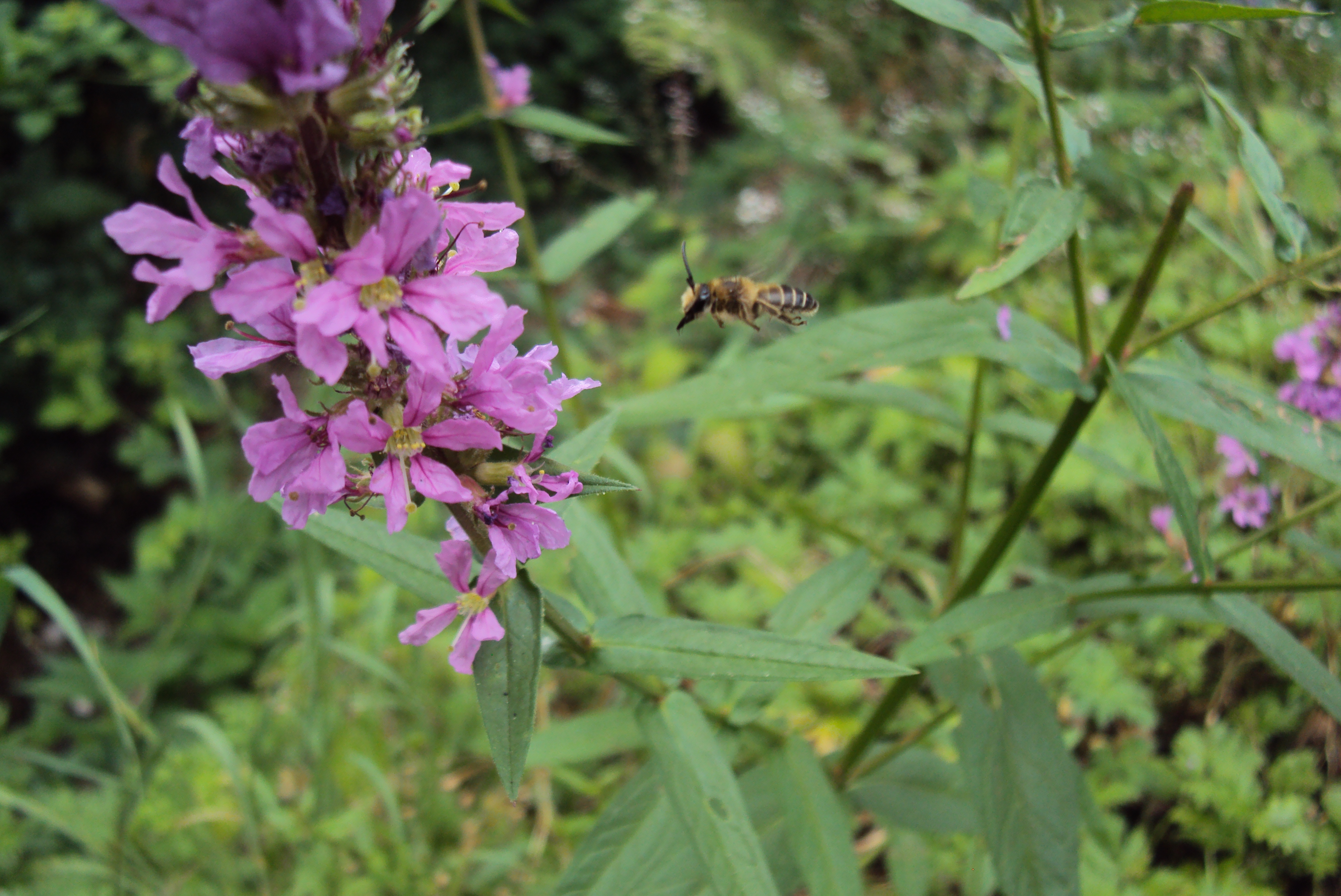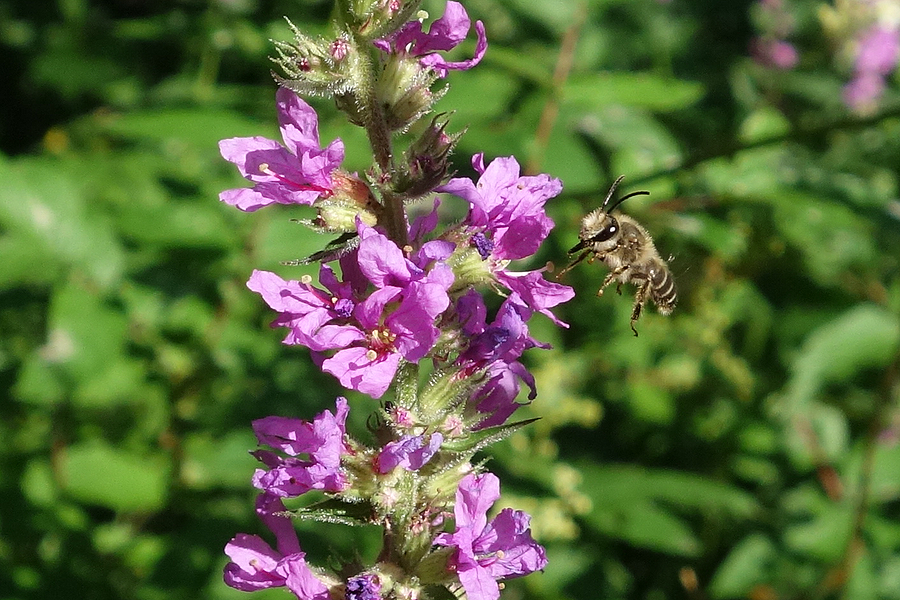 Melitta nicricans, Männchen im Anflug auf Lythrum salicaria in Dresden, Juli 2015