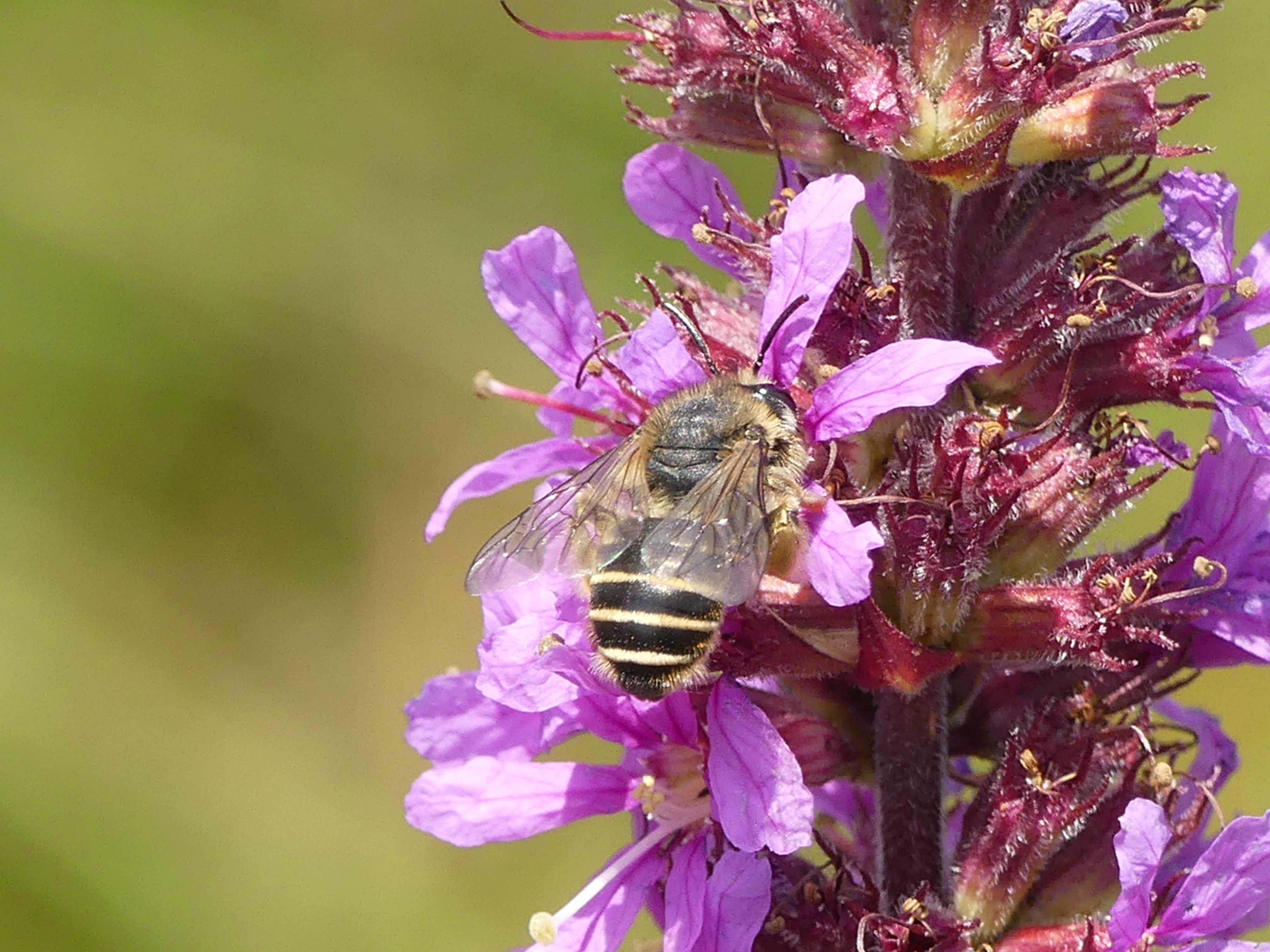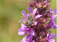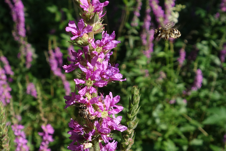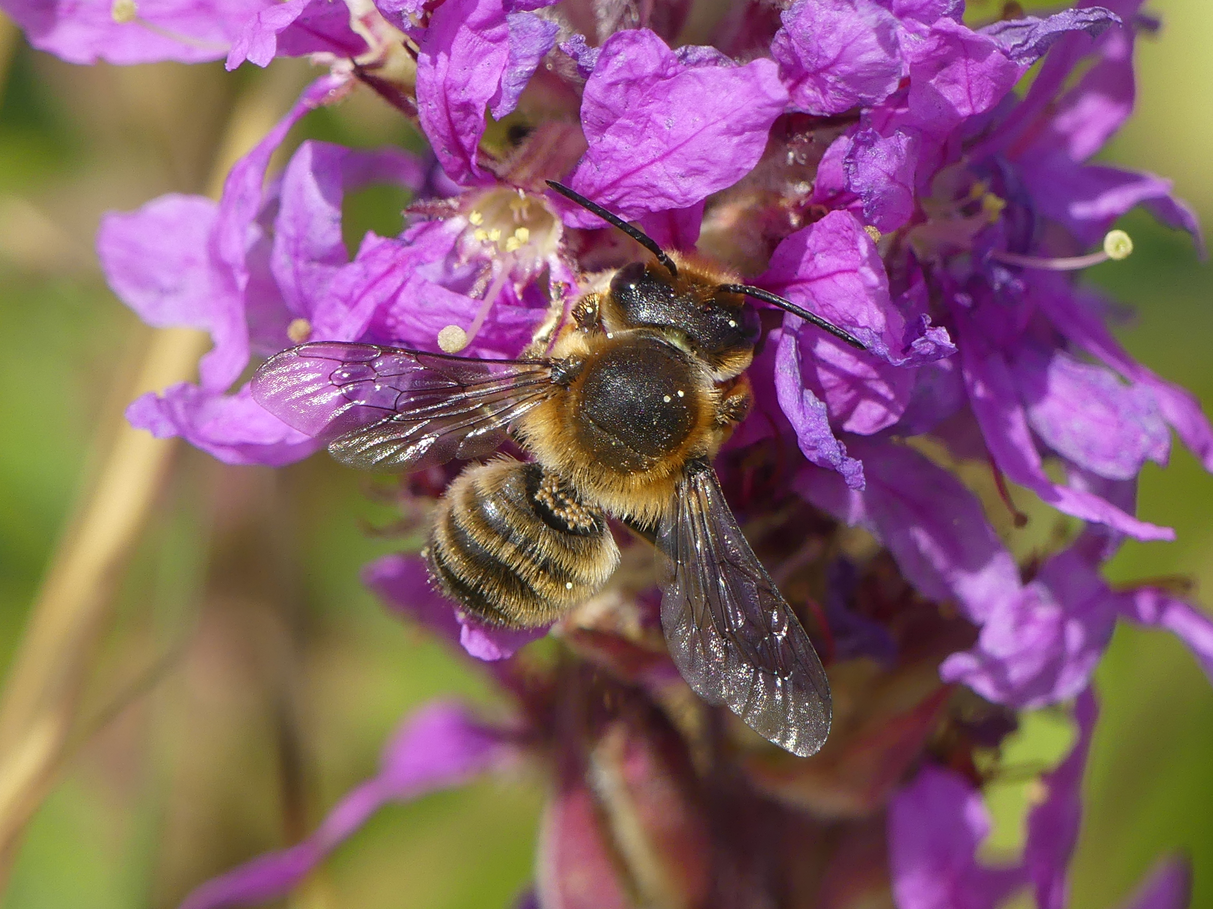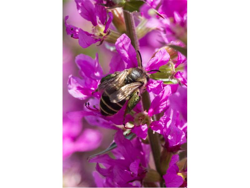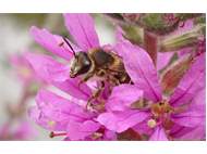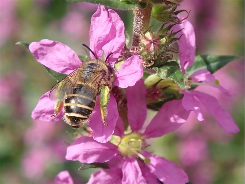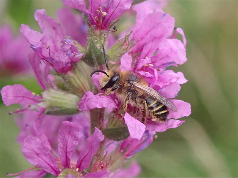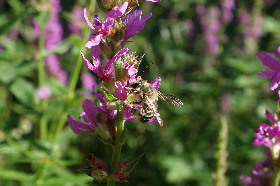 Männchen der Blutweiderich-Sägehornbiene (Melitta nigricans) an Lythrum salicaria, Pückler Park Bad Muskau, Juli 2016