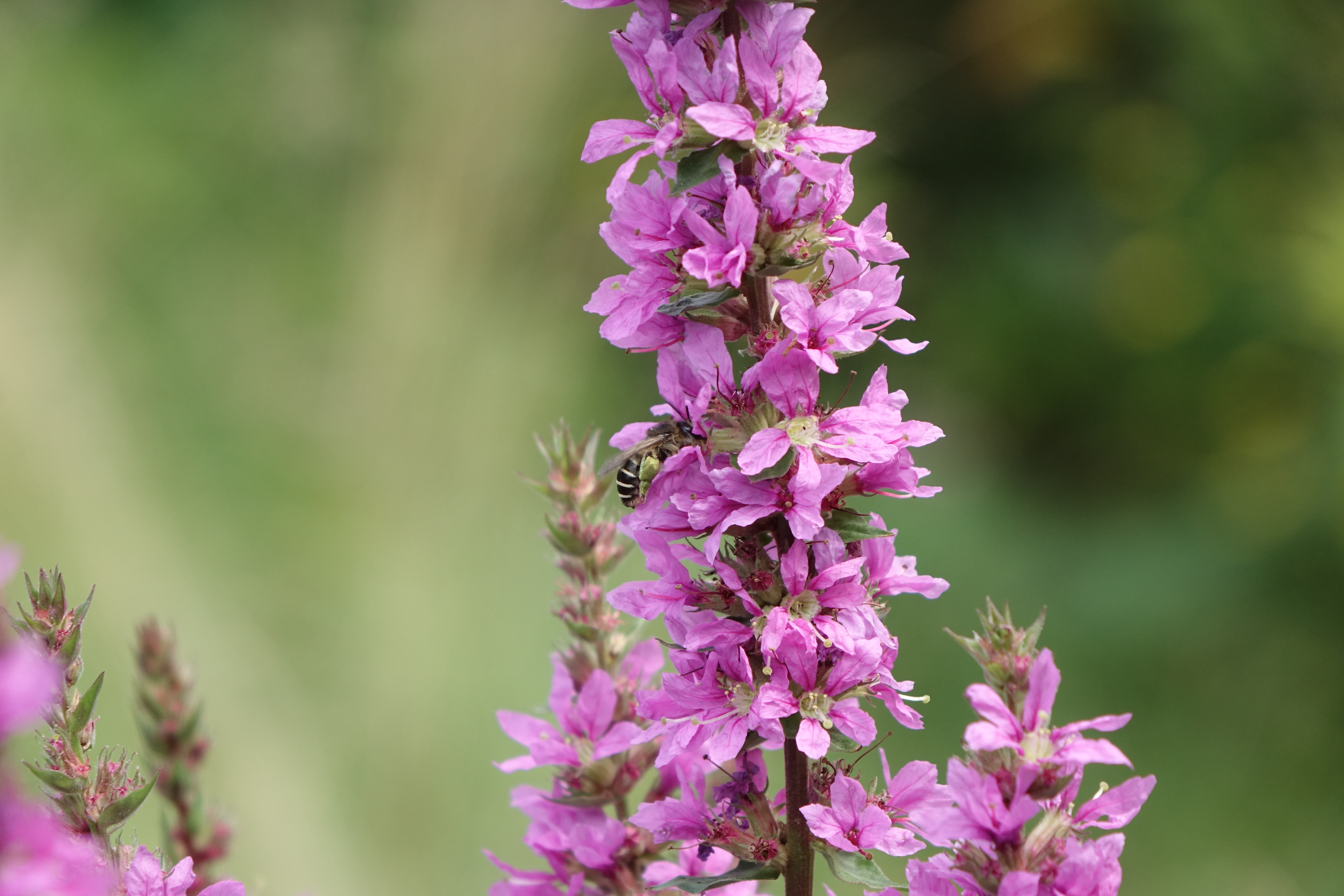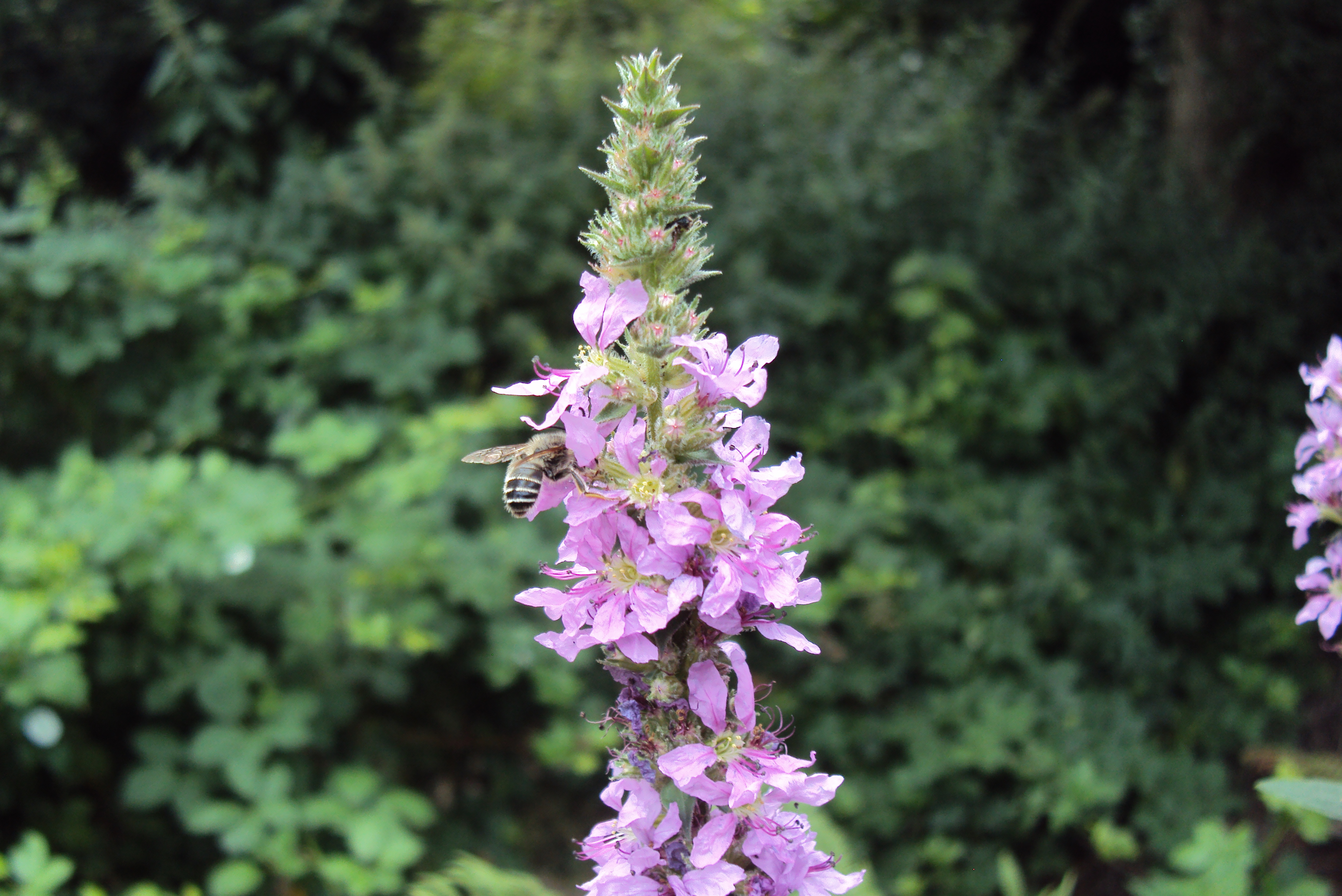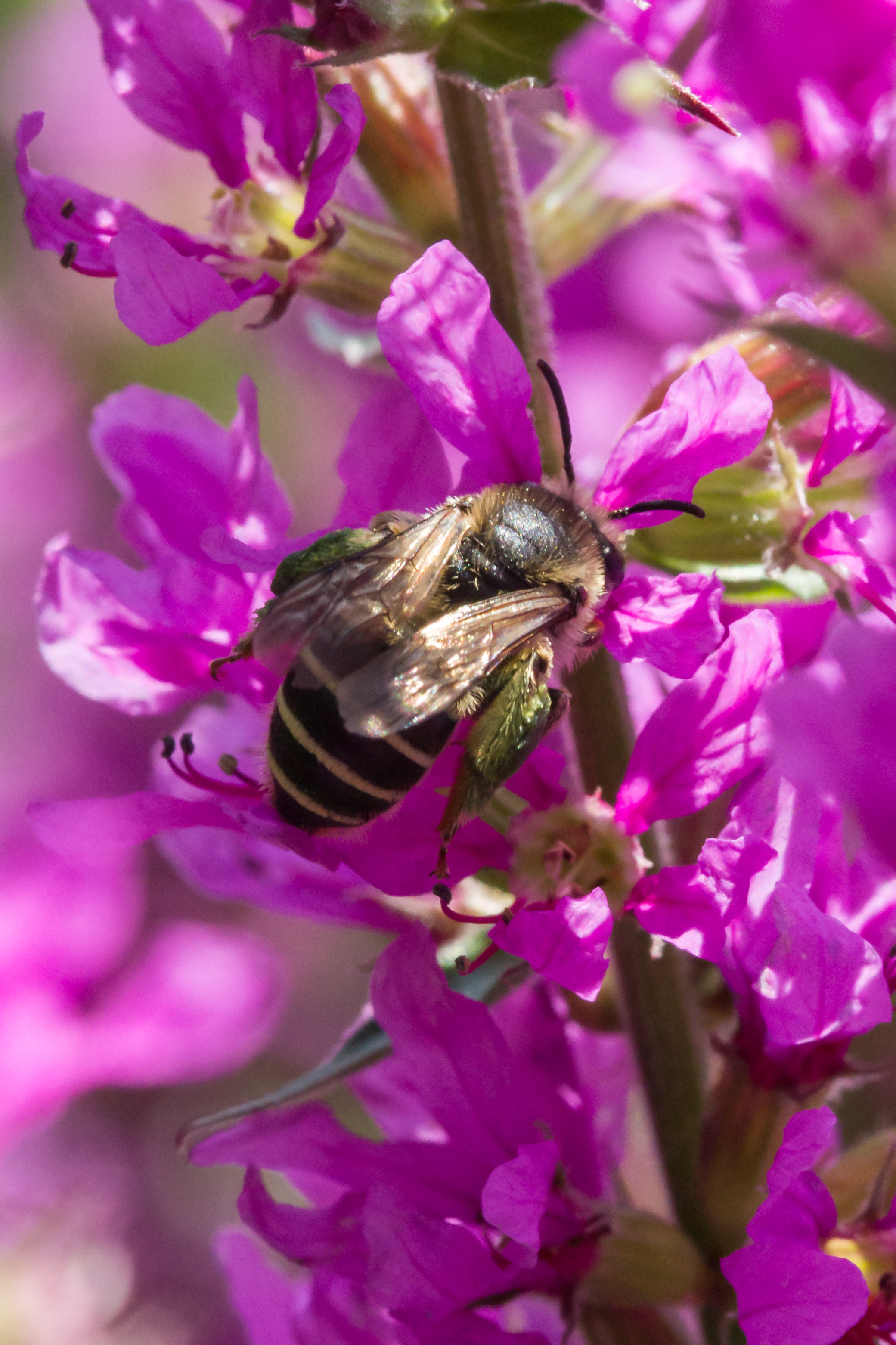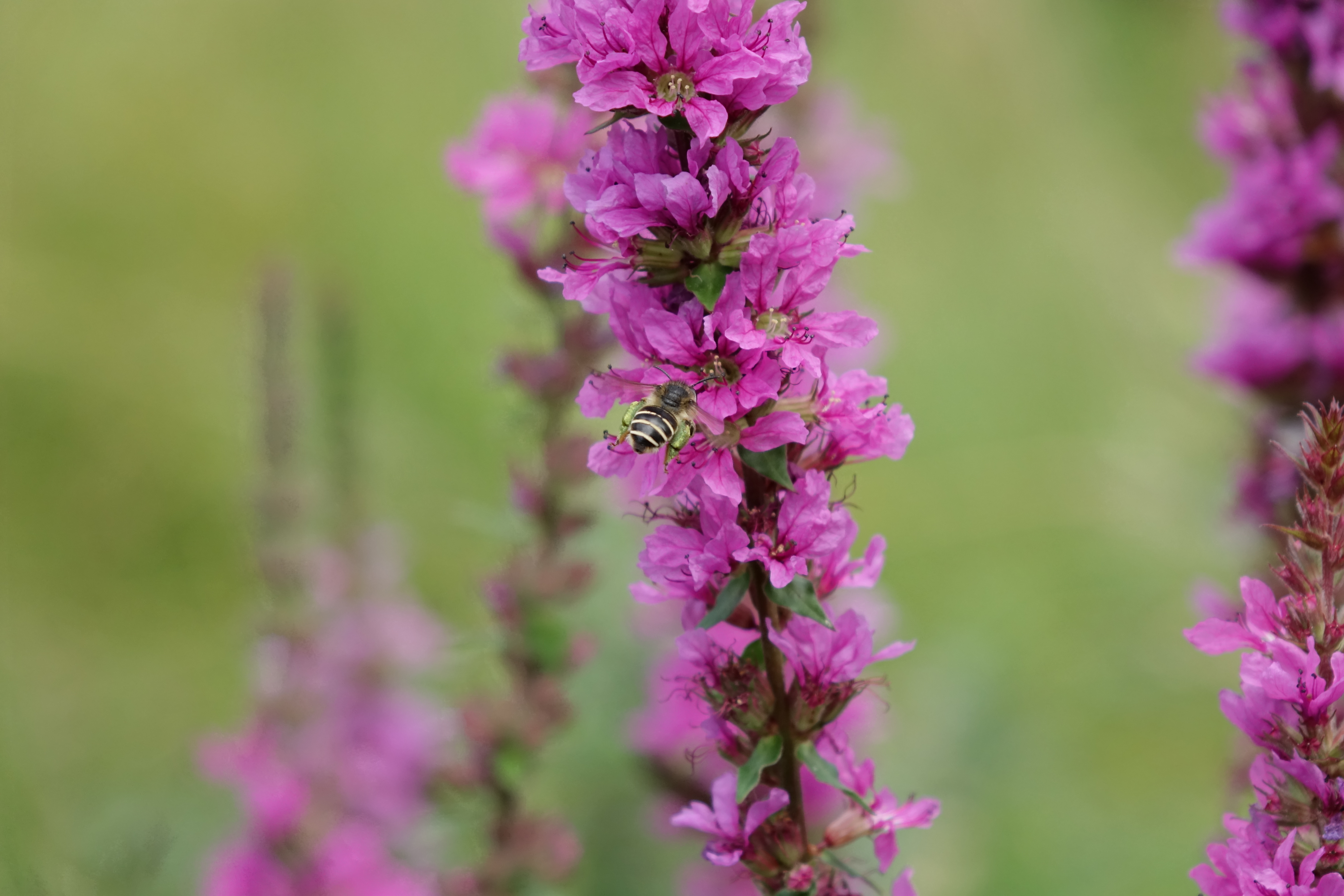 Männchen der Blutweiderich-Sägehornbiene (Melitta nigricans) an Lythrum salicaria, Pückler Park Bad Muskau, Juli 2016