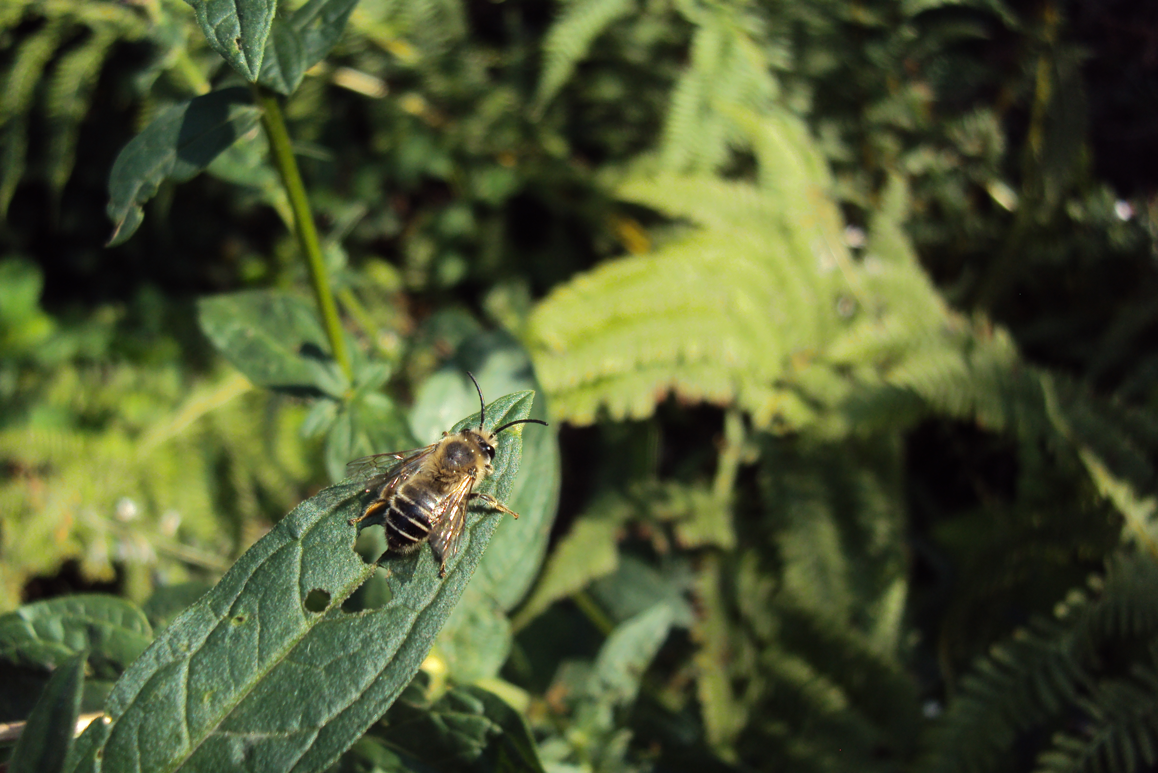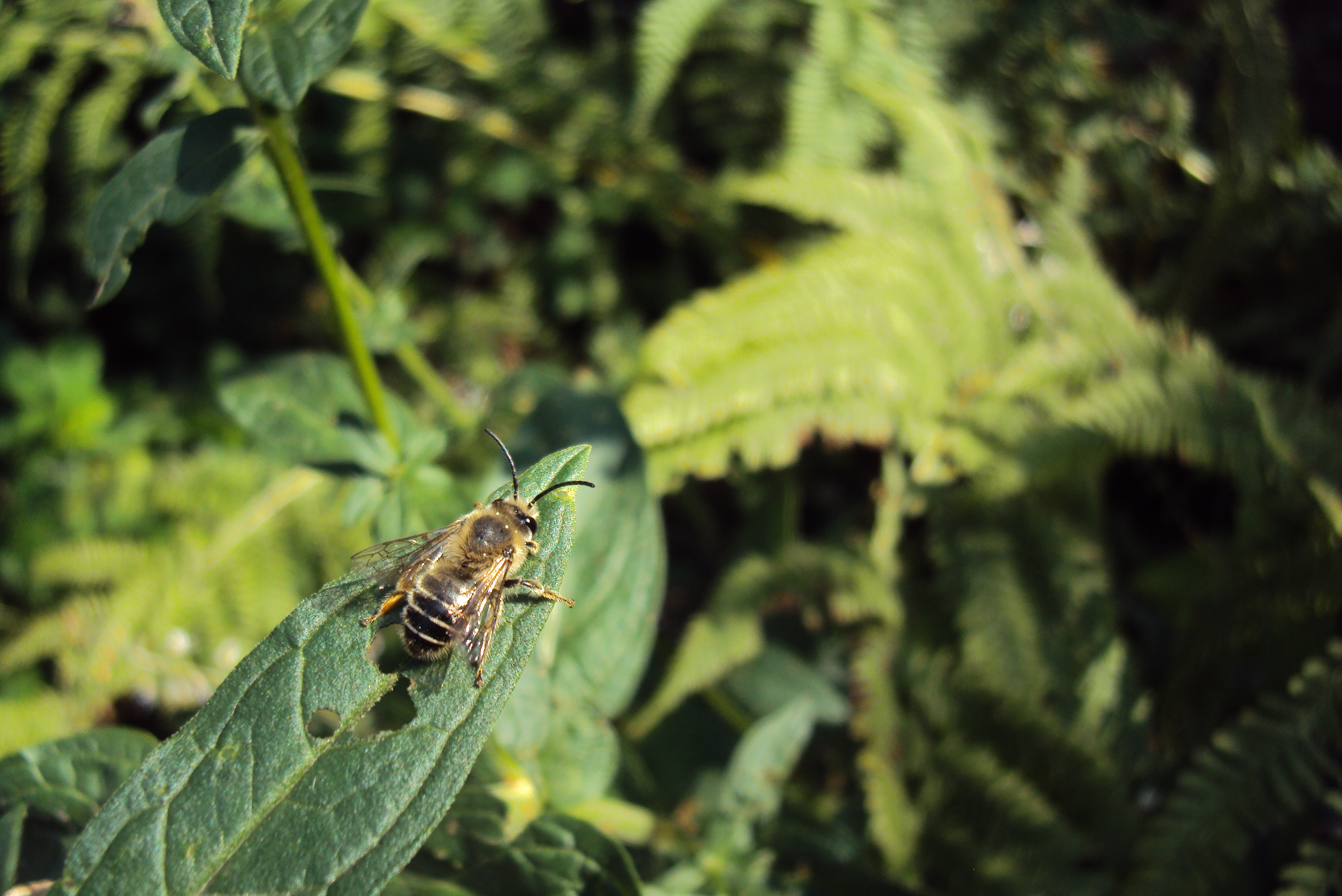 Blutweiderich-Sägehornbiene (Melitta nigricans Alfken, 1905) auf Lythrum salicaria-Blatt ruhend, Garten in Dresden-Mockritz, 03.08.2019