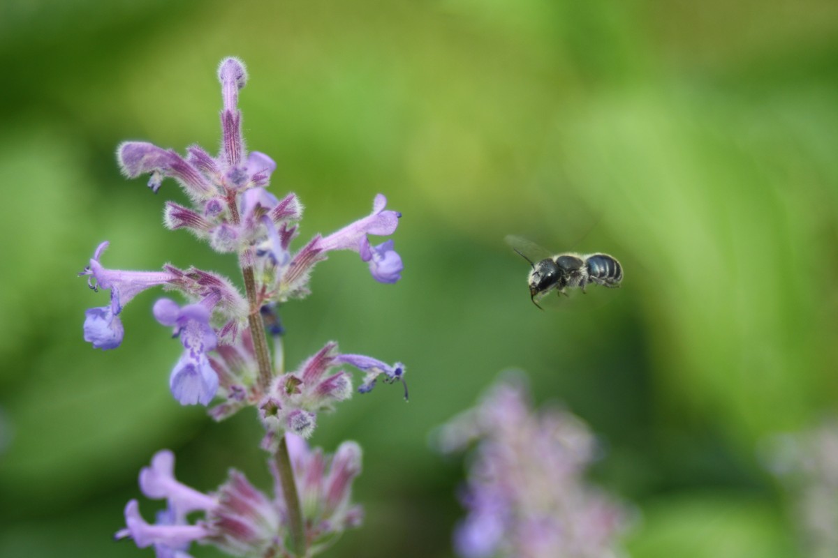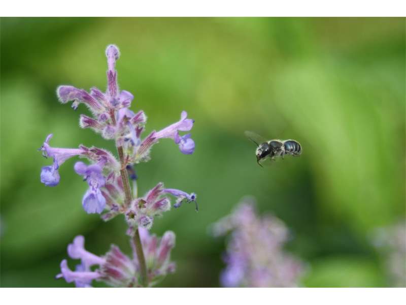 Zum Pollensammeln ist Osmia caerulescens nicht auf bestimmte Pflanzenfamilien spezialisiert (polylektisch), zeigt aber eine deutliche Bevorzugung von Schmetterlingsblütlern (Fabaceae) und Lippenblütlern (Lamiaceae). Das Pollensammeln erfolgt mithilfe einer speziellen Sammelvorrichtung auf dem Clypeus des Weibchens, der anschließende Transport zum Nest mittels der gattungstypischen Bauchbürste. Der Nektaranteil des Larvenproviantes ist vergleichsweise hoch. Als Nektarquellen werden neben Schmetterlings- und Lippenblütlern auch verschiedene Wiesenblumen, wie Flockenblumen (Centaurea) und Pippau (Crepis) genutzt. Die Männchen zeigen darüber hinaus eine Vorliebe für Knoblauchsrauke (Alliaria petiolata).