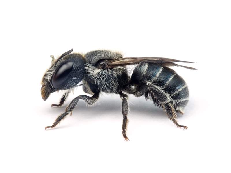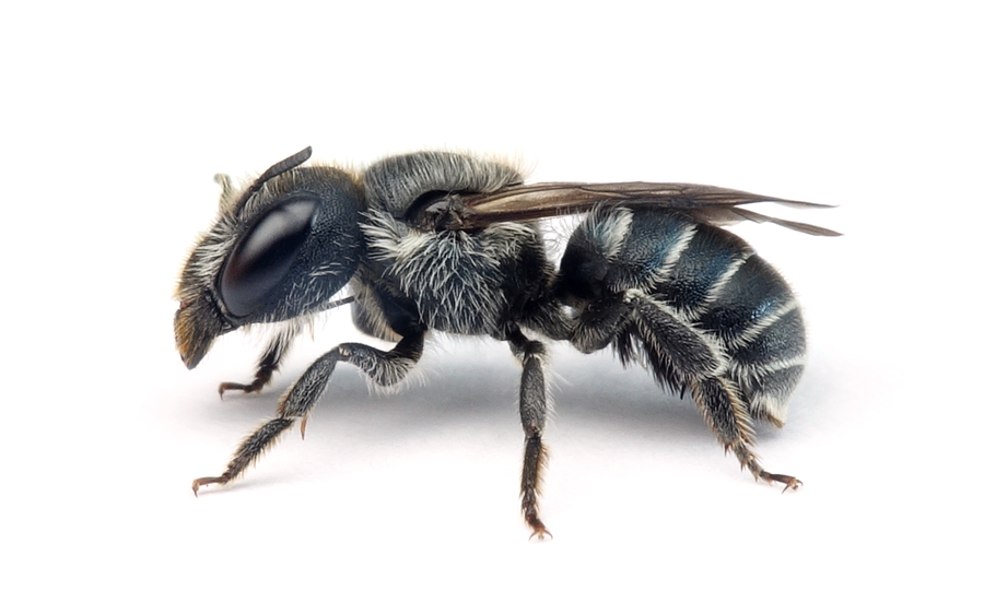 Ausgeprägter Geschlechtsdimorphismus. Weibchen: Körpergröße 8-10 mm. Gedrungener Körperbau mit großem, klobigem Kopf. Ganzer Körper mit blauem, metallischem Schimmer (Name!) und schütterer weißgrauer Behaarung. Tergite mit schmalen Endbinden. Bauchbürste schwarz.
