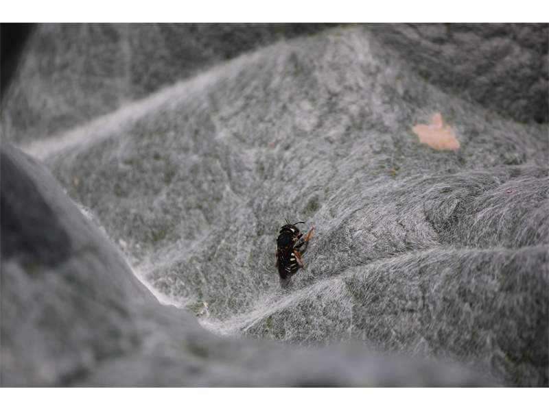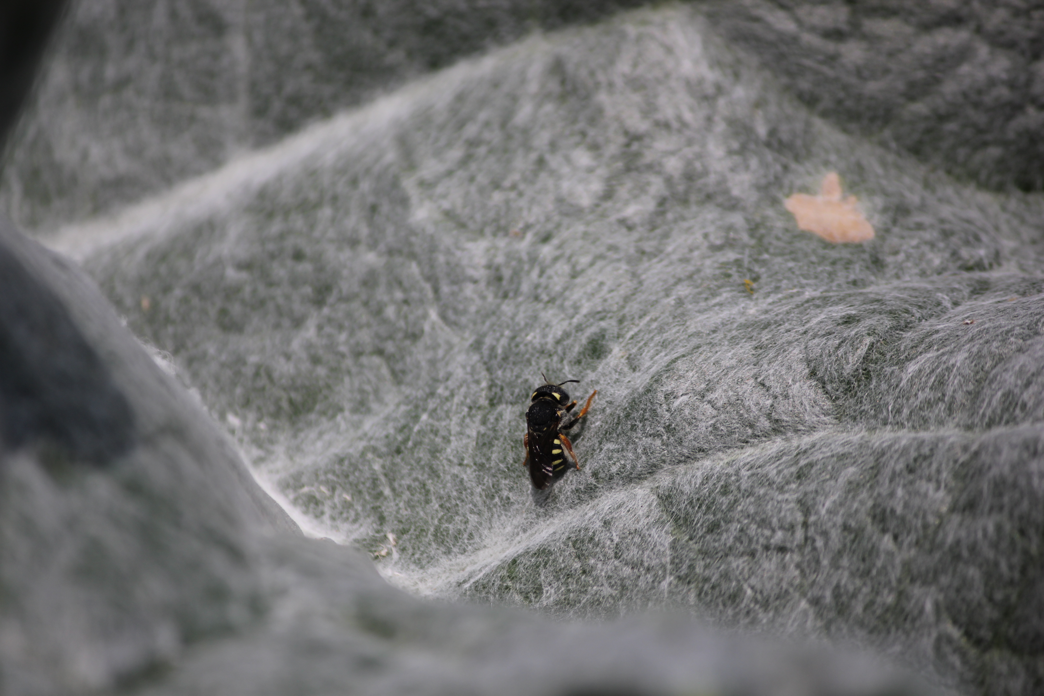 Weibchen der Östlichen Zwergwollbiene beim Sammeln von Nistmaterial