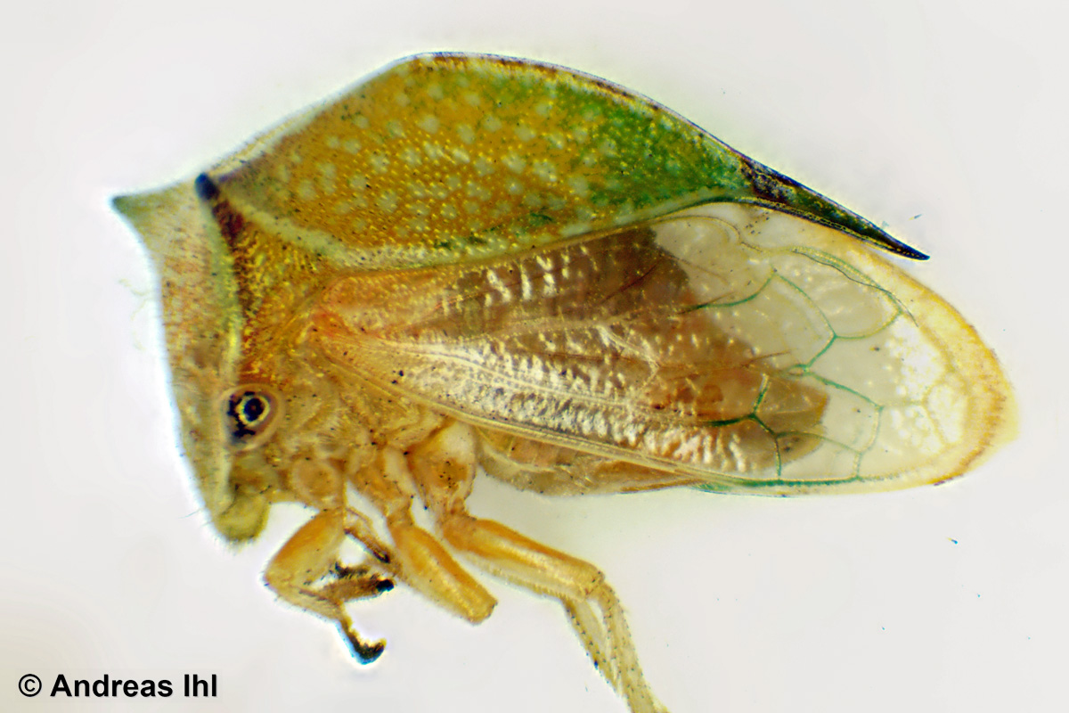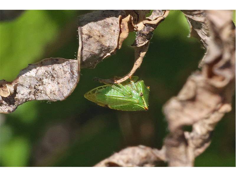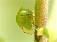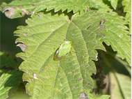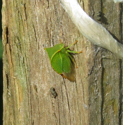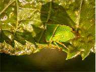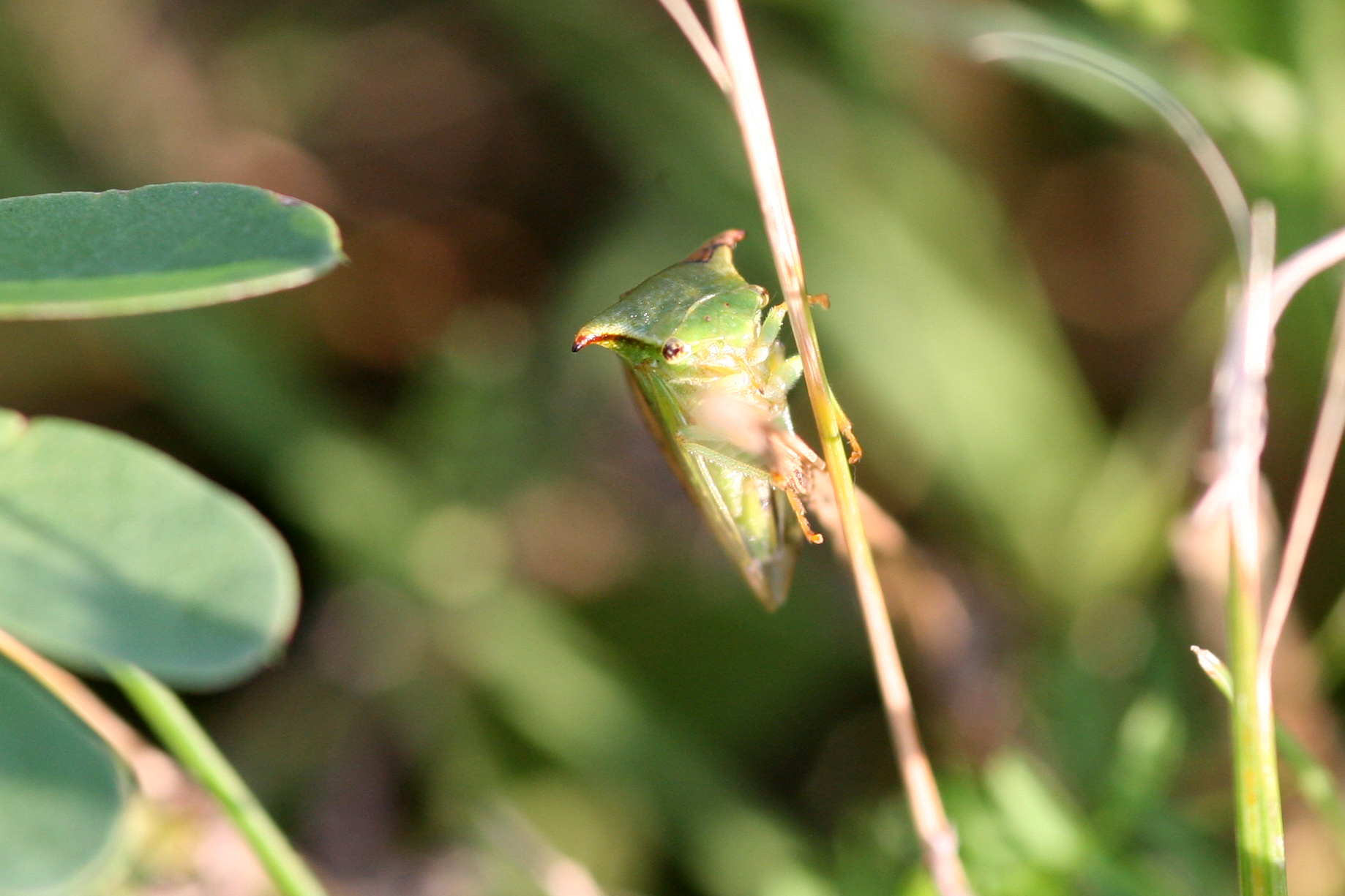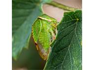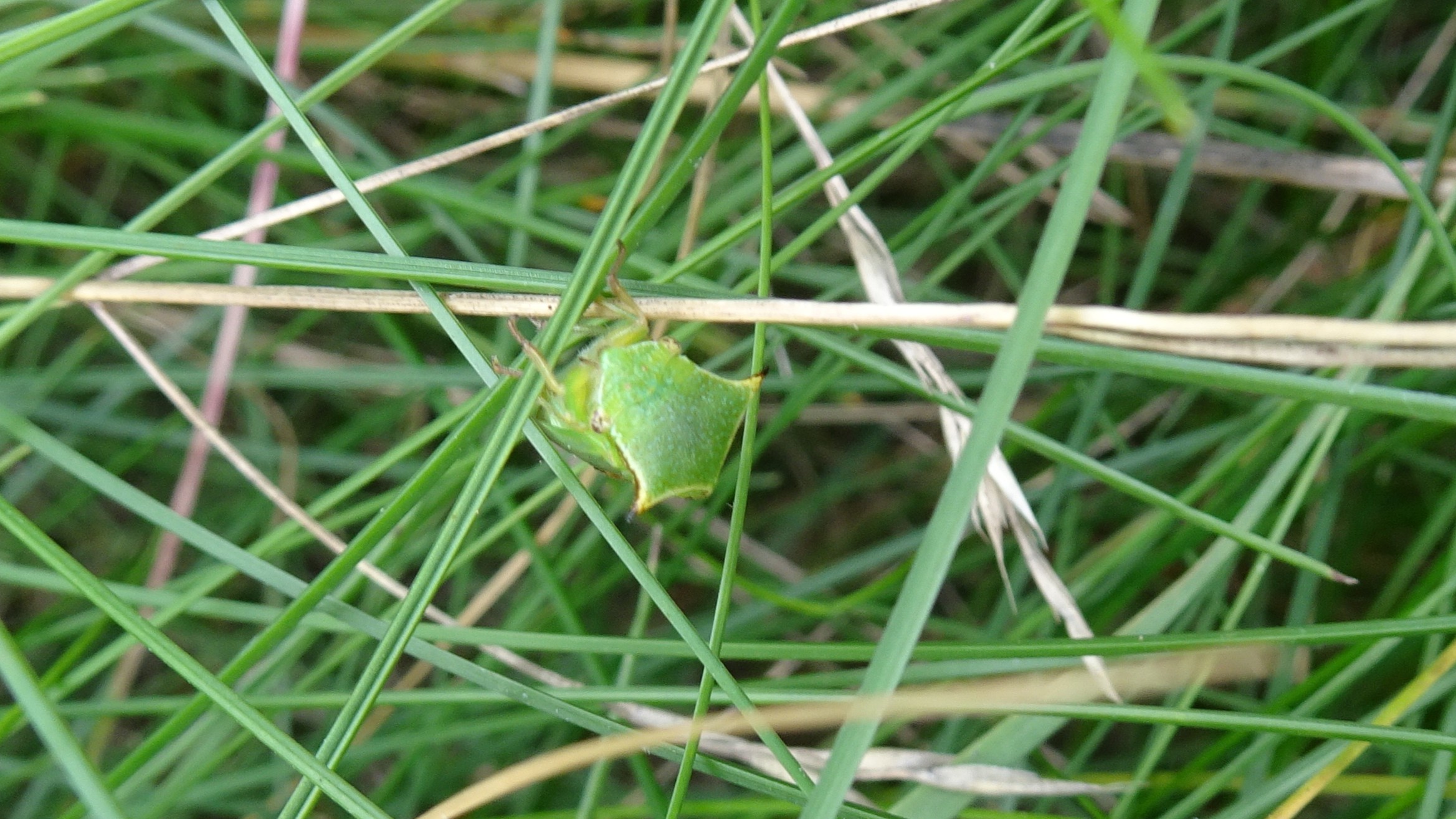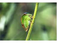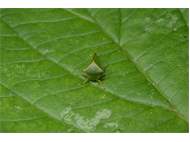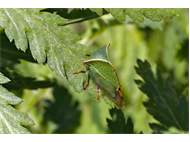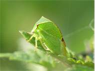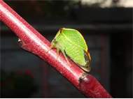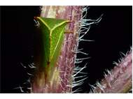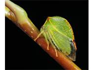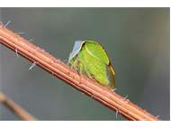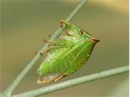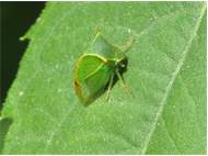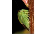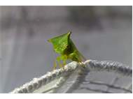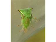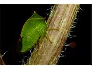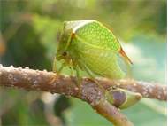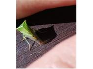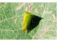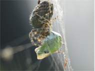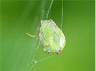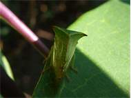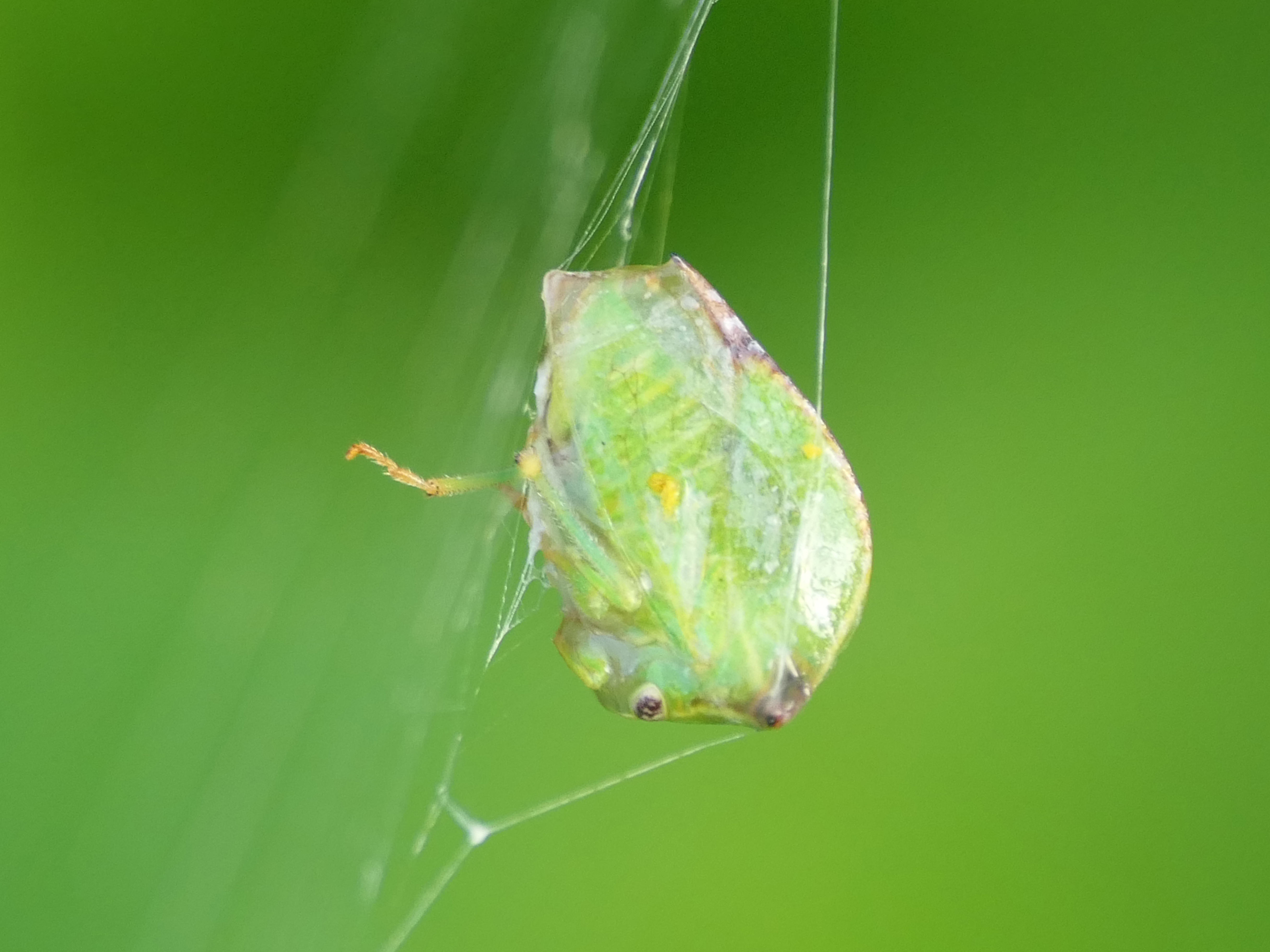 Büffelzikade, Stictocephala bisonia, als Beute einer Spinne auf einem Himbeerstrauch, Leipzig, Ortsteil Thekla, Sep. 2012 (© Victor Weiler)( Bild vergrößern)